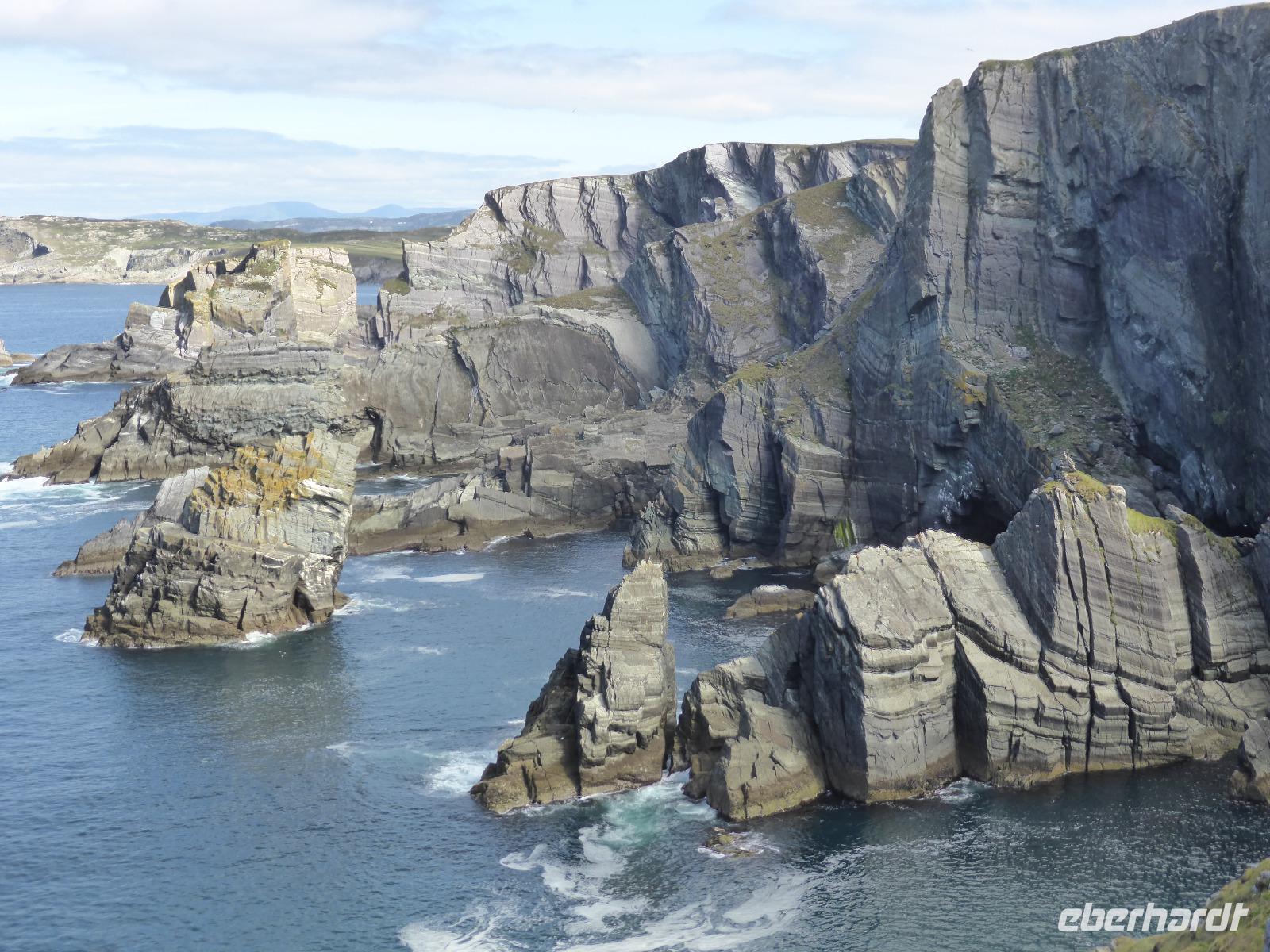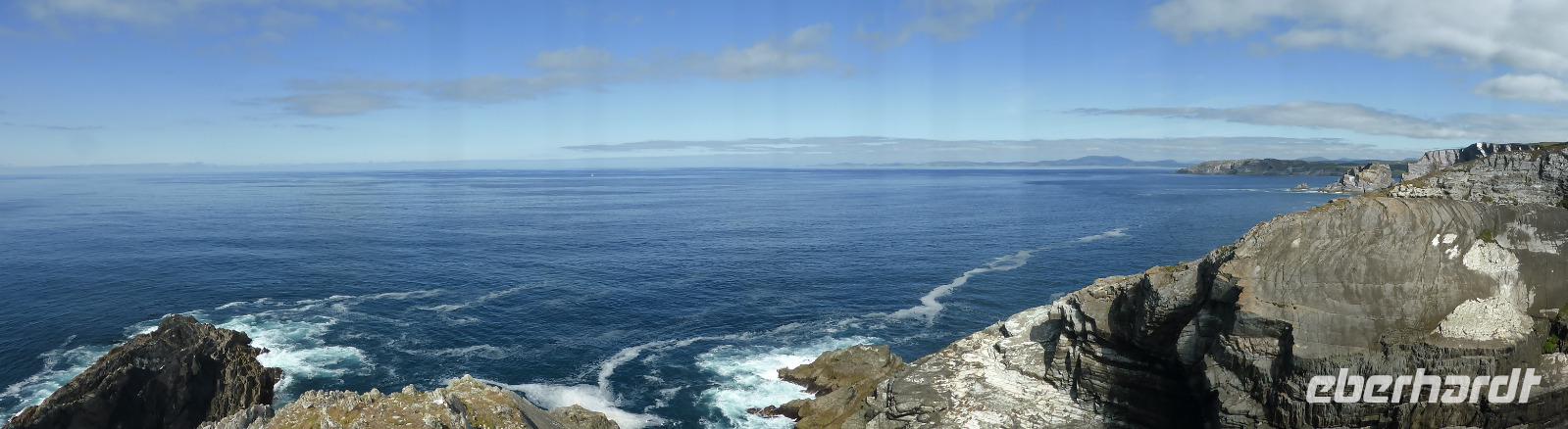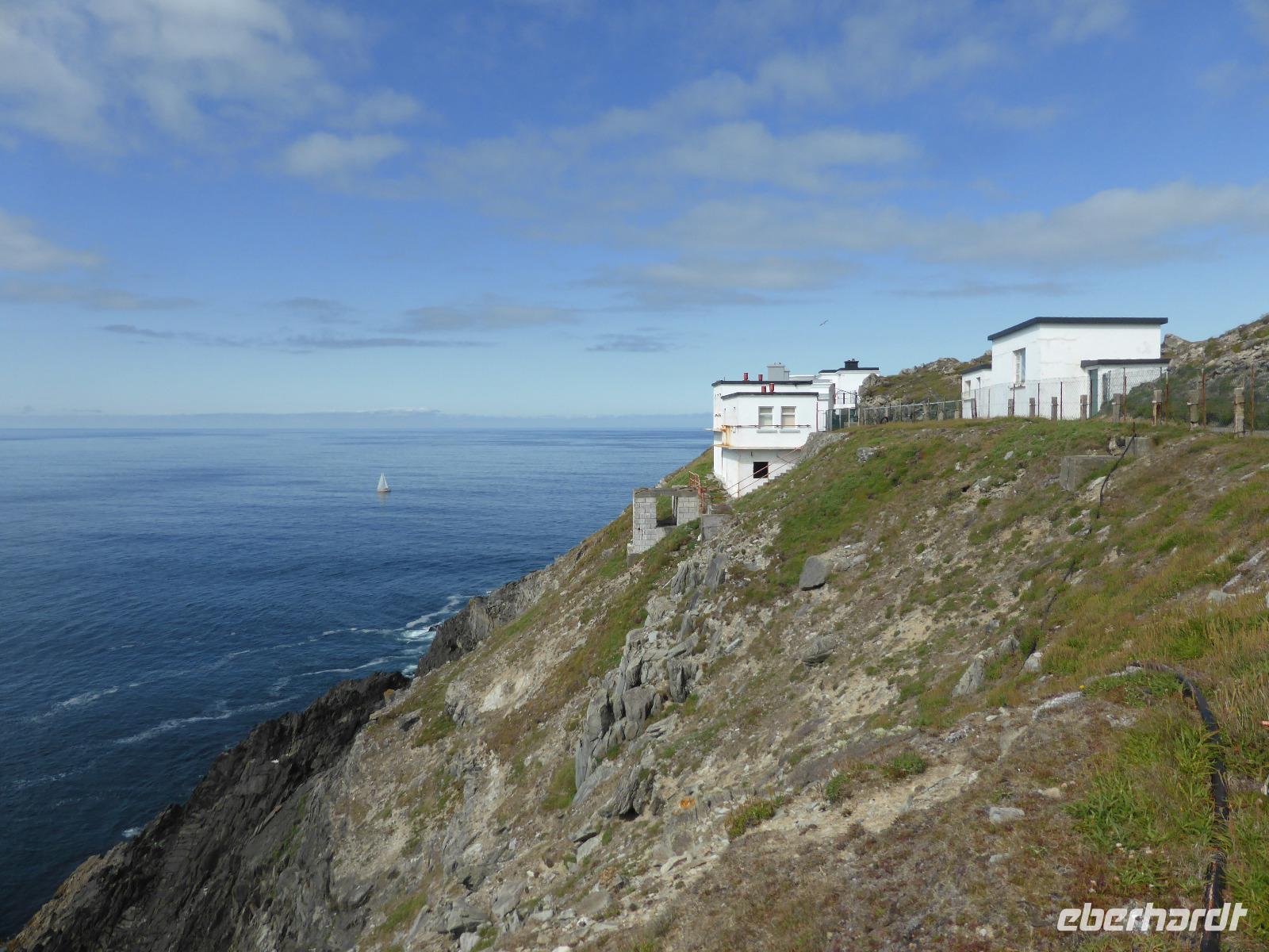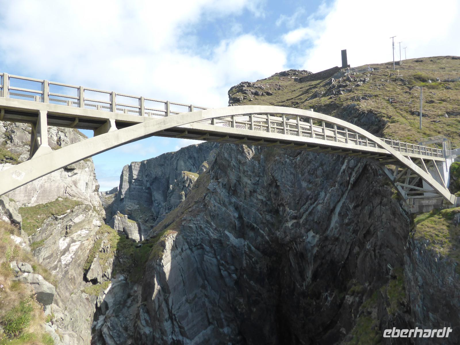 Heute stand der letzte „Finger" der südwestlichen Halbinseln Irlands - Mizen Head - auf dem Programm. Über Skull gelangten wir auf sehr engen Straßen zum Parkplatz am Mizen Head. Zum Glück waren wir sehr zeitig da, sodass wir noch ohne Probleme unseren Bus drehen konnten. Später wäre dies aufgrund der zahlreichen Autos und Fahrradfahrer nicht mehr möglich gewesen. Mizen Head besticht durch seine spektakuläre Landschaftsszenerie - schroffe Felsen und Klippen mit wunderschönen Blicken auf die Küste. Mit etwas Geduld konnten wir sogar Delphine vor der Küste springen sehen. Nach dem Besucherzentrum erschließen vier Wege die einzelnen Aussichtspunkte. Über die neue Brücke von 2011 konnten wir die alte Signalstation erreichen. Diese Station wird heute als Ausstellungsraum für Flora und Fauna sowie Leuchttürme Irlands genutzt.