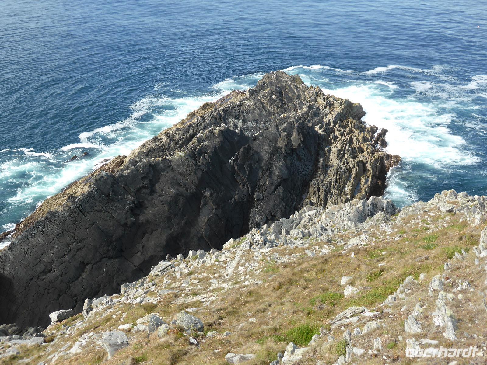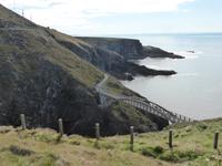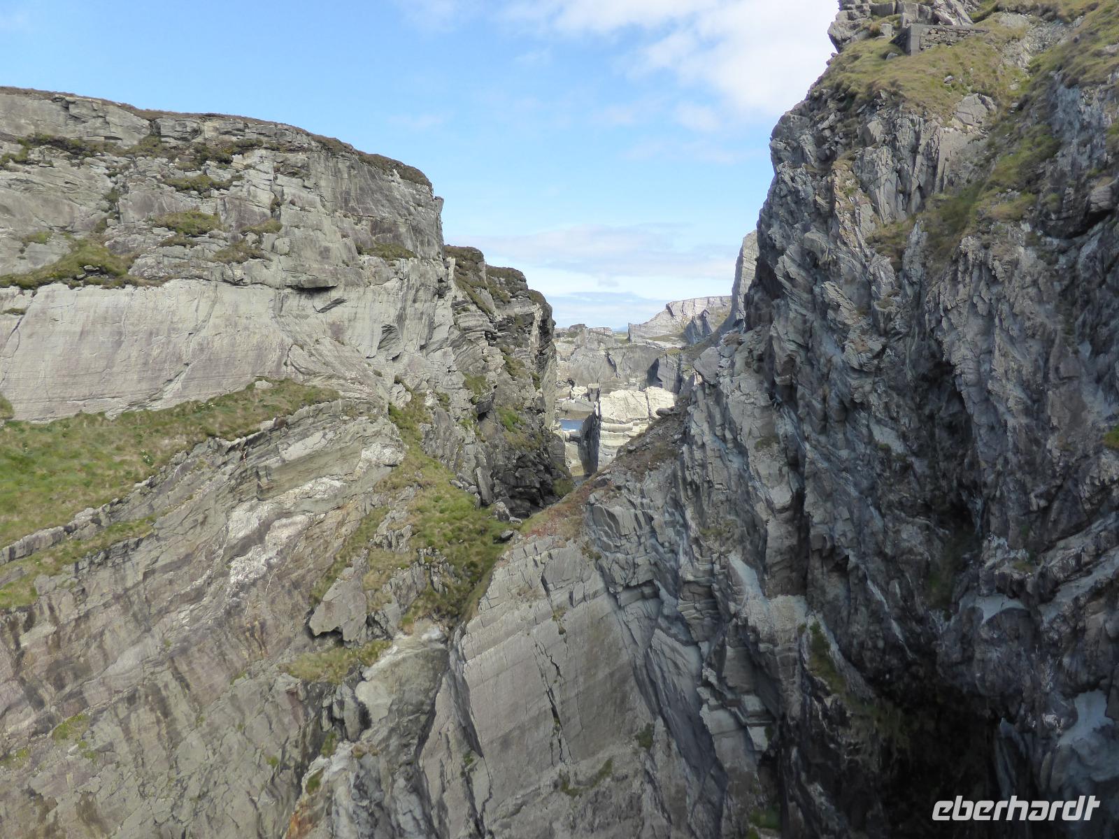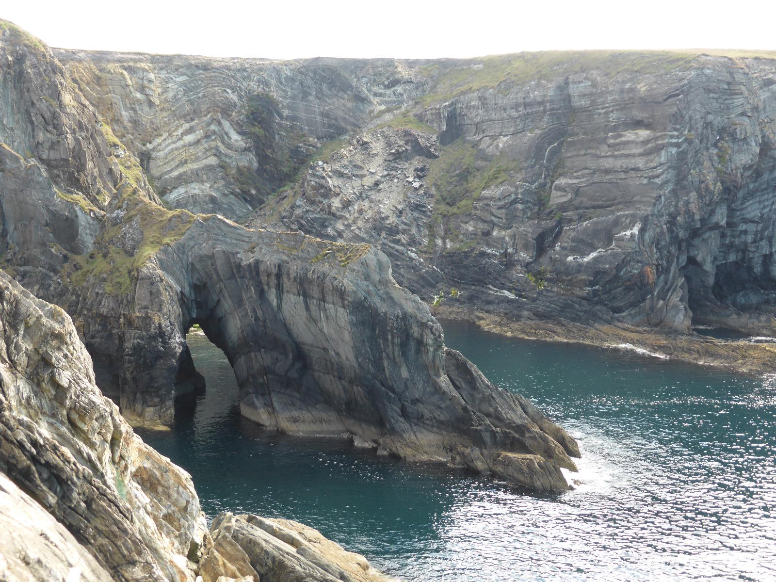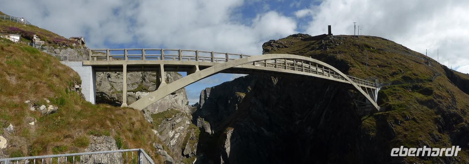 Heute stand der letzte „Finger" der südwestlichen Halbinseln Irlands - Mizen Head - auf dem Programm. Über Skull gelangten wir auf sehr engen Straßen zum Parkplatz am Mizen Head. Zum Glück waren wir sehr zeitig da, sodass wir noch ohne Probleme unseren Bus drehen konnten. Später wäre dies aufgrund der zahlreichen Autos und Fahrradfahrer nicht mehr möglich gewesen. Mizen Head besticht durch seine spektakuläre Landschaftsszenerie - schroffe Felsen und Klippen mit wunderschönen Blicken auf die Küste. Mit etwas Geduld konnten wir sogar Delphine vor der Küste springen sehen. Nach dem Besucherzentrum erschließen vier Wege die einzelnen Aussichtspunkte. Über die neue Brücke von 2011 konnten wir die alte Signalstation erreichen. Diese Station wird heute als Ausstellungsraum für Flora und Fauna sowie Leuchttürme Irlands genutzt.