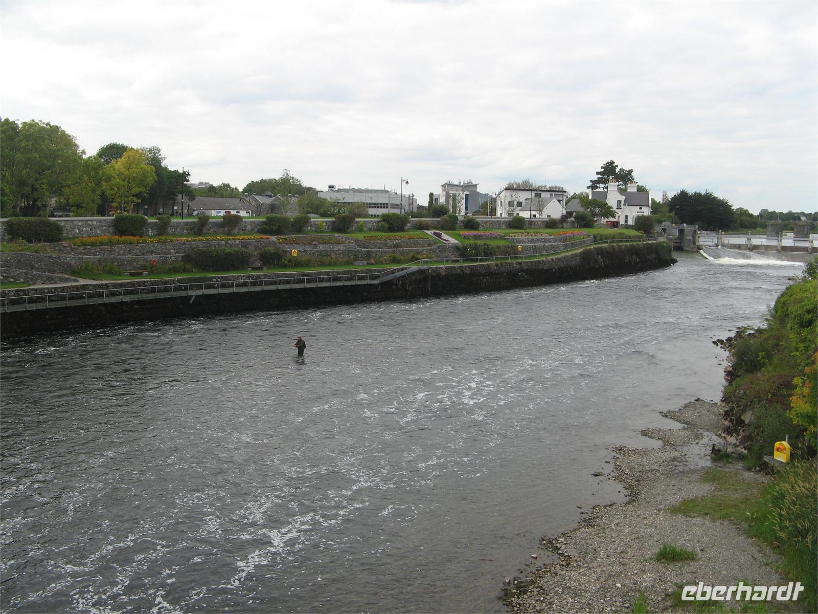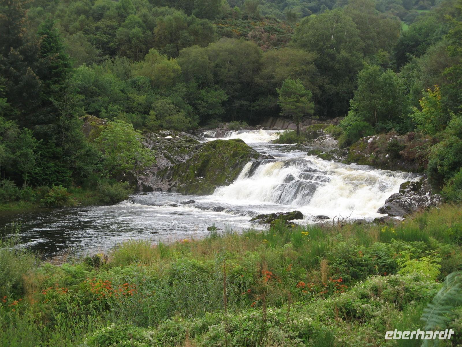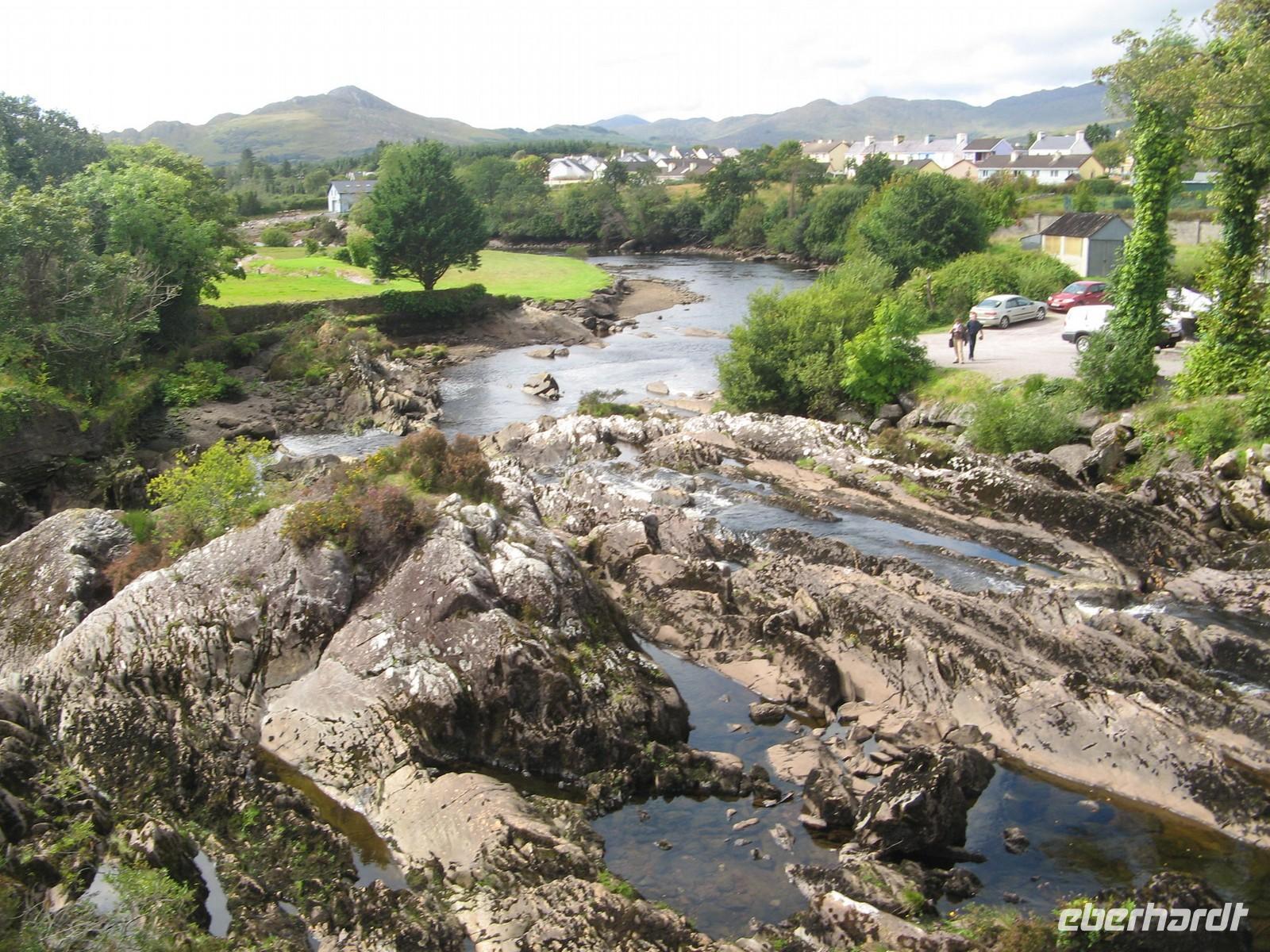 Erst einmal statteten wir Westport einen Besuch ab, eine der wenigen planmäßig angelegten Städte des Landes. Die Fahrt ging durch das Doo Lough Valley, auch Tal von Delphi genannt, vorbei an den Mwellrea Mountains. Hier halten sich in der Einsamkeit immer viele Angler auf, zum Angeln von Lachsen und Forellen. Am Killary Harbour vorbei, dem einzigen Fjord Irlands, machten wir erst einmal eine Mittagspause am Aasleagh-Wasserfall um die Produkte unserer Bordküche zu genießen.
