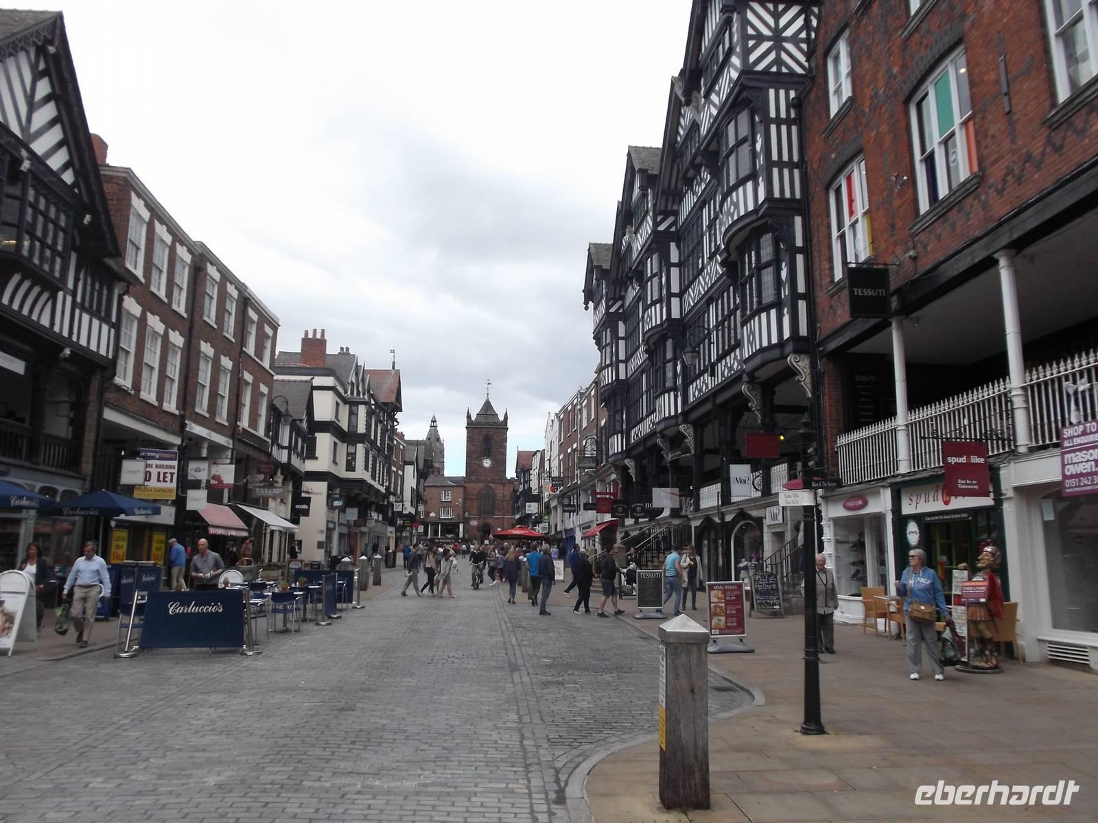 Pünktlich erreichte unser Fährschiff an diesem Morgen Kingston upon Hull, die meist kurz „Hull" genannte Hafenstadt am Mündungstrichter des River Humber. Ein wenig dauerten Au-Checken und Grenzkontrollen noch, ehe wir kurz nach halb neun Uhr Ortszeit loskamen und auf der langen Strecke nach Wales die Industriegebiete um Leeds und Manchester in Mittelengland durchquerten. Am nordwestlichsten Punkt von Wales, im Hafen von Holyhead, würde nachmittags unsere Fähre nach Irland ablegen. Da wir aber noch etwas Zeit hatten, konnten wir als „Richtig-reisen-Extra" einen Stopp noch kurz vor der walisischen Grenze einbauen. Die Stadt Chester gehört zu den wunderbaren englischen Fachwerk-Städten und ist immer einen Abstecher wert! Manche bezeichnenden Ort als eine der schönsten Städte Englands und dass man hier auf Traditionen setzt, konnten wir bei einem kleinen Stadtbummel zum alten Marktkreuz erleben: Im Sommer wird man hier nämlich zur Mittagszeit vom historisch kostümierten Marktschreier von Chester empfangen - mit Glockenschlag 12.00 Uhr schwenkt er seine „Ausrufer-Glocke", begrüßt die Gäste seiner Stadt und hält humorige kleine Vorträge und Einlagen bereit. Auch dieses mal konnten wir wieder ein paar Minuten lang britischen Humor vor der einzigartigen Kulisse der Fachwerkstraßen Chesters erleben.