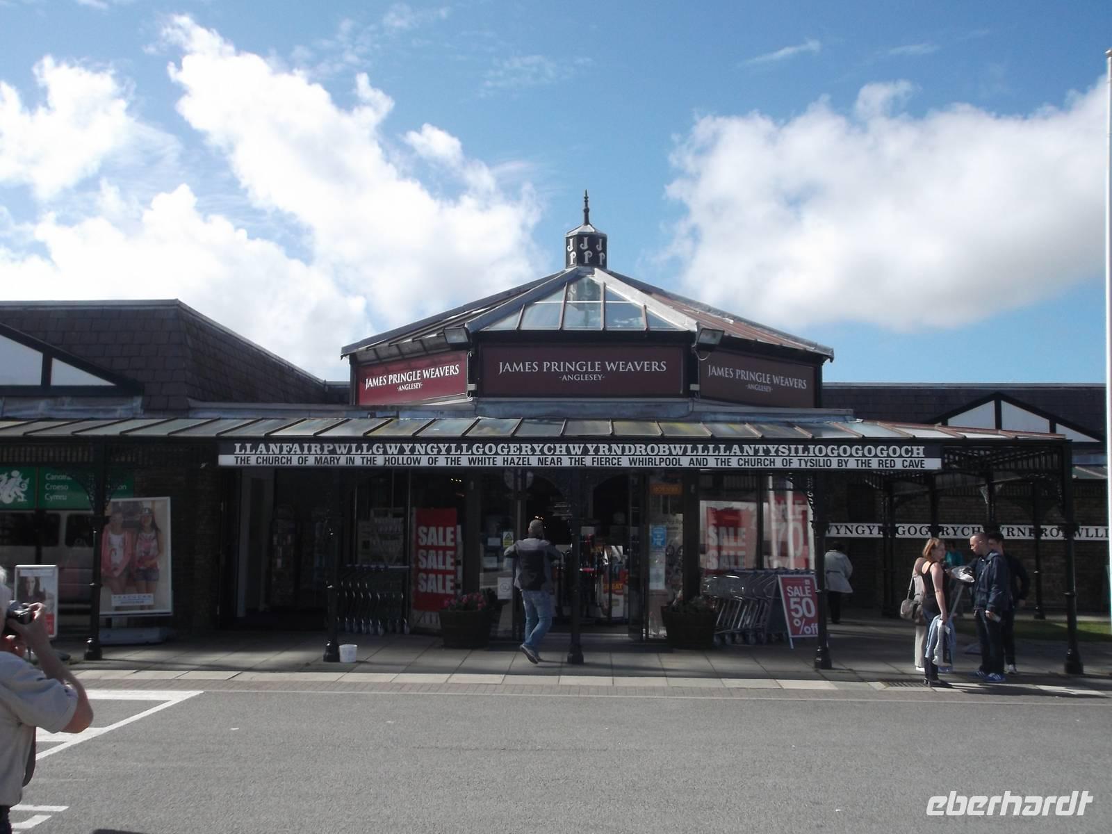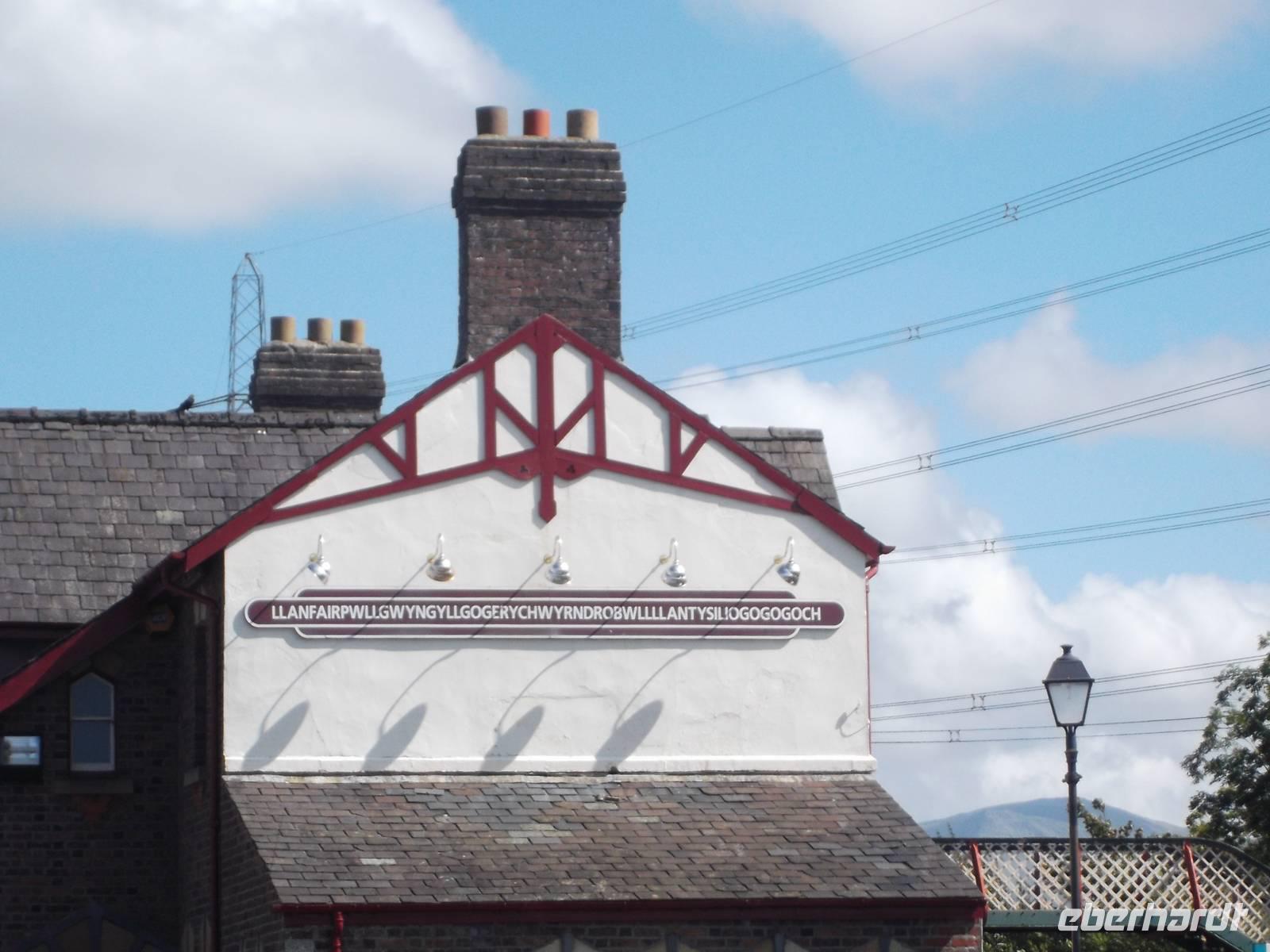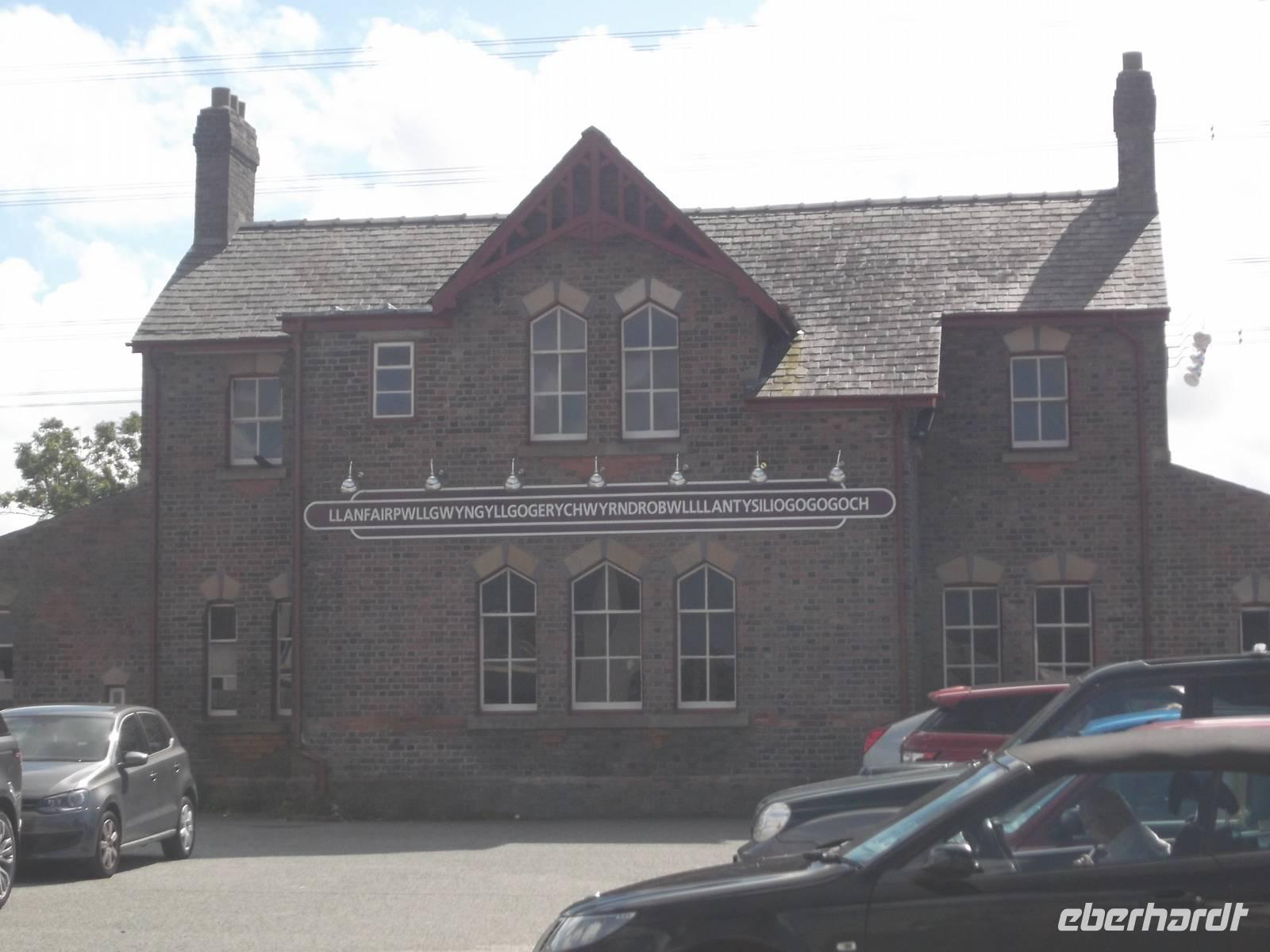 Bei unserem weiteren Weg zum Hafen nach Irland fuhren wir später auf die walisische Insel Anglesey. Ein kurzer Fotostopp zeigte uns einen Aussichtspunkt über die malerische Meerenge Menai-Strait, die Anglesey von Festland-Wales trennt. Gleich daneben liegt ein winziges, eigentlich unbedeutendes Städtchen: touristisch bekannt ist Llanfair PG für den längsten Ortsnamen Europas. Der steht sowohl am Besucherzentrum als auch an der Eisenbahnstation und lautet Llanfairpwllgwyngyllgogerychwyrndrobwllllantysiliogogogoch.
