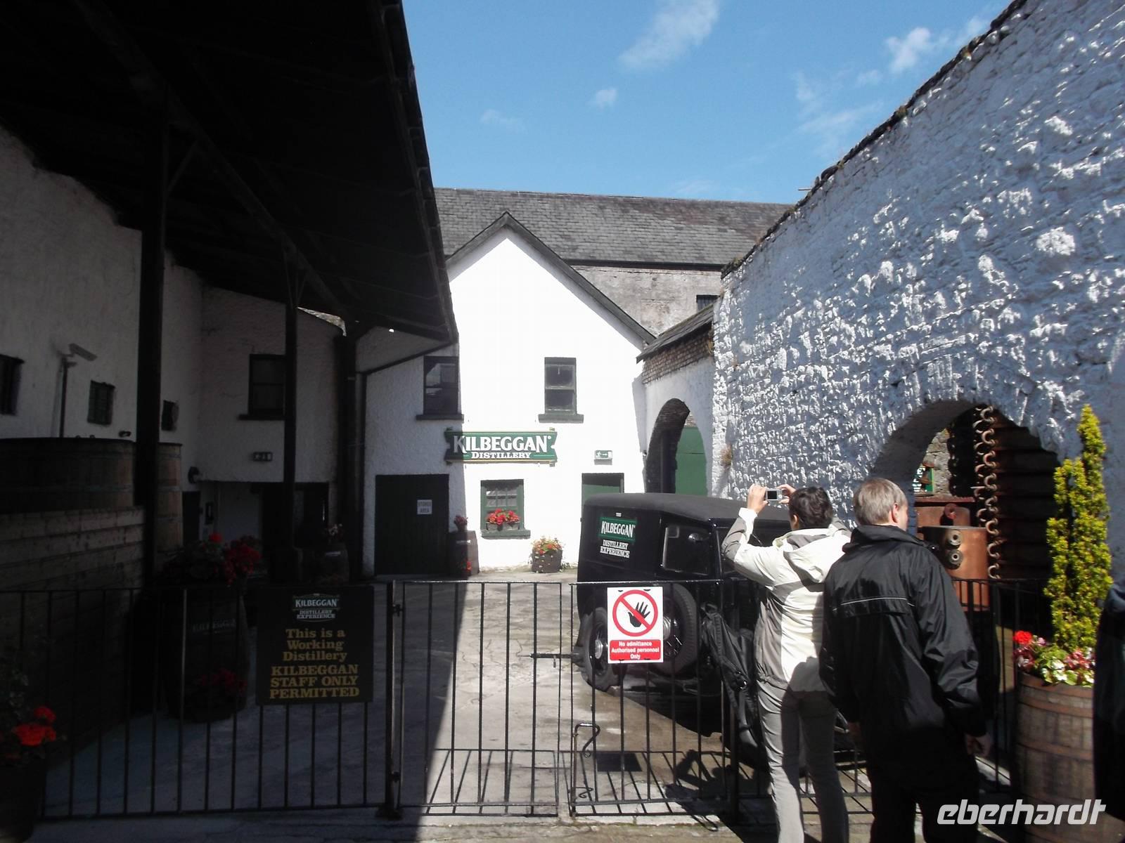 Später trafen wir uns dann wieder am Bus, um Dublin zu verlassen und unsere Reise fortzusetzen: Auf der neugebauten Autobahn fuhren wir Richtung Westen und verließen sie nahe der als „Whiskeystadt" bekannten Kleinstadt Kilbeggan. Hier gab es eine der ältesten und traditionsreichsten Destillen Irlands, die Mitte des 18. Jahrhunderts von der Familie Locke übernommen worden war und daher heute als Locke's Whiskey-Museum gilt. Zwar war die Brennerei lange Zeit stillgelegt, produziert aber seit 2007 wieder den bekannten Kilbeggan whisky mit einem restaurierten Destillierapparat, der damit der älteste noch in traditionellem Stil in Irland betriebene Brennkolben ist. Natürlich konnten wir einen leckeren Schluck des in Irland dreimal - statt wie in Schottland nur zweimal - destillierten Lebenswassers verkosten und wer wollte, konnte natürlich auch eine Flasche des edlen Getränks für späteren Gebrauch erwerben...
