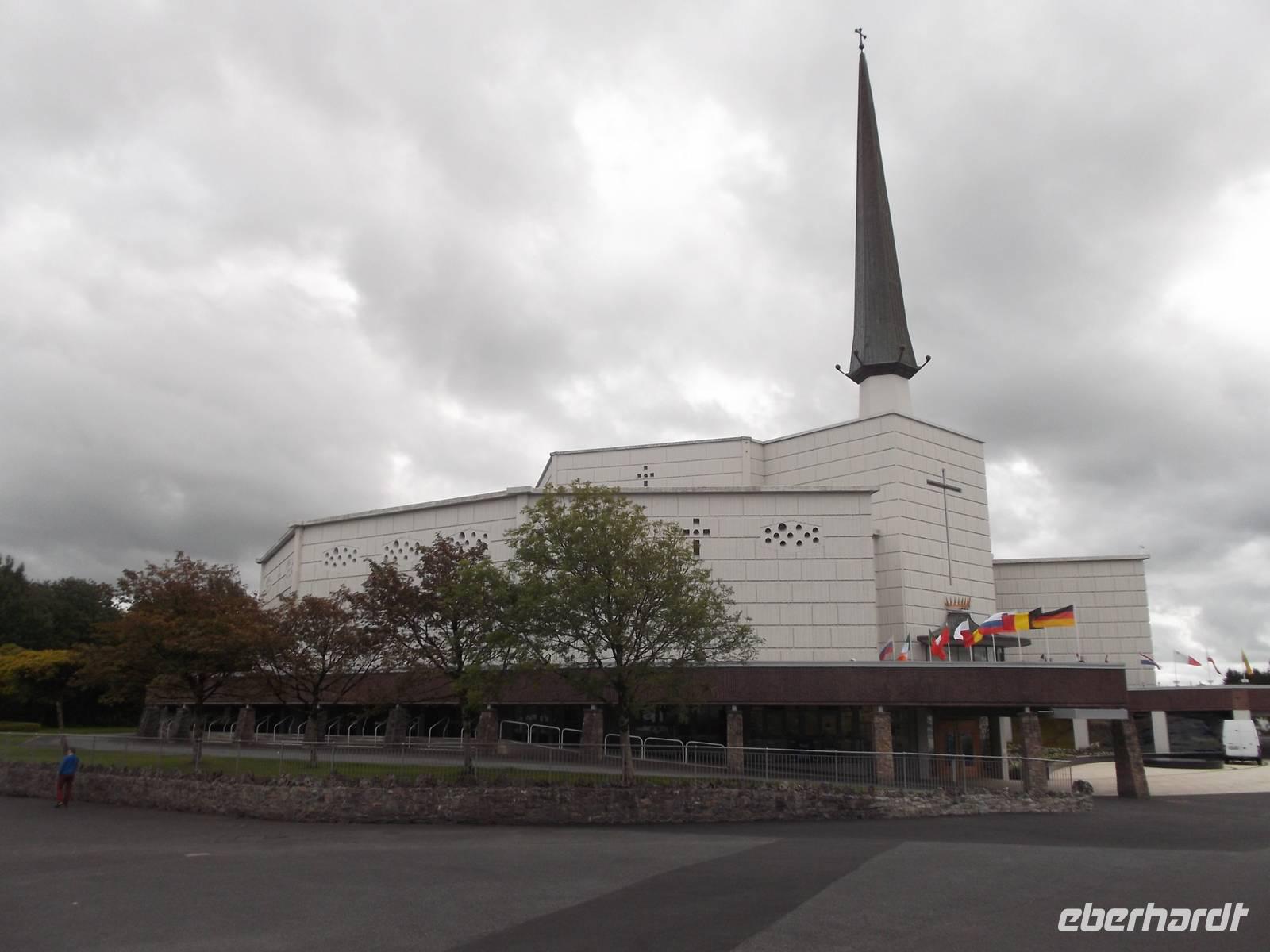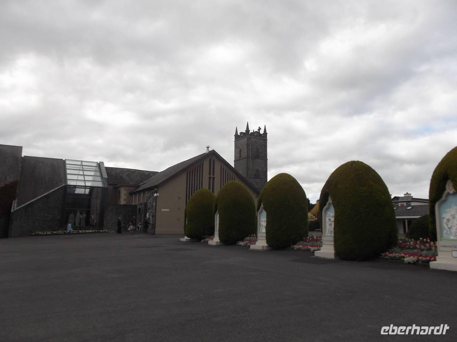 Später ging es weiter zu unserem Übernachtungsort Ballina in der Grafschaft Mayo, aber wir konnten als Extra noch einen Abstecher nach Knock einbauen. Das ist Irlands bedeutendster Wallfahrtsort, religiös bedeutsam durch seine Marienerscheinungen im vorigen Jahrhundert. Seither kommen jährlich zehntausende Gläubige und Heilungsbedürftige aus ganz Irland und aller Welt hierher zu einer Wallfahrt. Das weitläufige Gelände wie auch die in den 70er Jahren des 20. Jh. errichtete gewaltige Beton-Basilika lassen erahnen, welche Massen von Wallfahrern hier zusammen kommen können.