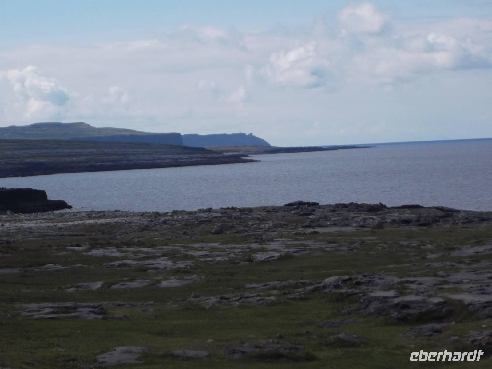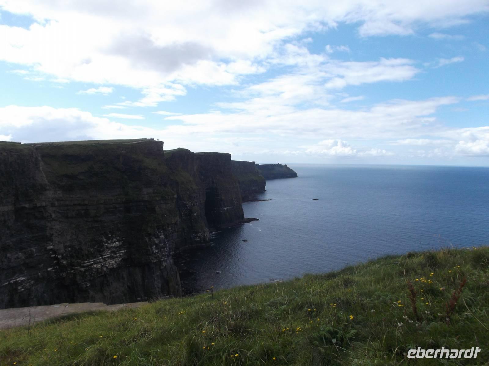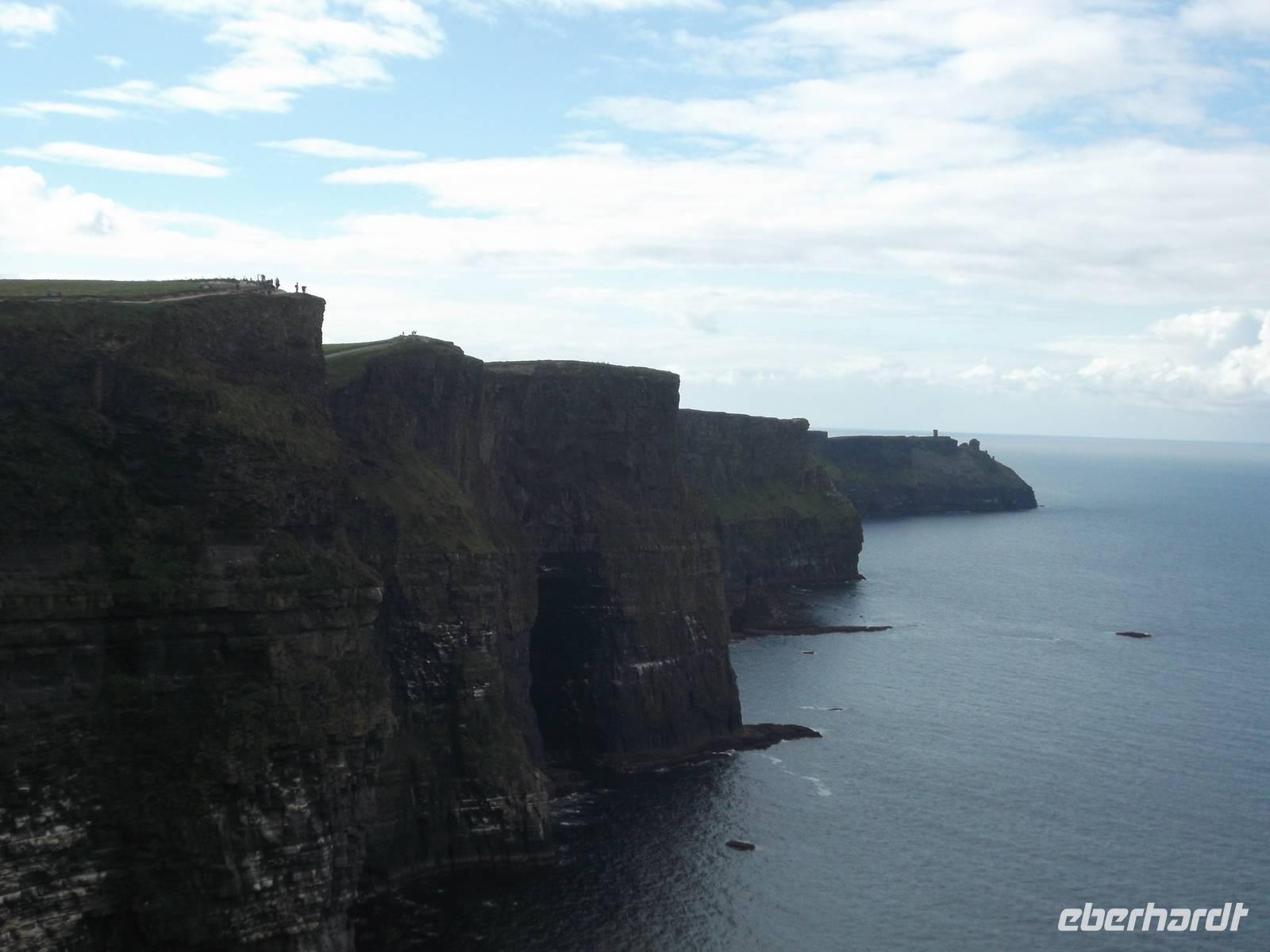 Auf unserem weiteren Weg durch Burren erreichten wir bei Ballyvaughn die Küste und umrundeten wir auf der malerischen Küstenstraße den Slieve Elva, die höchste Erhebung des Burren, um an einer der größten irischen Sehenswürdigkeiten - an den Cliffs of Moher - zu enden. Irlands bekannteste Steilklippen ragen nahezu senkrecht aus dem Atlantischen Ozean. Der Küstenabschnitt, der sich über eine Länge von über acht Kilometern erstreckt, sieht die Klippen eine Höhe von ungefähr 120 m am südlichen Ende, nördlich des O'Brien's Tower sogar 214 m erreichen.