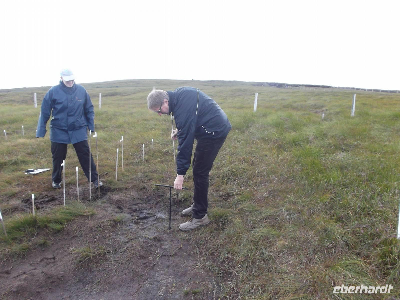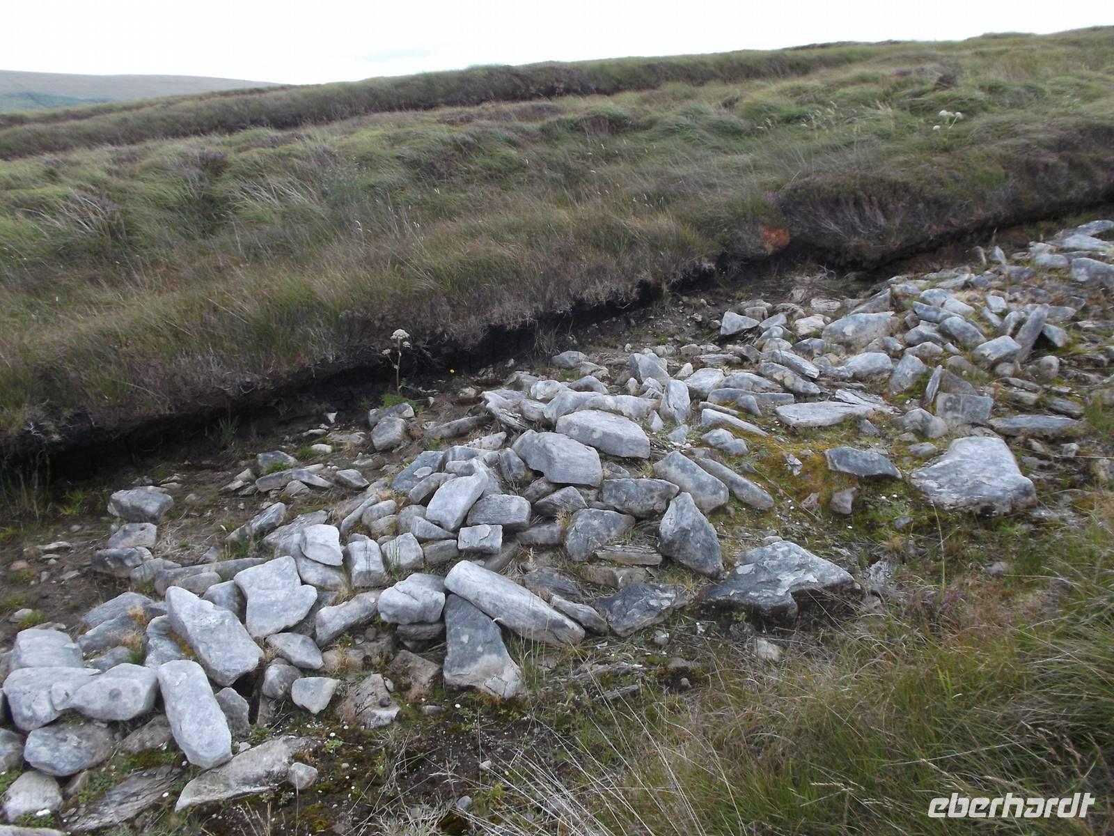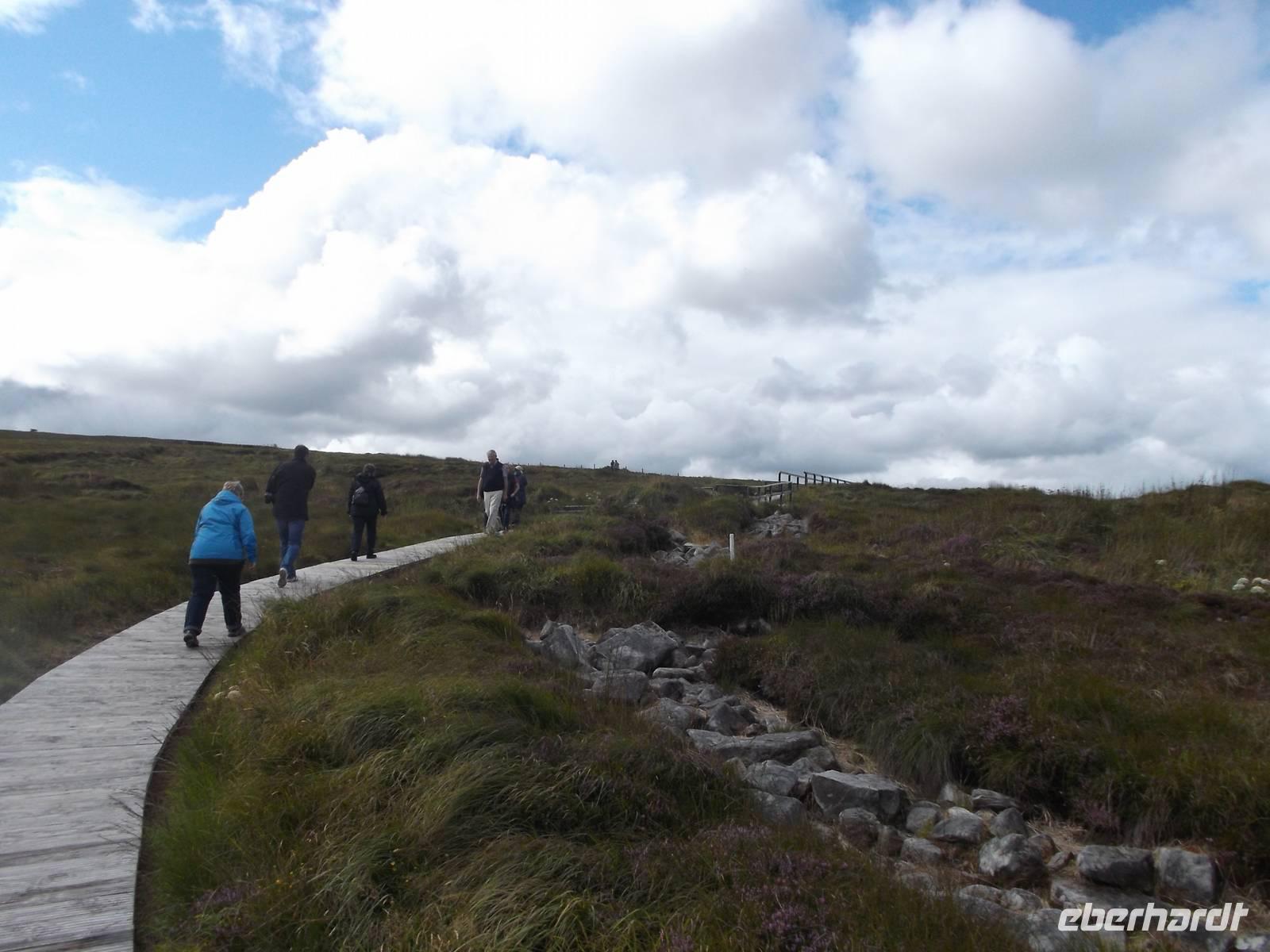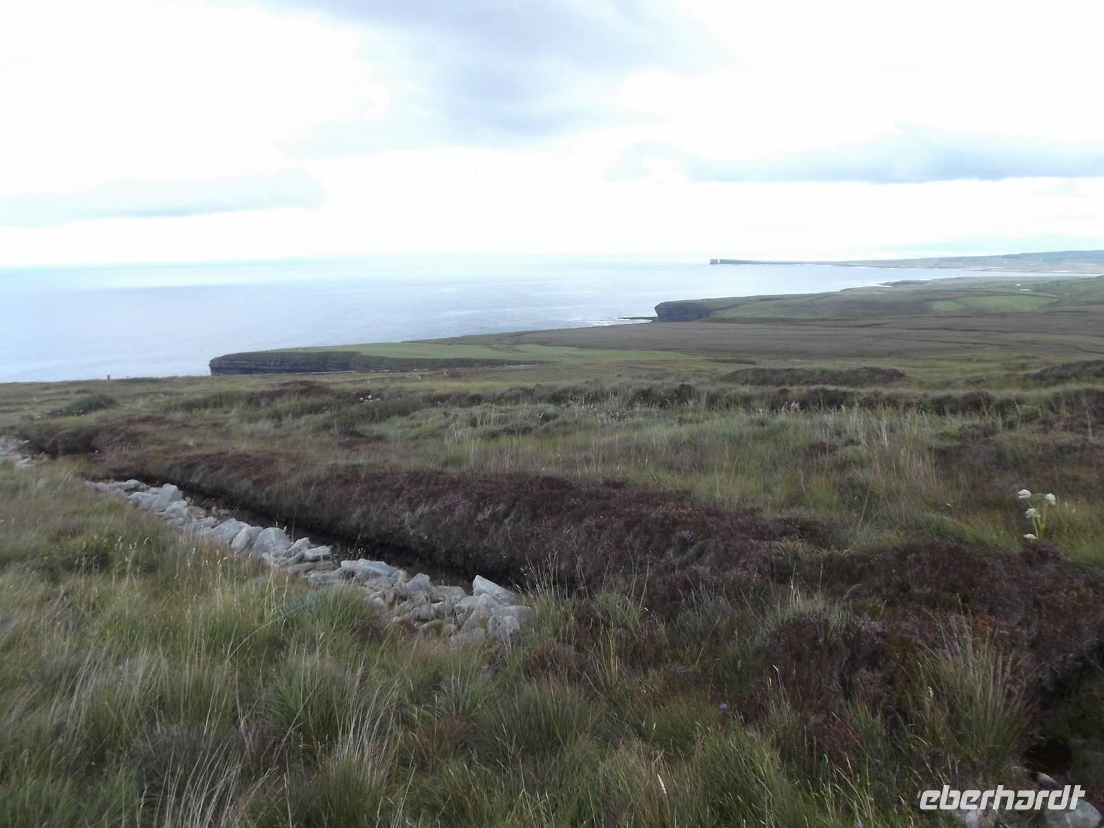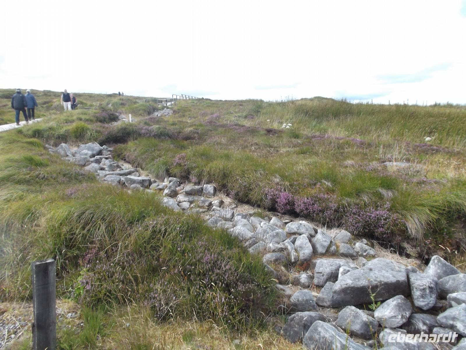 Wesentlich älter als diese Rundbauten, die man seit dem 6. nach-christlichen Jahrhundert erbaute, sind die steinzeitlichen Zeugnisse Irlands. Neben Steinkreisen und den berühmten Ganggräbern ist hier eines besonders hervorzuheben: das Feldsystem von Céide Fields. Schon in den dreißiger Jahren des vorigen Jahrhunderts entdeckte man beim Torfstechen regelmäßig verlaufende Mauerreste unter den Torfschichten. Inzwischen stellten sich diese als Überbleibsel einer mehrere tausend Jahre alten steinzeitlichen Siedlung heraus. Jungsteinzeitliche Bauern lebten hier in Einzelgehöften als Ackerbauern und Viehzüchter und teilten das teilweise offenbar durch Rodungen gewonnene Bauernland untereinander durch gerade verlaufende Mauern untereinander auf. Sowohl Reste der Wohnanlagen als auch der Trennmauern wurden inzwischen freigelegt oder werden - da die einstige Siedlung gewaltige Ausmaße hatte - mit bis zu vier Meter langen Bohrstangen zerstörungsfrei sondiert. Bei einer Führung konnten wir nicht nur verschiedenste Mauerreste entdecken, sondern auch einen Einblick in die Arbeit der Archäologen gewinnen und uns einen Überblick über die Ausmaße dieser bedeutenden Ausgrabung verschaffen.