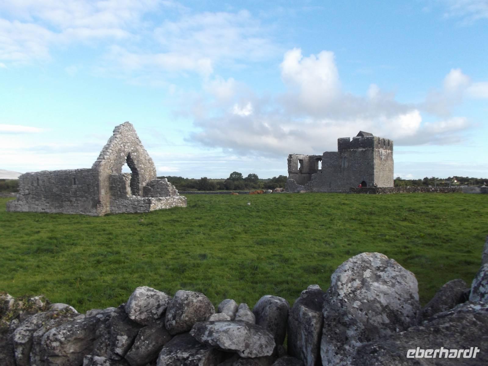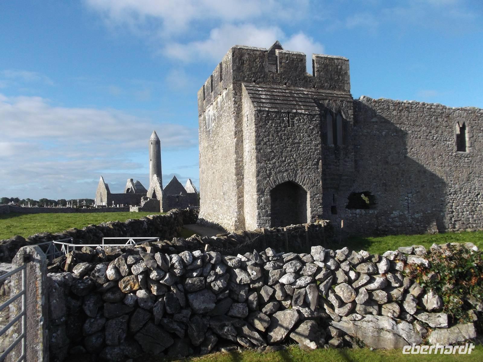 Heute früh erwartete uns die erste Attraktion unweit von Gort. Die alte Klostersiedlung Kilmacduagh, eine der malerischsten Klosteranlagen im Land, soll im 7. Jh. gegründet worden sein. Zeitweise gab es hier einen Bischofssitz - immerhin bekommt die Kirchenruine daher den Rang einer Kathedrale - dessen frühester Teil im 11. Jahrhundert erbaut wurde. Der Blickfang der gesamten Anlage ist jedoch der (schiefe) Rundturm, einer der am besten bewahrten in Irland. Bei knapp 30 m Höhe weist er eine Abweichung von 60 cm aus der Senkrechten auf. Obwohl das einst reiche Kloster mit mehreren Kirchemn und Kapellen versehen, im Laufe der Jahrhunderte immer wieder - vor allem von Wikingern und Normannen - geplündert wurde, war es doch bis ins 19. Jh. im Wechsel mit dem nicht weit entfernt gelegenen Kilfenora Bischofssitz. .