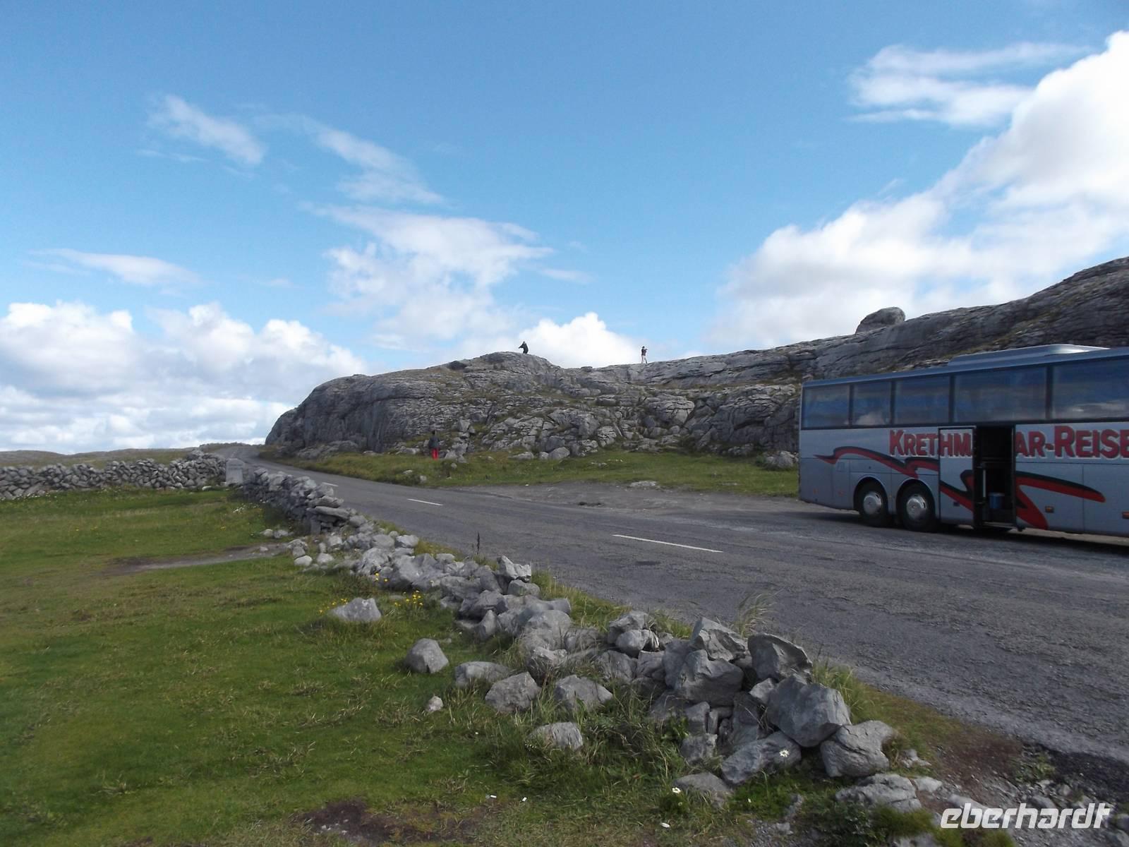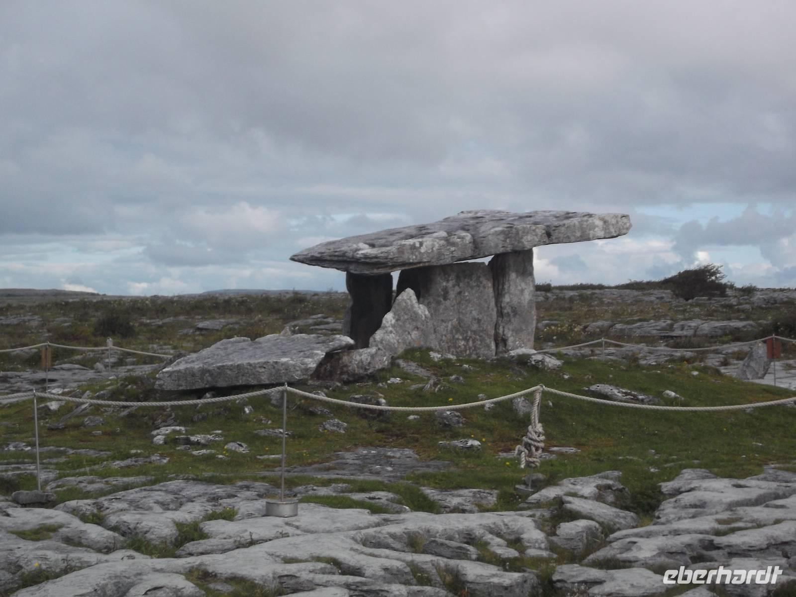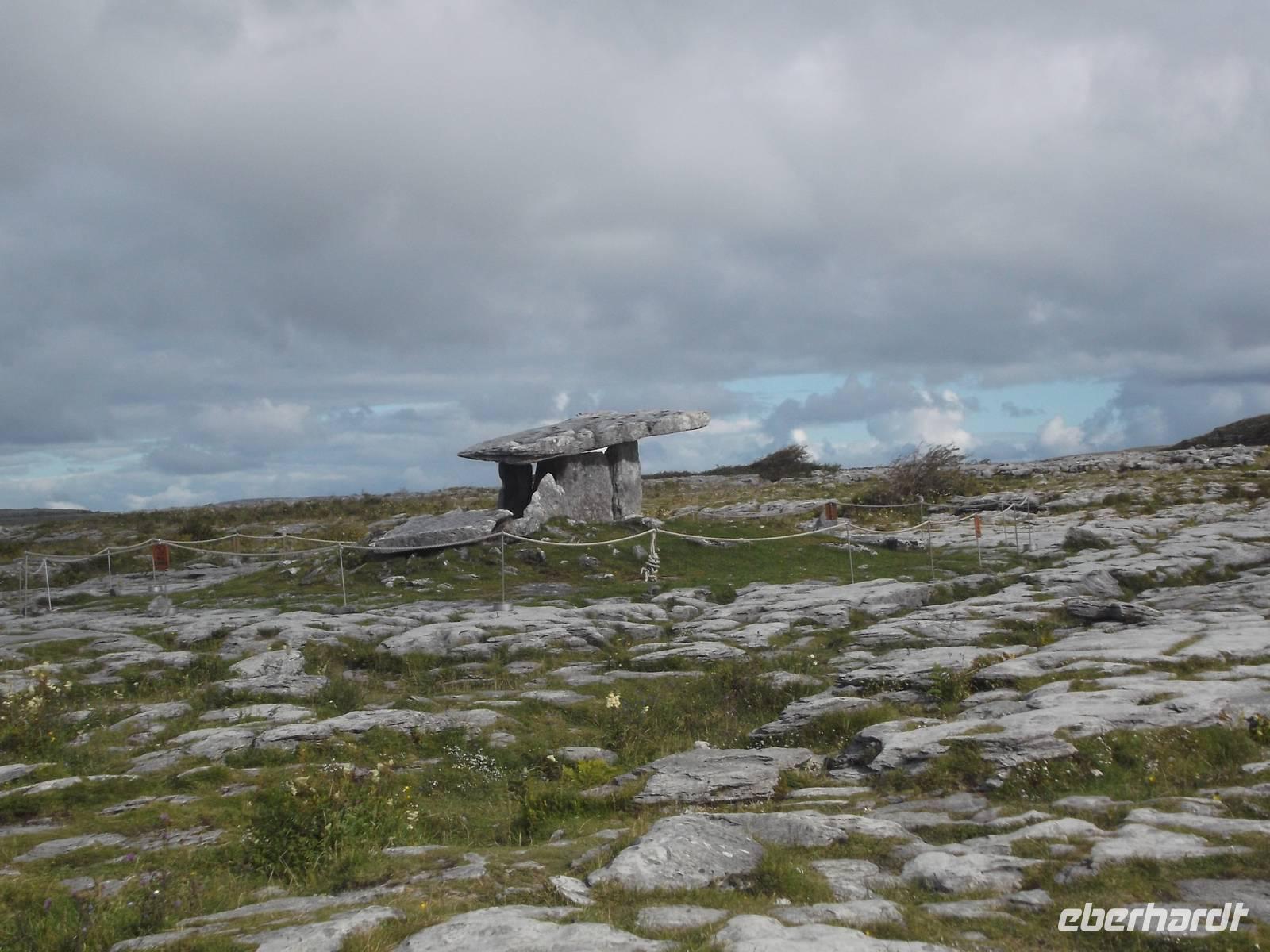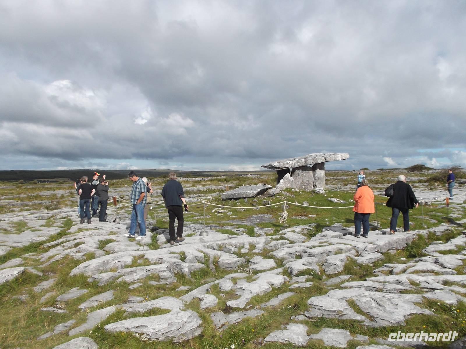 Nach ausgiebigem Fotostopp in Kilmacduagh wandten wir uns der „Steinöde" des Burren zu, einer einzigartigen Karstlandschaft von über 250 km² Ausdehnung. Die Oberfläche dieses Gebietes ist durch gewaltige Verwitterungserscheinungen geprägt und zumeist durch tausende etwa knietiefe Gräben, die „Grykes", in rechteckige Felder gegliedert. Oberflächenwasser, das sich auch heute noch nach starkem Regen in Teichen, sogenannten Turloughs sammelt, hat in Jahrhunderten hier den Kalk des Gebirgsgesteins nach und nach aufgelöst. Horizontal haben sich Platten durch Klüftung, als sogenannte „Clints", voneinander abgespalten, was das Laufen über das Plateau mit seinen sich leicht bewegenden Platten, die sich von ihrer Auflage gelöst haben, gefährlich und abenteuerlich macht. Viele der losen Kalksteinplatten wurden seit der Steinzeit schon zum Bau der älteren Steindenkmäler verwendet. Bekanntestes Paradebeispiel ist der Pulnabrone Dolmen, ein steinzeitliches Grab aus Kalksteinplatten.