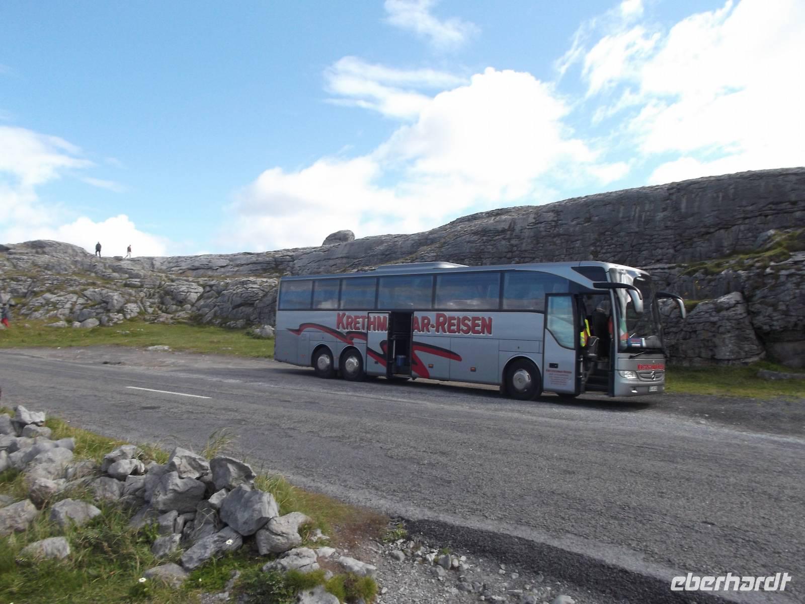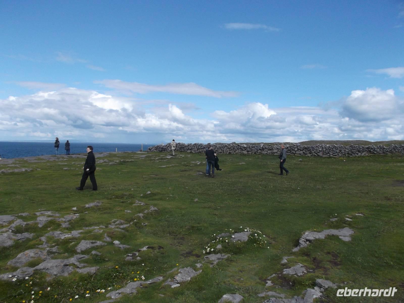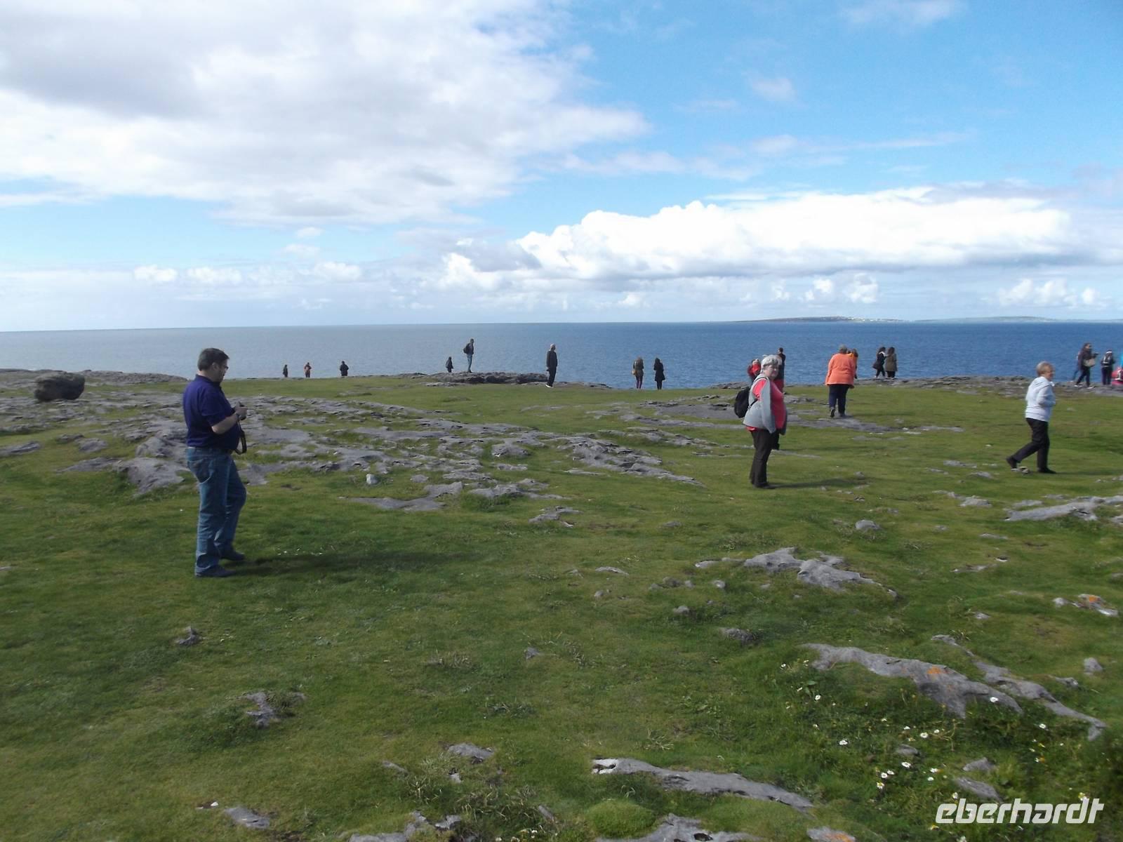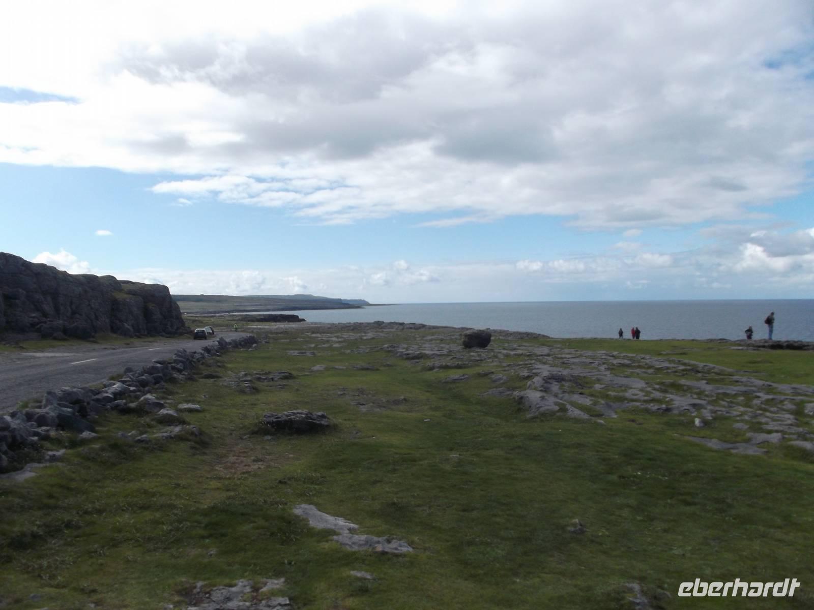 Nach ausgiebigem Fotostopp in Kilmacduagh wandten wir uns der „Steinöde" des Burren zu, einer einzigartigen Karstlandschaft von über 250 km² Ausdehnung. Die Oberfläche dieses Gebietes ist durch gewaltige Verwitterungserscheinungen geprägt und zumeist durch tausende etwa knietiefe Gräben, die „Grykes", in rechteckige Felder gegliedert. Oberflächenwasser, das sich auch heute noch nach starkem Regen in Teichen, sogenannten Turloughs sammelt, hat in Jahrhunderten hier den Kalk des Gebirgsgesteins nach und nach aufgelöst. Horizontal haben sich Platten durch Klüftung, als sogenannte „Clints", voneinander abgespalten, was das Laufen über das Plateau mit seinen sich leicht bewegenden Platten, die sich von ihrer Auflage gelöst haben, gefährlich und abenteuerlich macht. Viele der losen Kalksteinplatten wurden seit der Steinzeit schon zum Bau der älteren Steindenkmäler verwendet. Bekanntestes Paradebeispiel ist der Pulnabrone Dolmen, ein steinzeitliches Grab aus Kalksteinplatten.