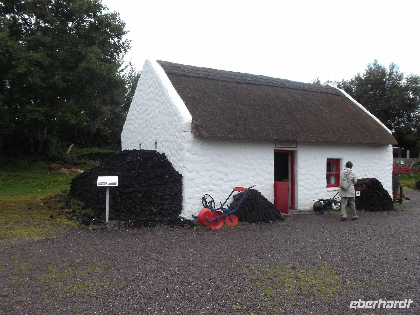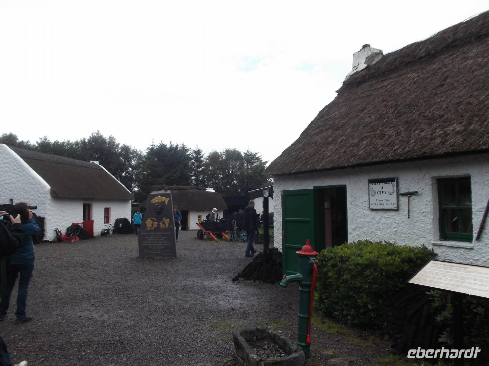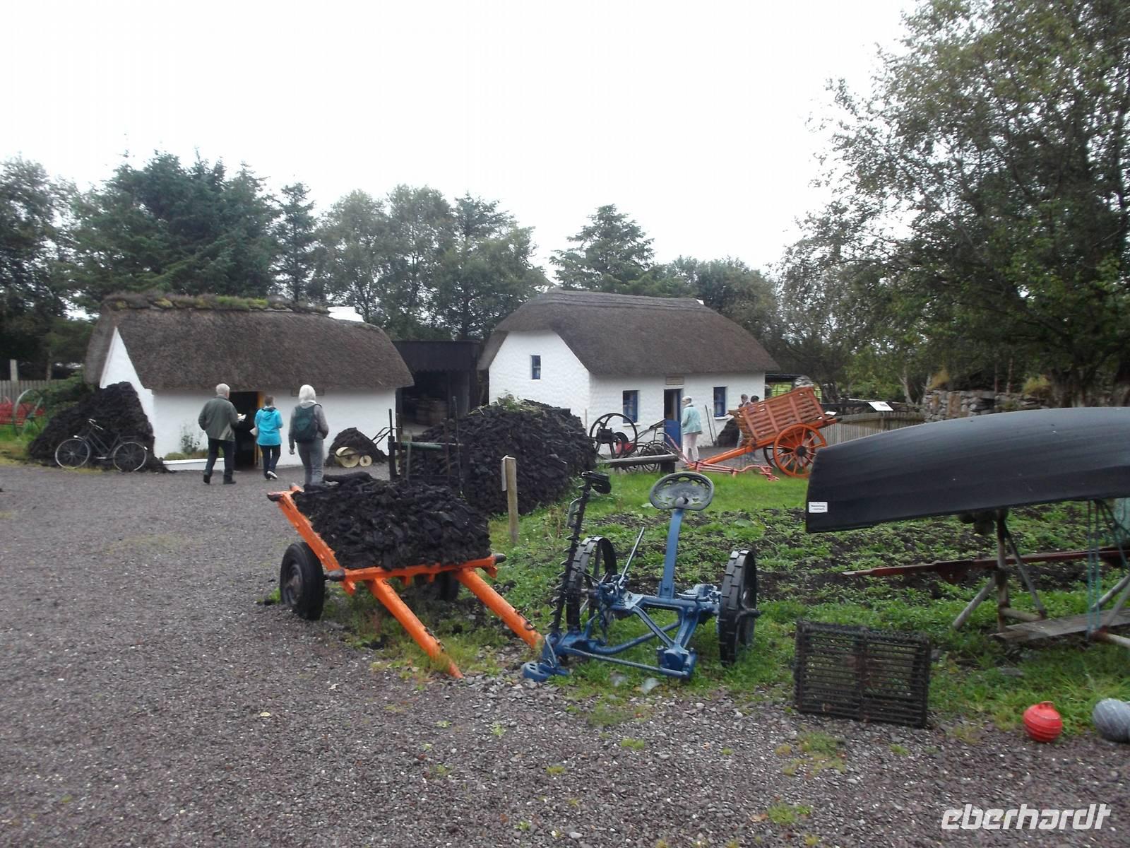 Den ersten Stopp legten wir ein im letzten in Irland erhaltenen „bog village", einem Torf-Dorf. Dessen Bewohner lebten bis vor wenigen Jahren noch traditionell vom Torfstechen und Handel mit diesem Brennmaterial , wovon die originellen Cottages mit „typisch irischem" Flair und massenhafte Torfstapel und Herdfeuer zeugen. Nicht weit war es von hier zum Schäfer Brendan, der ebenfalls noch sein traditionelles Handwerk ausübt inzwischen fast so etwas wie eine Legende ist. Daher ist seine - zugegeben etwas touristisch aufbereitete, aber vor allem sehr informative Schafshow - oft überfüllt. Schäfer Brendan stellte uns zunächst alle die Schafsrassen vor, die man in Irland antreffen kann - vom historisch bedeutsamen Jakobsschaf aus dem nahen Osten, dass seit biblischen Zeiten eine Rolle für die Viehhaltung spielt - auffällig durch seine doppeltes Hörnerpaar - bis zu den dicken, gemütlichen Friesenschafen und den Waliser Schafen mit dunkelbraunem Fell.