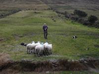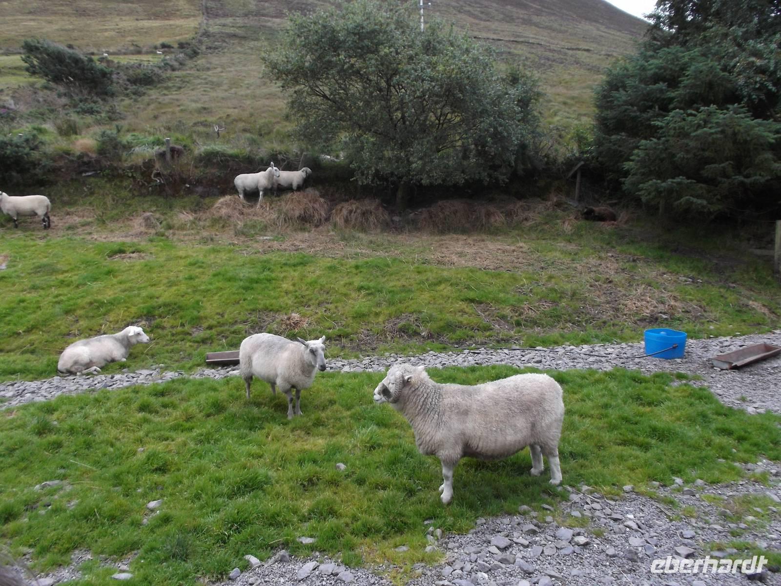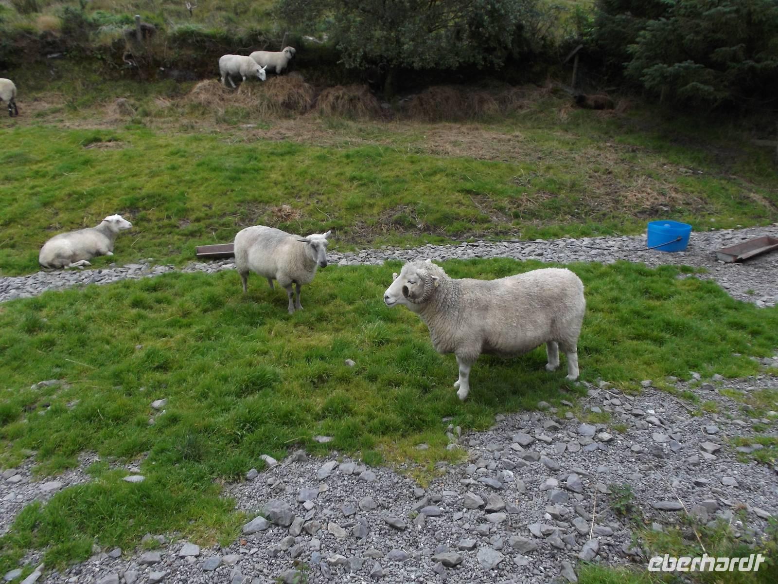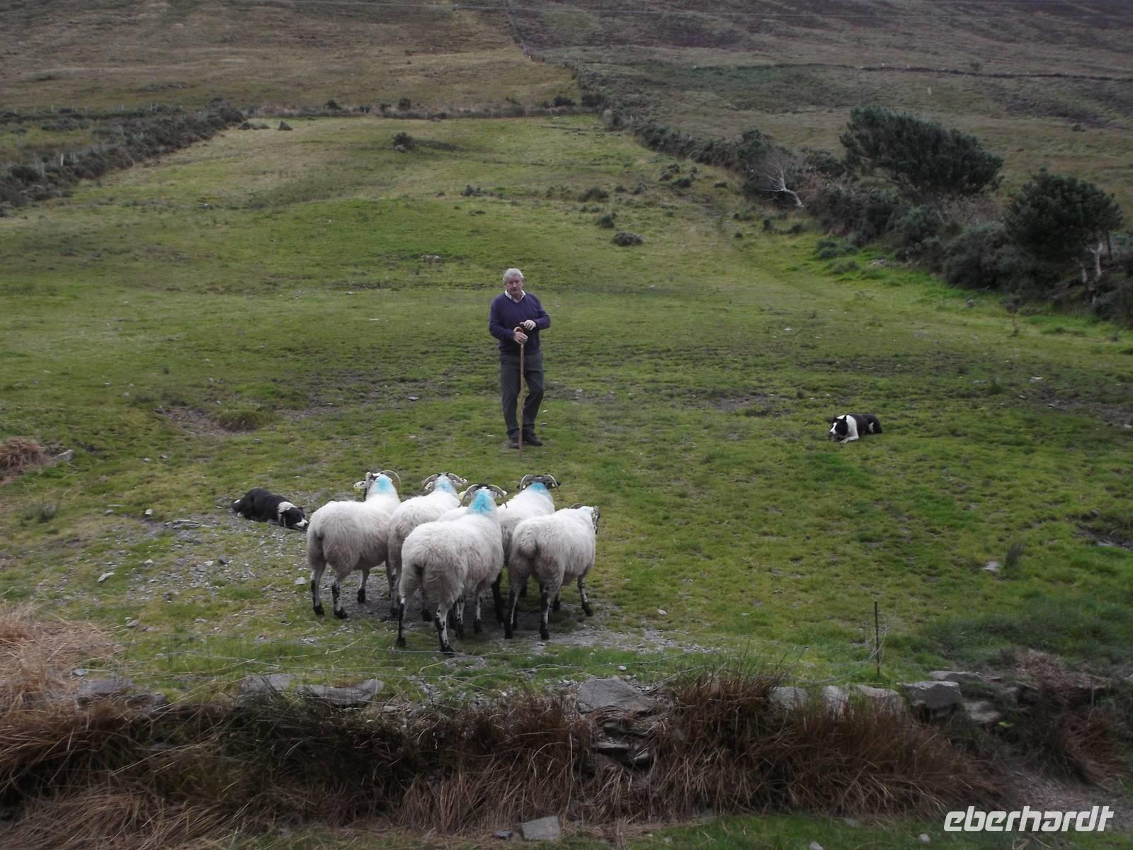 Den ersten Stopp legten wir ein im letzten in Irland erhaltenen „bog village", einem Torf-Dorf. Dessen Bewohner lebten bis vor wenigen Jahren noch traditionell vom Torfstechen und Handel mit diesem Brennmaterial , wovon die originellen Cottages mit „typisch irischem" Flair und massenhafte Torfstapel und Herdfeuer zeugen. Nicht weit war es von hier zum Schäfer Brendan, der ebenfalls noch sein traditionelles Handwerk ausübt inzwischen fast so etwas wie eine Legende ist. Daher ist seine - zugegeben etwas touristisch aufbereitete, aber vor allem sehr informative Schafshow - oft überfüllt. Schäfer Brendan stellte uns zunächst alle die Schafsrassen vor, die man in Irland antreffen kann - vom historisch bedeutsamen Jakobsschaf aus dem nahen Osten, dass seit biblischen Zeiten eine Rolle für die Viehhaltung spielt - auffällig durch seine doppeltes Hörnerpaar - bis zu den dicken, gemütlichen Friesenschafen und den Waliser Schafen mit dunkelbraunem Fell.