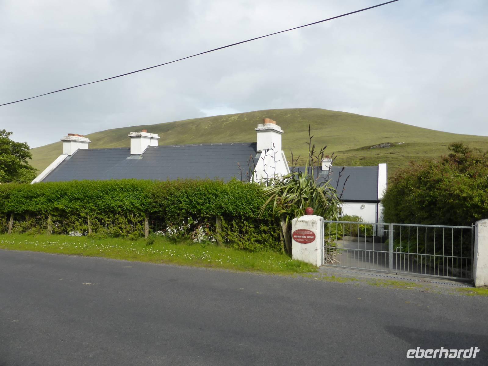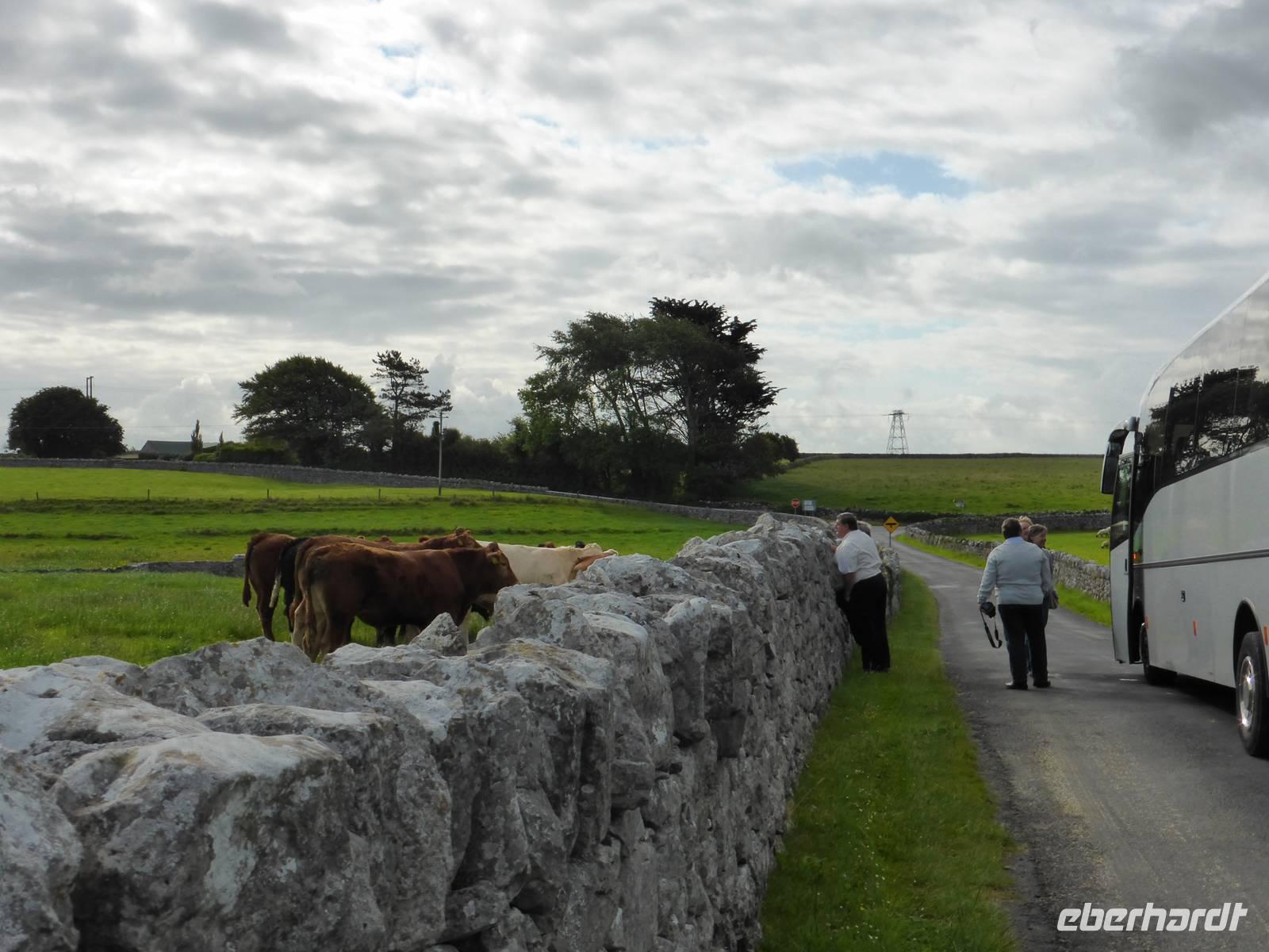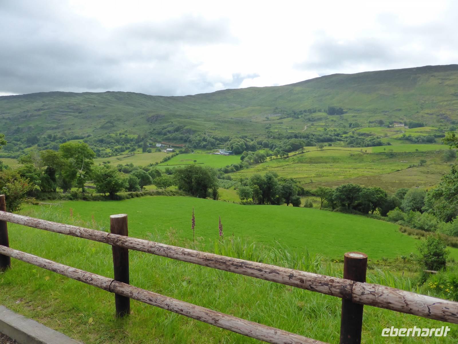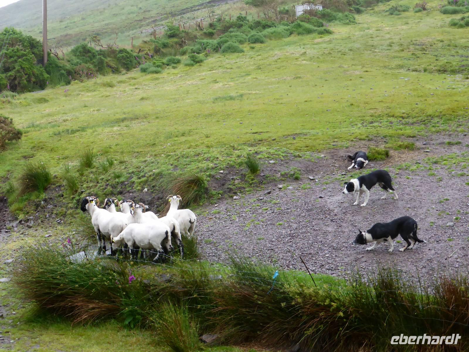 Wir begannen unsere Tagesfahrt auf dem Ring of Kerry mit einem Besuch bei King Puck in Killorglin, einem Ziegenbock, der jährlich Anfang August für drei Tage zum König von Irland gekrönt wird. Anschließend hielten wir an der alten Eisenbahnbrücke der Western Railway mit einem bezaubernden Blick auf die Landschaft um Glenbeigh. Der nächste Fotostopp war an der Dingle Bay. Der Himmel war leider bedeckt und die Fernsicht beeinträchtigt. Danach hielten wir beim Schäfer Brendan. Er stellte uns zuerst einige Schafarten vor und erklärte, wofür ihre Wolle verwendet werden kann. Anschließend führten uns seine Border-Collies vor, wie die Hunde auf seine Befehle hin die Schafherde zusammentreiben. Dabei reagiert jeder Hund auf gesonderte Signale. Vom Schäfer fuhren wir nach Cahersiveen, dem Hauptort der Iveragh-Halbinsel, und von dort zum Cahergall Ringfort. Das letzte Stück bis zum Fort gingen wir auf einem Feldweg zu Fuß. Keiner unserer Gäste hatte geahnt, wie massiv diese Steinforts gebaut wurden. Unsere Mittagspause legten wir in Waterville, einem Städtchen an der Ballinskelligs Bay ein. Anschließend fuhren wir zum Coomakesta-Pass, ohne jedoch die beiden Skellig-Inseln sehen zu können. Auch von der Passhöhe aus hatten wir leider keine Sicht, so dass wir auf dem südlichen Ring of Kerry weiter bis zur Ortschaft Sneem fuhren. Sneem ist jedes Jahr Austragungsort der „woman- carrying" - Meisterschaften, der Meisterschaften im „Frauen Tragen". Dabei tragen die Männer ihre Frauen eine lange Strecke über Wiesen, Bäche und Steinflächen. Auf unserer Weiterfahrt hielten wir am Aussichtspunkt Ladies View oberhalb des Upper Lake und anschließend beendeten wir unseren Tagesausflug mit einem Spaziergang durch das Gelände von Muckross House. Das herrschaftliche Gebäude liegt in einer traumhaften Landschaft, umgeben von einer englischen Parkanlage am See „Muckross Lake".