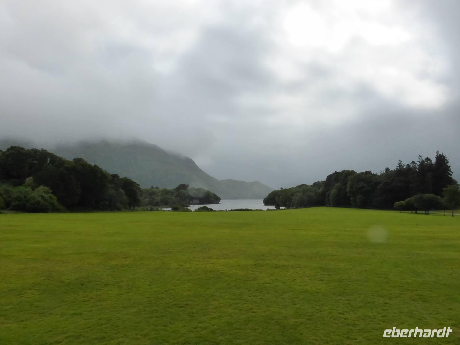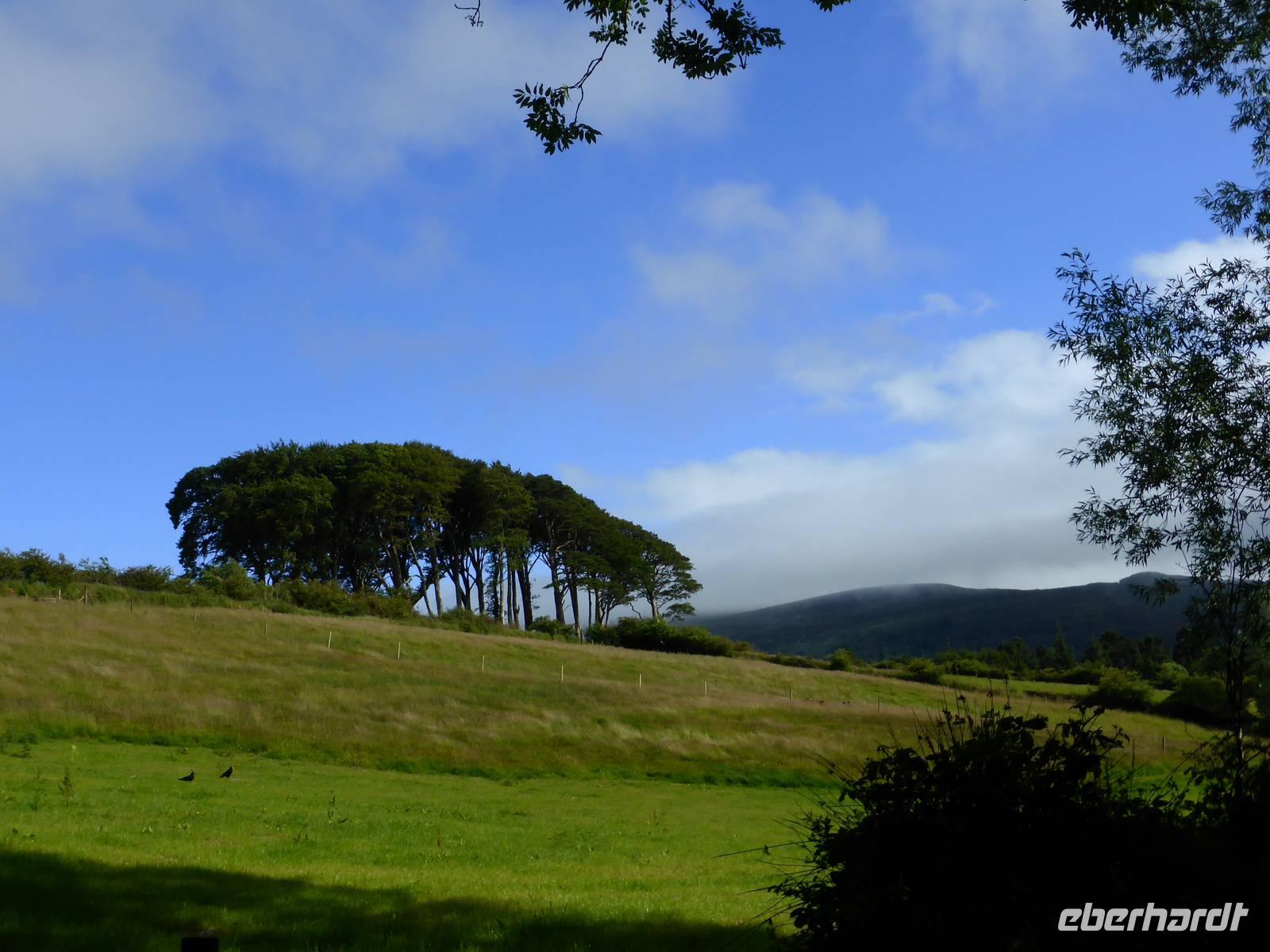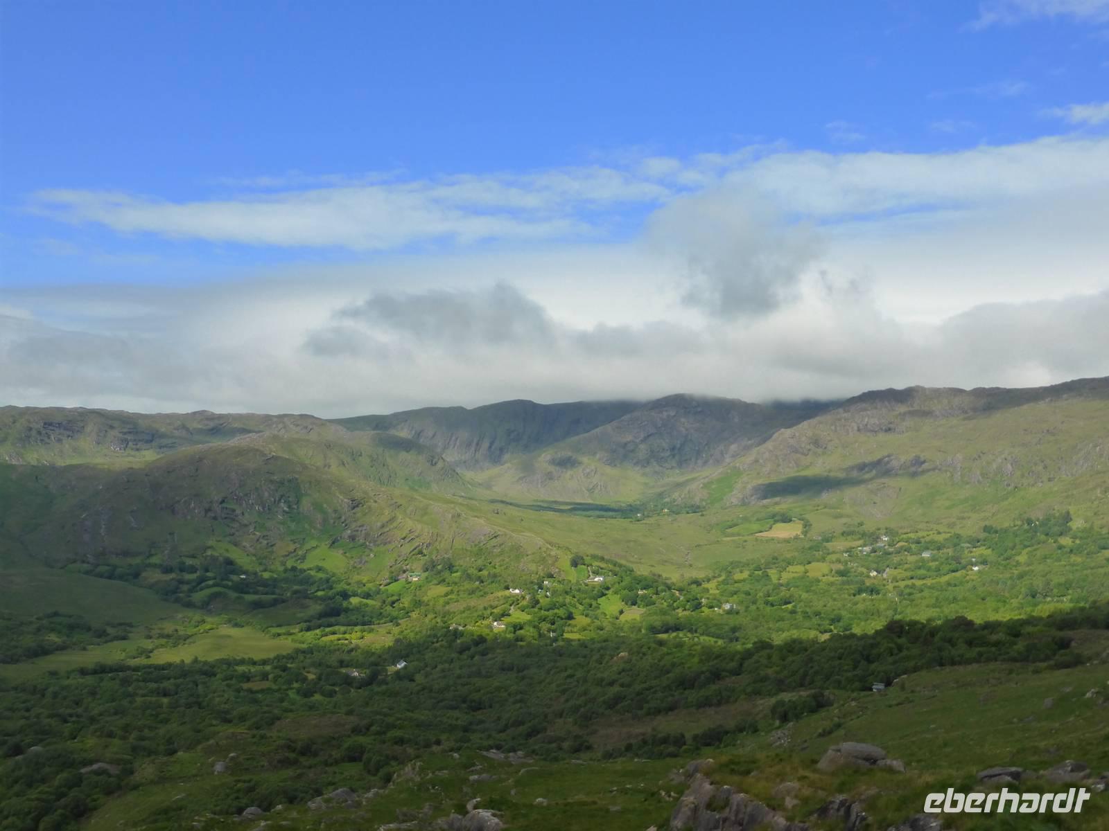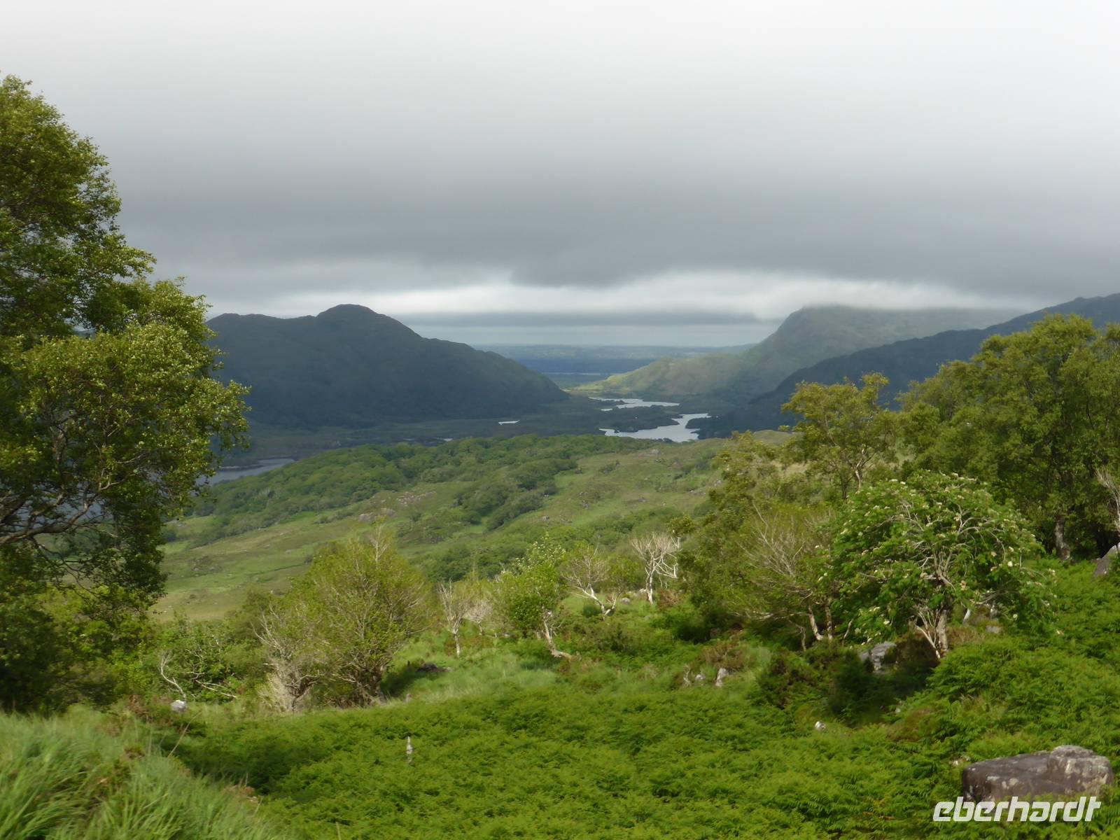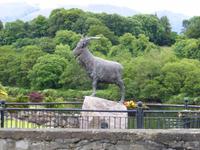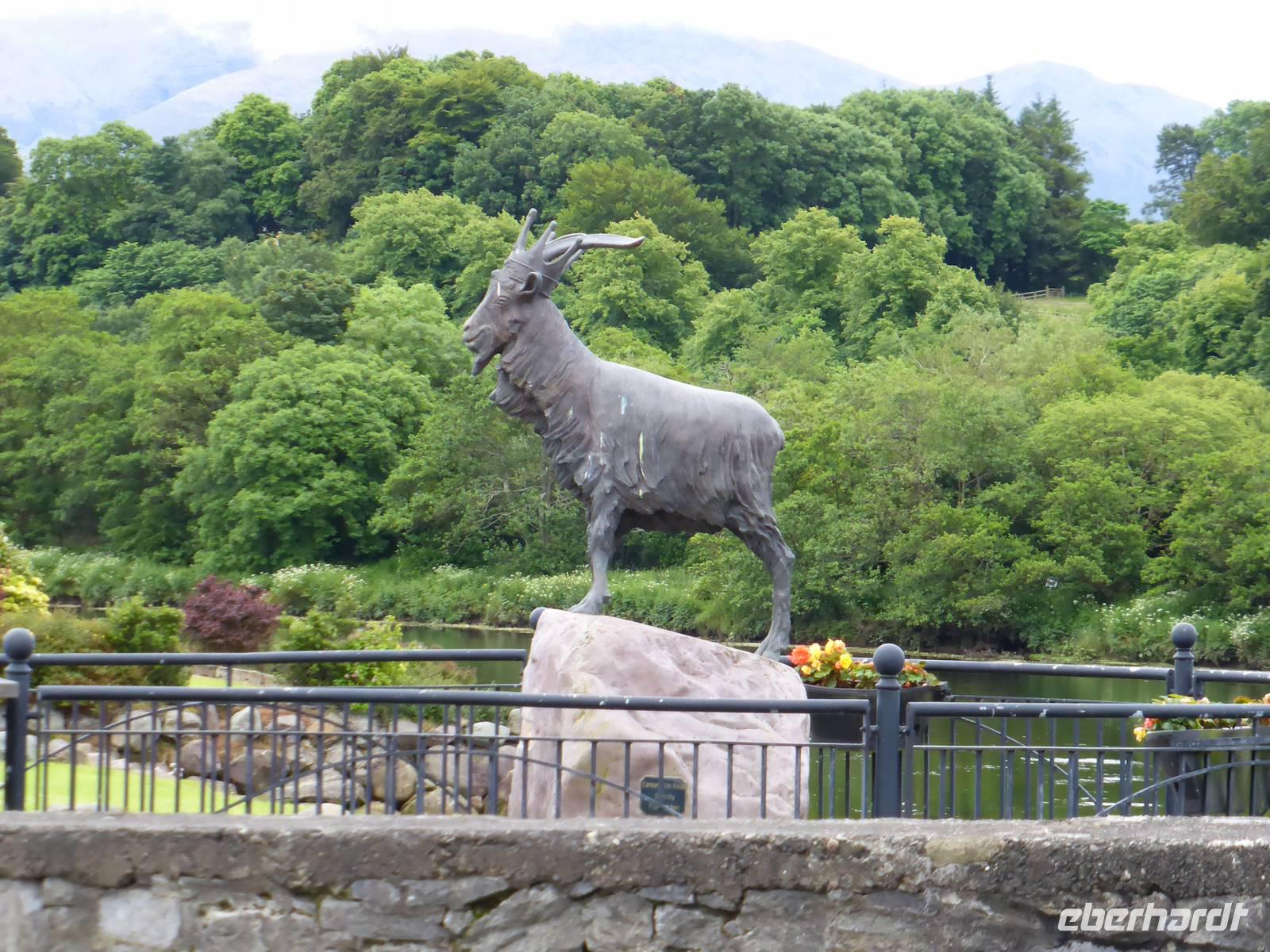 Wir begannen unsere Tagesfahrt auf dem Ring of Kerry mit einem Besuch bei King Puck in Killorglin, einem Ziegenbock, der jährlich Anfang August für drei Tage zum König von Irland gekrönt wird. Anschließend hielten wir an der alten Eisenbahnbrücke der Western Railway mit einem bezaubernden Blick auf die Landschaft um Glenbeigh. Der nächste Fotostopp war an der Dingle Bay. Der Himmel war leider bedeckt und die Fernsicht beeinträchtigt. Danach hielten wir beim Schäfer Brendan. Er stellte uns zuerst einige Schafarten vor und erklärte, wofür ihre Wolle verwendet werden kann. Anschließend führten uns seine Border-Collies vor, wie die Hunde auf seine Befehle hin die Schafherde zusammentreiben. Dabei reagiert jeder Hund auf gesonderte Signale. Vom Schäfer fuhren wir nach Cahersiveen, dem Hauptort der Iveragh-Halbinsel, und von dort zum Cahergall Ringfort. Das letzte Stück bis zum Fort gingen wir auf einem Feldweg zu Fuß. Keiner unserer Gäste hatte geahnt, wie massiv diese Steinforts gebaut wurden. Unsere Mittagspause legten wir in Waterville, einem Städtchen an der Ballinskelligs Bay ein. Anschließend fuhren wir zum Coomakesta-Pass, ohne jedoch die beiden Skellig-Inseln sehen zu können. Auch von der Passhöhe aus hatten wir leider keine Sicht, so dass wir auf dem südlichen Ring of Kerry weiter bis zur Ortschaft Sneem fuhren. Sneem ist jedes Jahr Austragungsort der „woman- carrying" - Meisterschaften, der Meisterschaften im „Frauen Tragen". Dabei tragen die Männer ihre Frauen eine lange Strecke über Wiesen, Bäche und Steinflächen. Auf unserer Weiterfahrt hielten wir am Aussichtspunkt Ladies View oberhalb des Upper Lake und anschließend beendeten wir unseren Tagesausflug mit einem Spaziergang durch das Gelände von Muckross House. Das herrschaftliche Gebäude liegt in einer traumhaften Landschaft, umgeben von einer englischen Parkanlage am See „Muckross Lake".