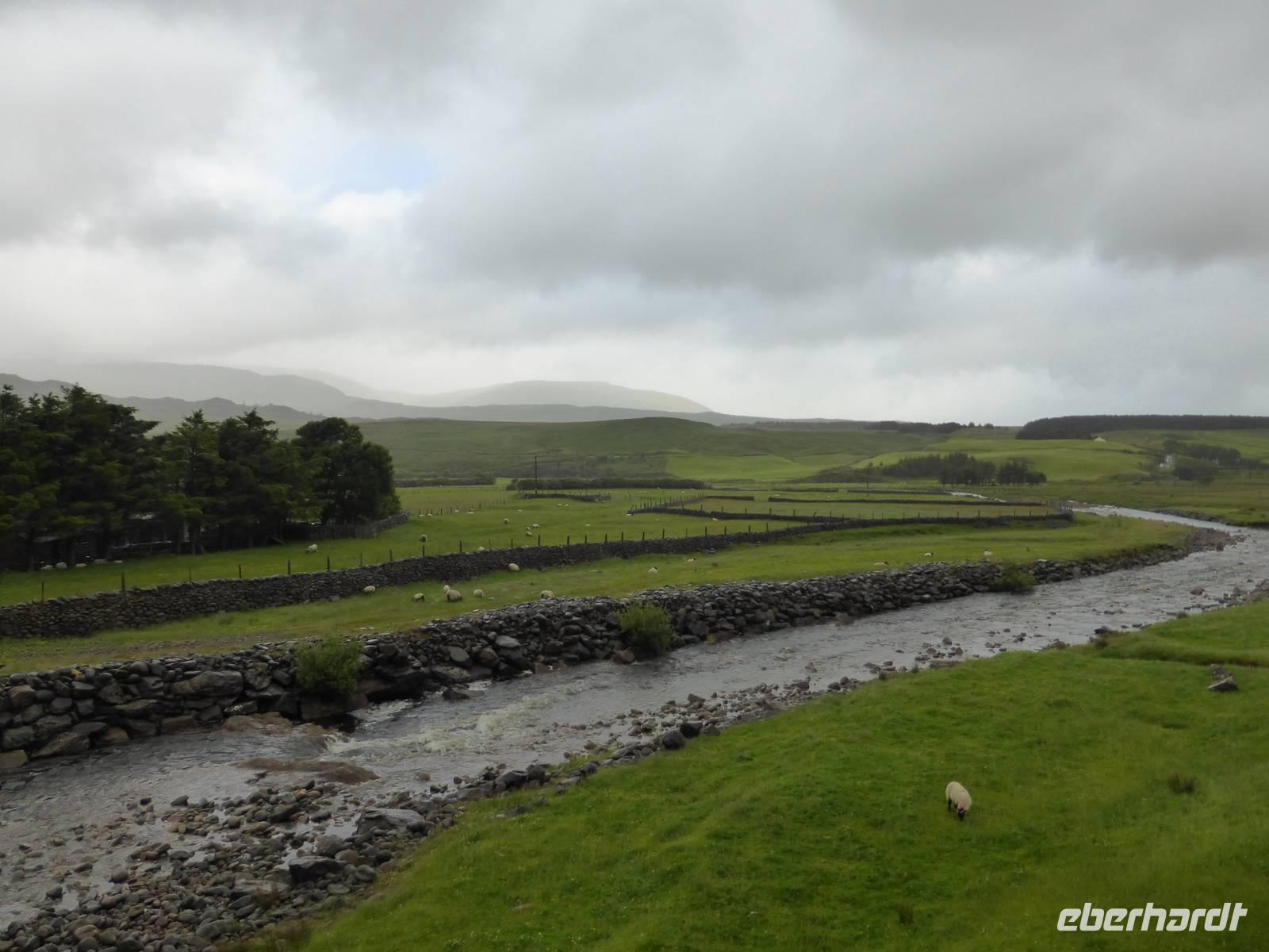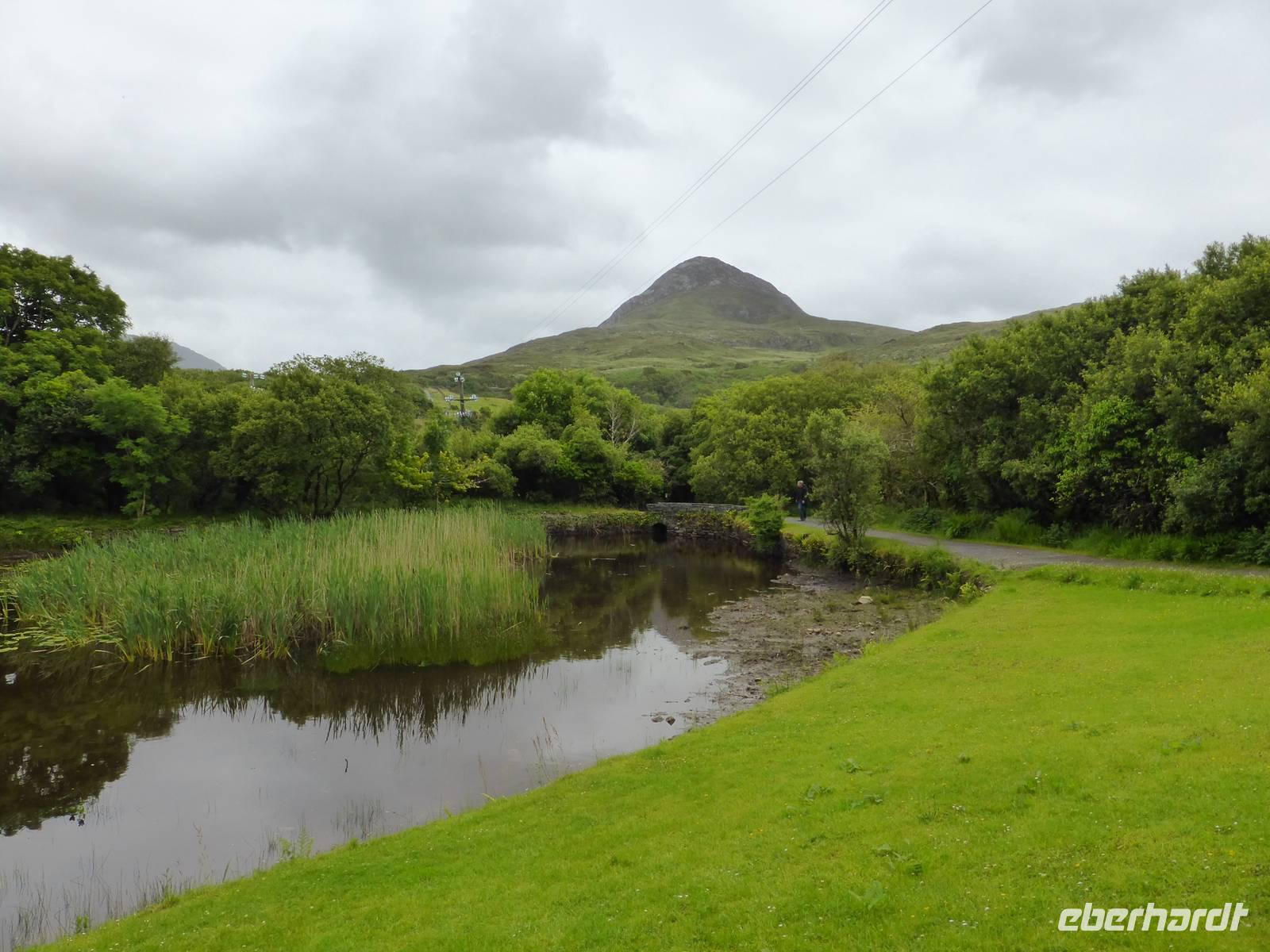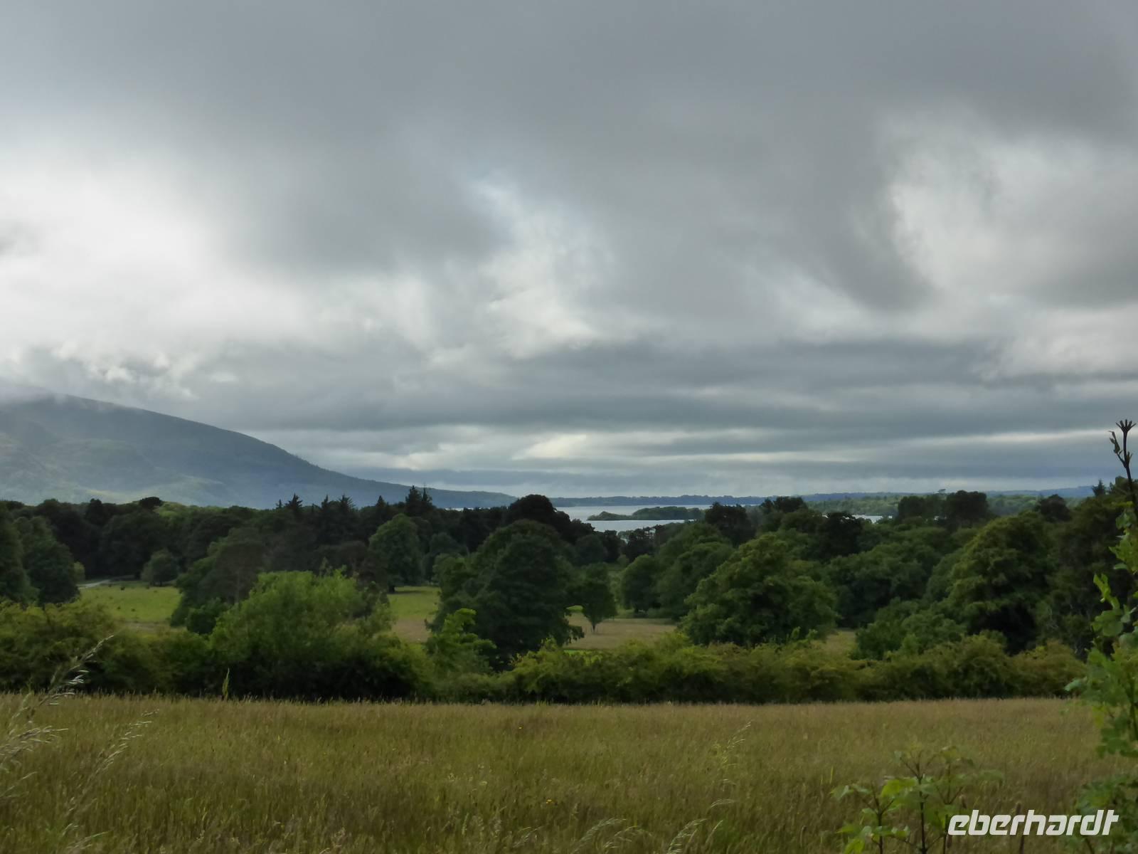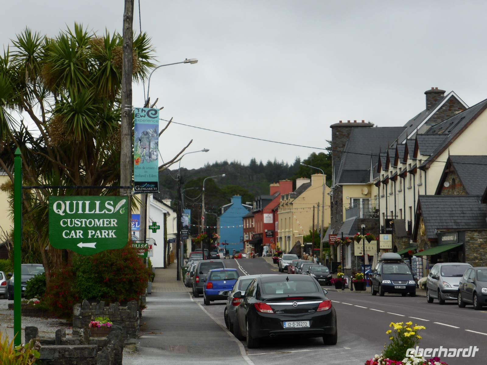 Wir begannen unsere Tagesfahrt auf dem Ring of Kerry mit einem Besuch bei King Puck in Killorglin, einem Ziegenbock, der jährlich Anfang August für drei Tage zum König von Irland gekrönt wird. Anschließend hielten wir an der alten Eisenbahnbrücke der Western Railway mit einem bezaubernden Blick auf die Landschaft um Glenbeigh. Der nächste Fotostopp war an der Dingle Bay. Der Himmel war leider bedeckt und die Fernsicht beeinträchtigt. Danach hielten wir beim Schäfer Brendan. Er stellte uns zuerst einige Schafarten vor und erklärte, wofür ihre Wolle verwendet werden kann. Anschließend führten uns seine Border-Collies vor, wie die Hunde auf seine Befehle hin die Schafherde zusammentreiben. Dabei reagiert jeder Hund auf gesonderte Signale. Vom Schäfer fuhren wir nach Cahersiveen, dem Hauptort der Iveragh-Halbinsel, und von dort zum Cahergall Ringfort. Das letzte Stück bis zum Fort gingen wir auf einem Feldweg zu Fuß. Keiner unserer Gäste hatte geahnt, wie massiv diese Steinforts gebaut wurden. Unsere Mittagspause legten wir in Waterville, einem Städtchen an der Ballinskelligs Bay ein. Anschließend fuhren wir zum Coomakesta-Pass, ohne jedoch die beiden Skellig-Inseln sehen zu können. Auch von der Passhöhe aus hatten wir leider keine Sicht, so dass wir auf dem südlichen Ring of Kerry weiter bis zur Ortschaft Sneem fuhren. Sneem ist jedes Jahr Austragungsort der „woman- carrying" - Meisterschaften, der Meisterschaften im „Frauen Tragen". Dabei tragen die Männer ihre Frauen eine lange Strecke über Wiesen, Bäche und Steinflächen. Auf unserer Weiterfahrt hielten wir am Aussichtspunkt Ladies View oberhalb des Upper Lake und anschließend beendeten wir unseren Tagesausflug mit einem Spaziergang durch das Gelände von Muckross House. Das herrschaftliche Gebäude liegt in einer traumhaften Landschaft, umgeben von einer englischen Parkanlage am See „Muckross Lake".