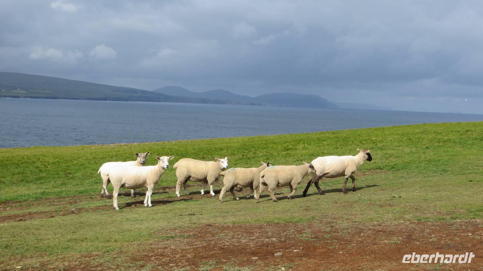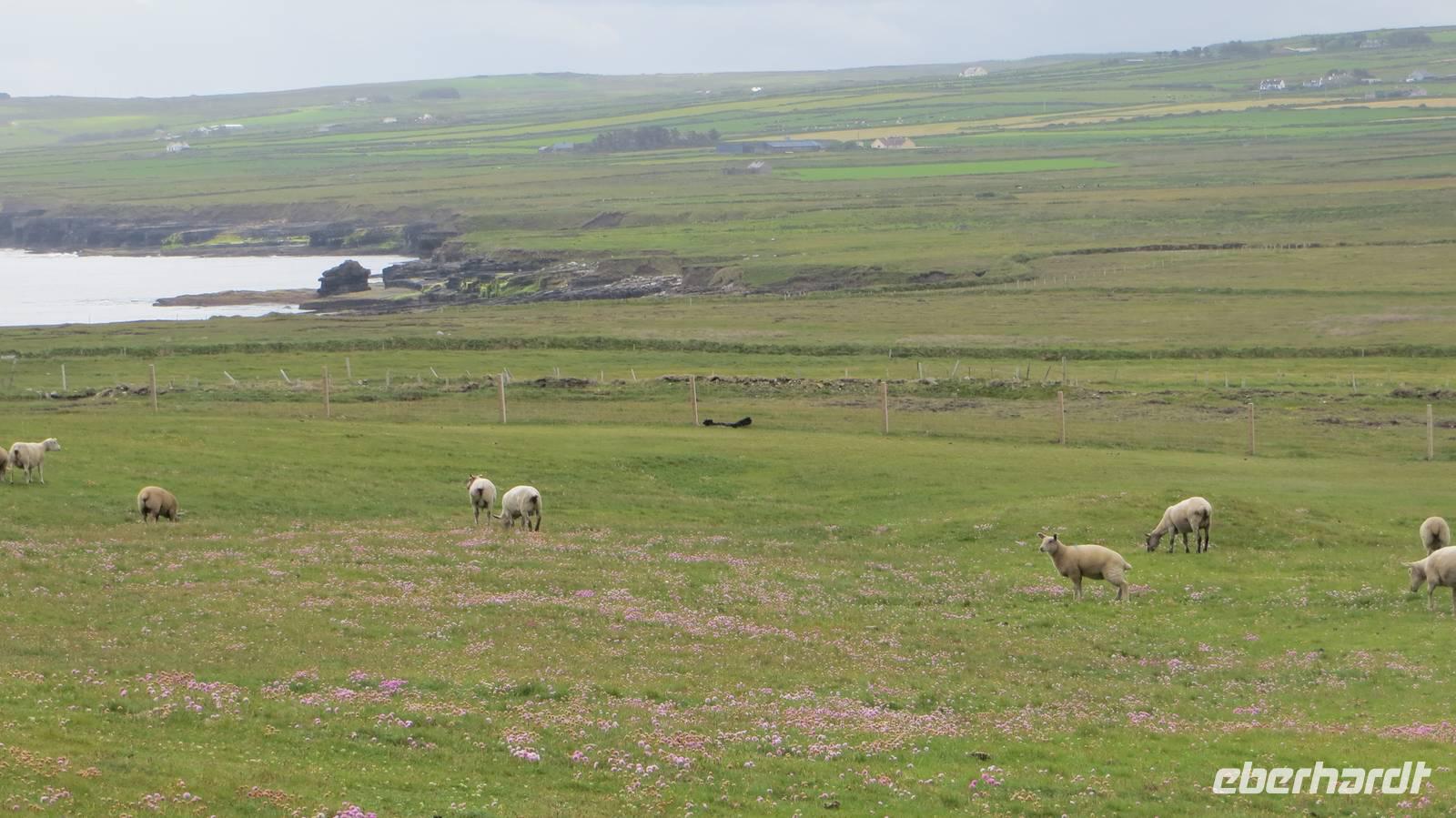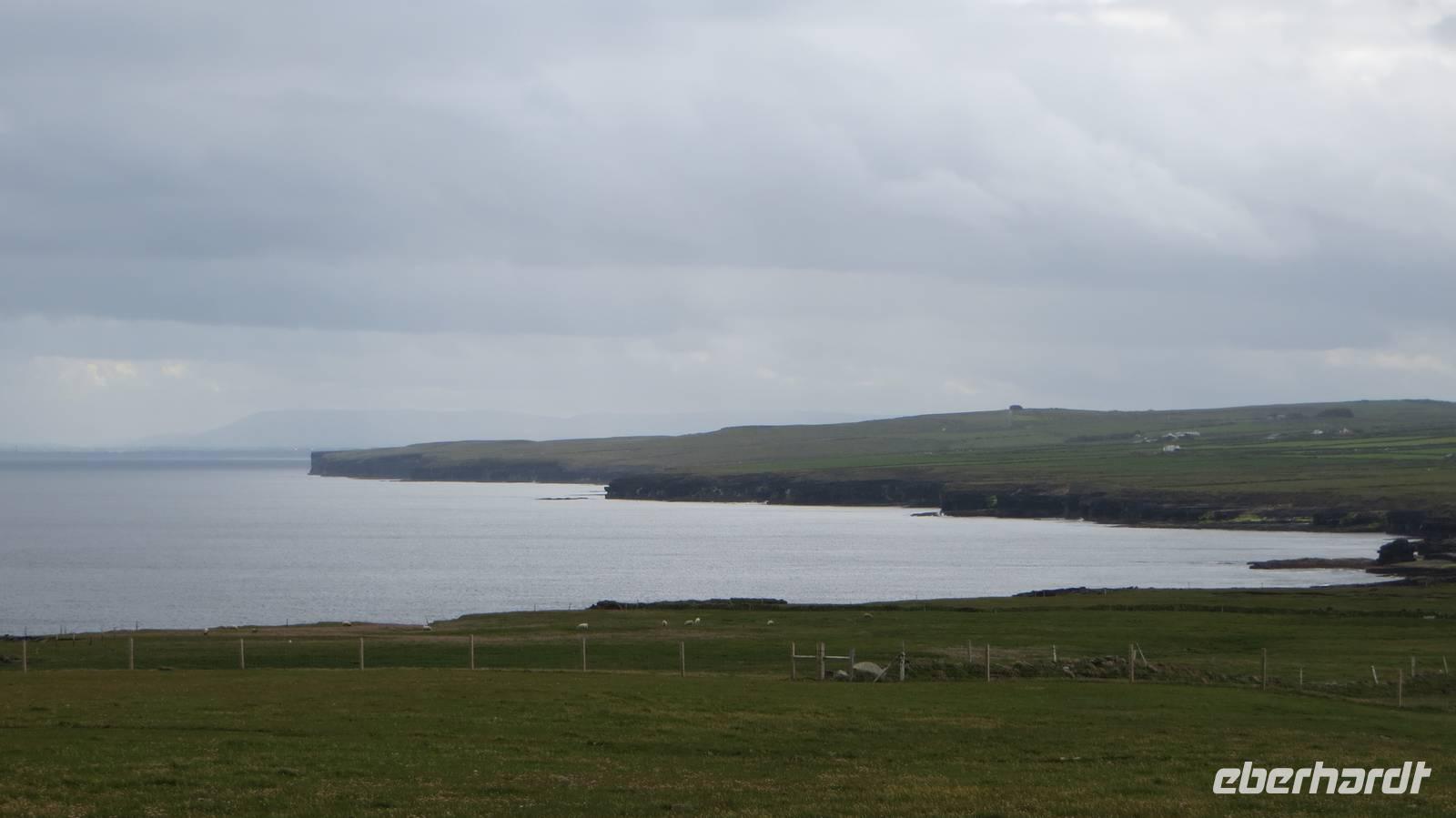 Der heutige Höhepunkt ist der Besuch der größten neolithischen Ausgrabungsstätte der Welt in Ceide Fields, 5000 Jahre alt. Zuerst stoppen wir aber in Killala am Rundturm und besuchen noch einen Irischen Wolfshund. Da das Wetter gut ist, bietet Petra ein besonderes Erlebnis an. Über eine enge Straßen und Koppeln fahren wir zu den Klippen von Downpatrick Head. Traumhafte Aussichten auf das Meer, nur wir und die Schafe! Man kann auch zwei Blowholes bestaunen. Große Löcher mitten in den Wiesen, aus denen das Meer bei entsprechendem Wellengang Fontänen herausbläst.