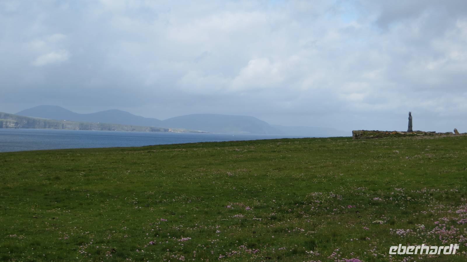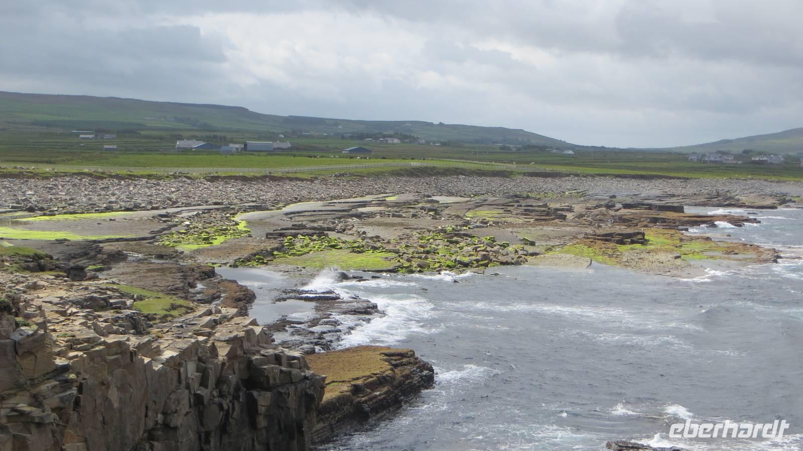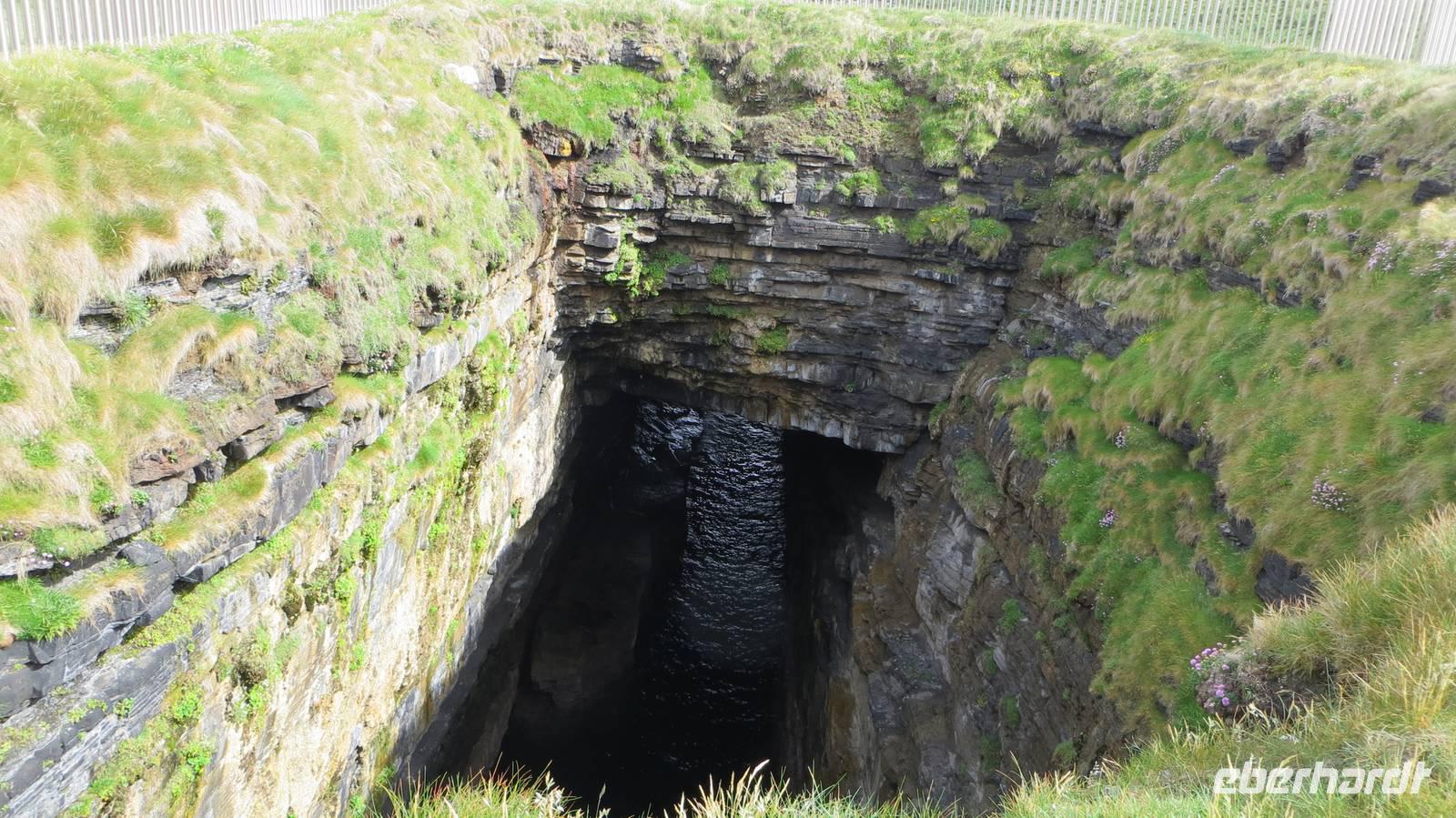 Der heutige Höhepunkt ist der Besuch der größten neolithischen Ausgrabungsstätte der Welt in Ceide Fields, 5000 Jahre alt. Zuerst stoppen wir aber in Killala am Rundturm und besuchen noch einen Irischen Wolfshund. Da das Wetter gut ist, bietet Petra ein besonderes Erlebnis an. Über eine enge Straßen und Koppeln fahren wir zu den Klippen von Downpatrick Head. Traumhafte Aussichten auf das Meer, nur wir und die Schafe! Man kann auch zwei Blowholes bestaunen. Große Löcher mitten in den Wiesen, aus denen das Meer bei entsprechendem Wellengang Fontänen herausbläst.