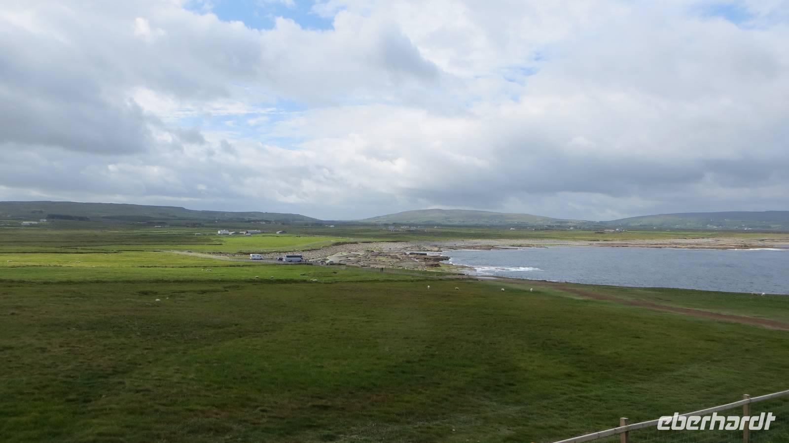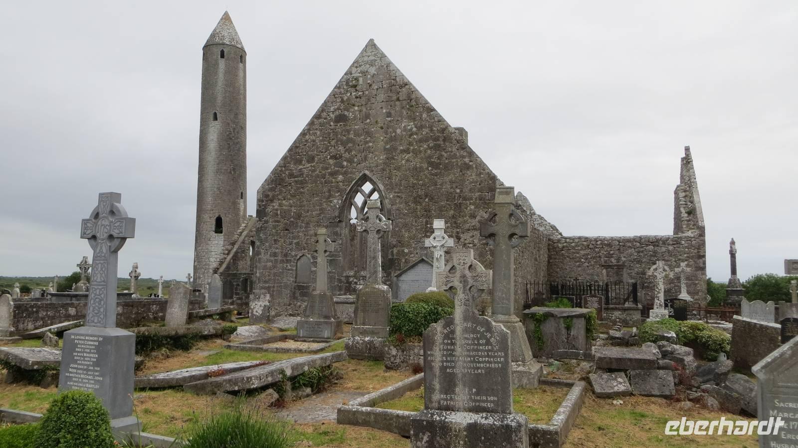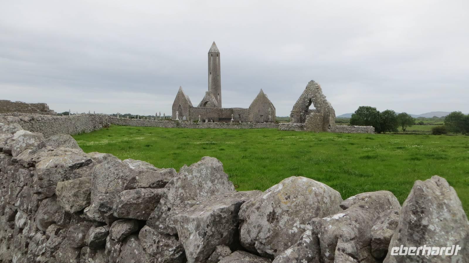Wir fahren heute über das Burrengebiet weiter in den Süden. Zuerst legen wir einen Zwischenstopp in Kilmacduagh ein, die Klosteranlage vom Heiligen Colman MacDuagh, wo wir den schiefen Rundturm und die Ruinen mehrerer Kirchen bewundern.