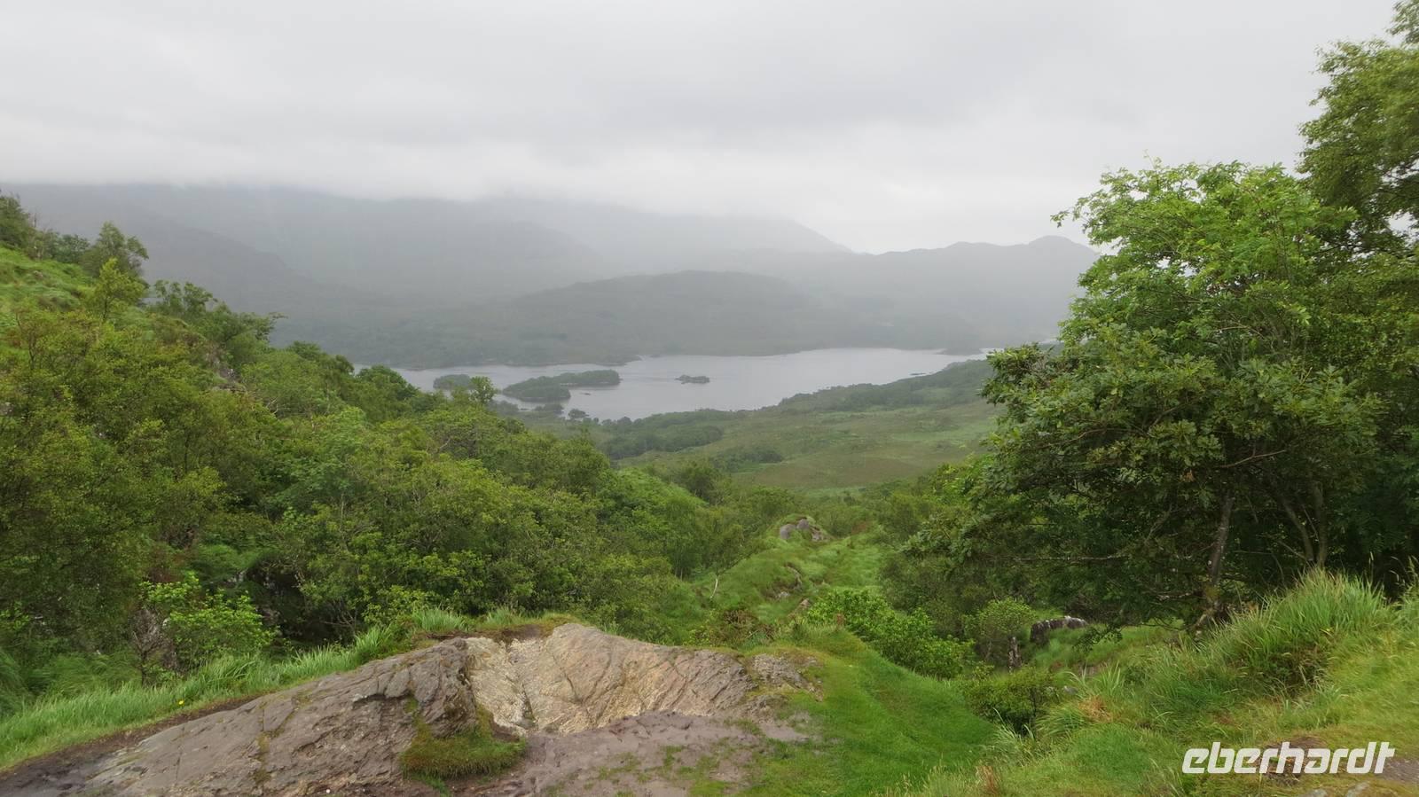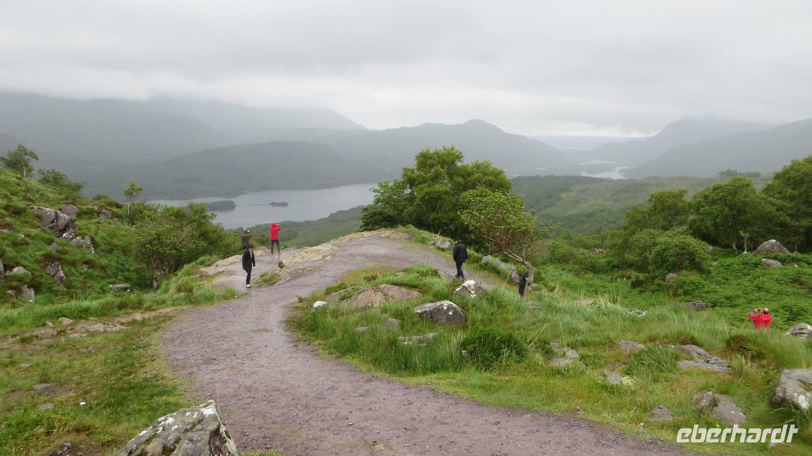 Über Kenmare und Moll's Gap fahren wir die gestrige Strecke nochmals. An Ladies View stoppen wir heute kurz, da wir die berühmte Aussicht über die Seen von Killarney im Gegensatz zu gestern im Nieselregen wenigsten erkennen können.