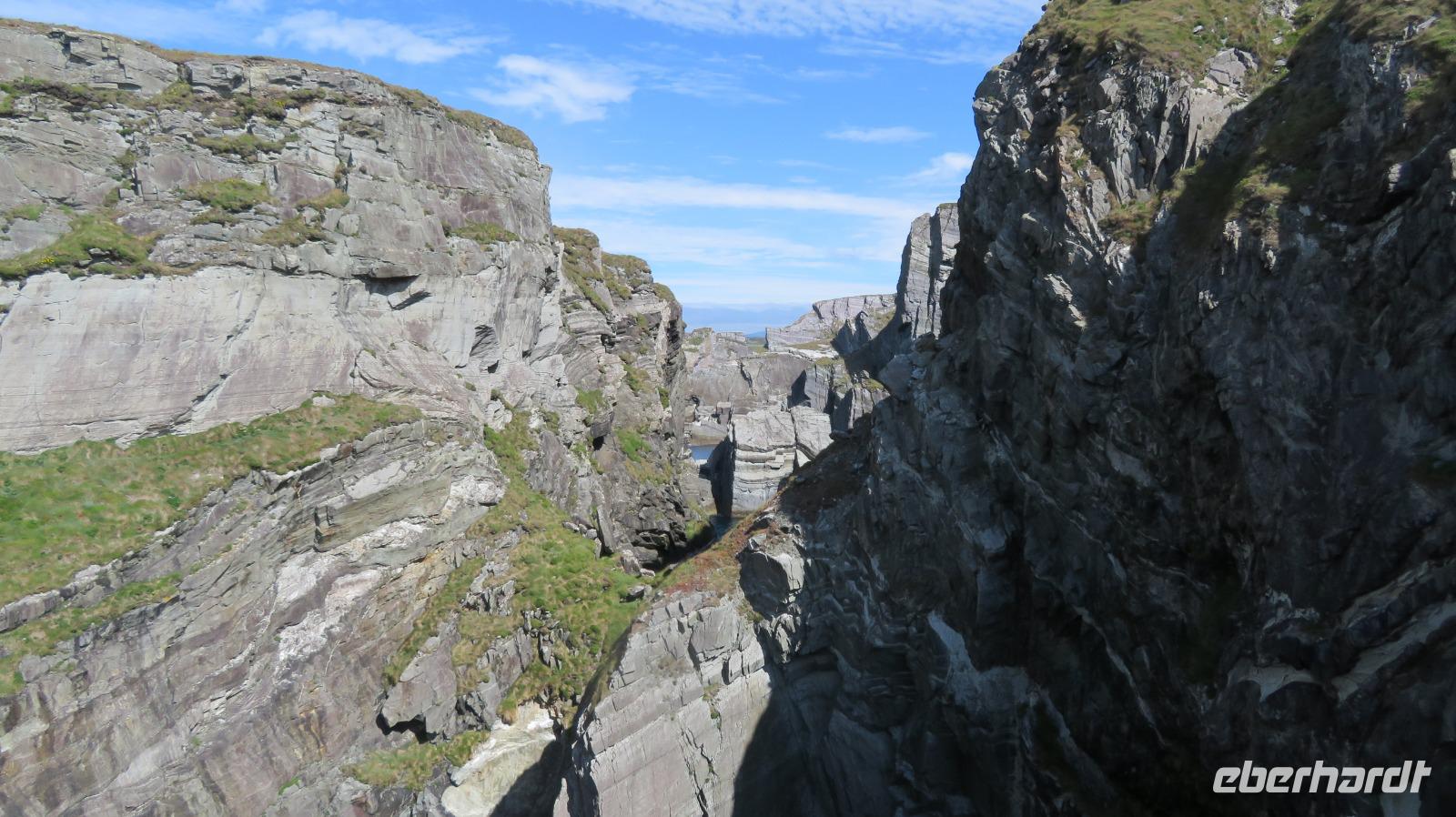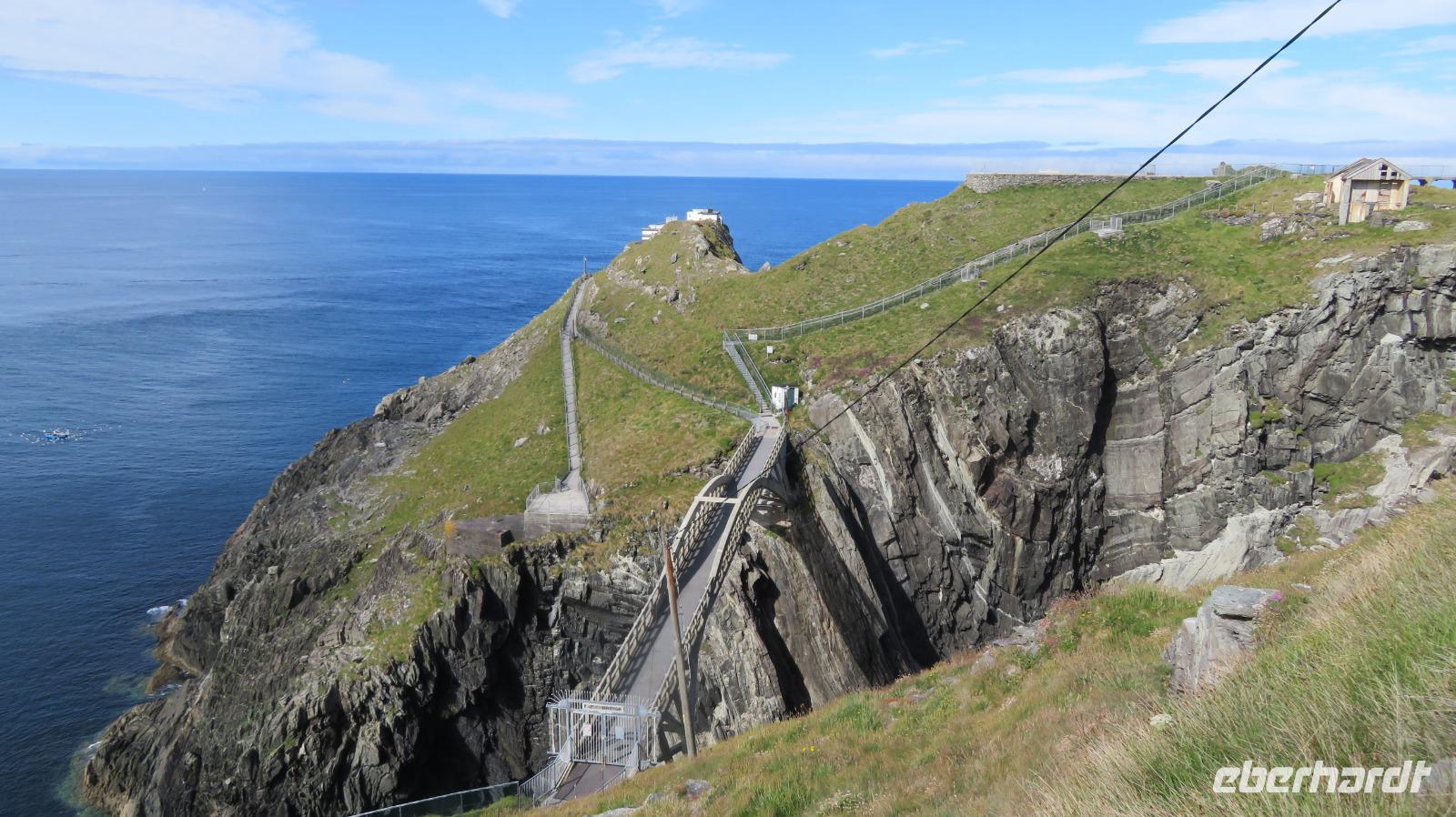 Heute erwartet uns noch ein Höhepunkt der Reise, Mizen Head. Auf teils sehr engen Straßen fahren wir zum südwestlichsten Punkt von Irland. Die Straße endet auf dem Parkplatz des Mizen Head Besucherzentrums. Uns eröffnet sich ein spektakulärer Blick über die Klippen auf den Atlantik und auf die beeindruckende Fußgängerbrücke zur Mizen Head Signal Station. Hier treffen die Strömungen von West- und Südküste aufeinander, hier erreichen die Wellen des Atlantiks erstmals Land. Bei entsprechenden Wetterverhältnissen ein gigantisches Schauspiel. Aber auch für uns ist es eines der Highlighs der Tour, obwohl das Meer heute spiegelglatt ist.
