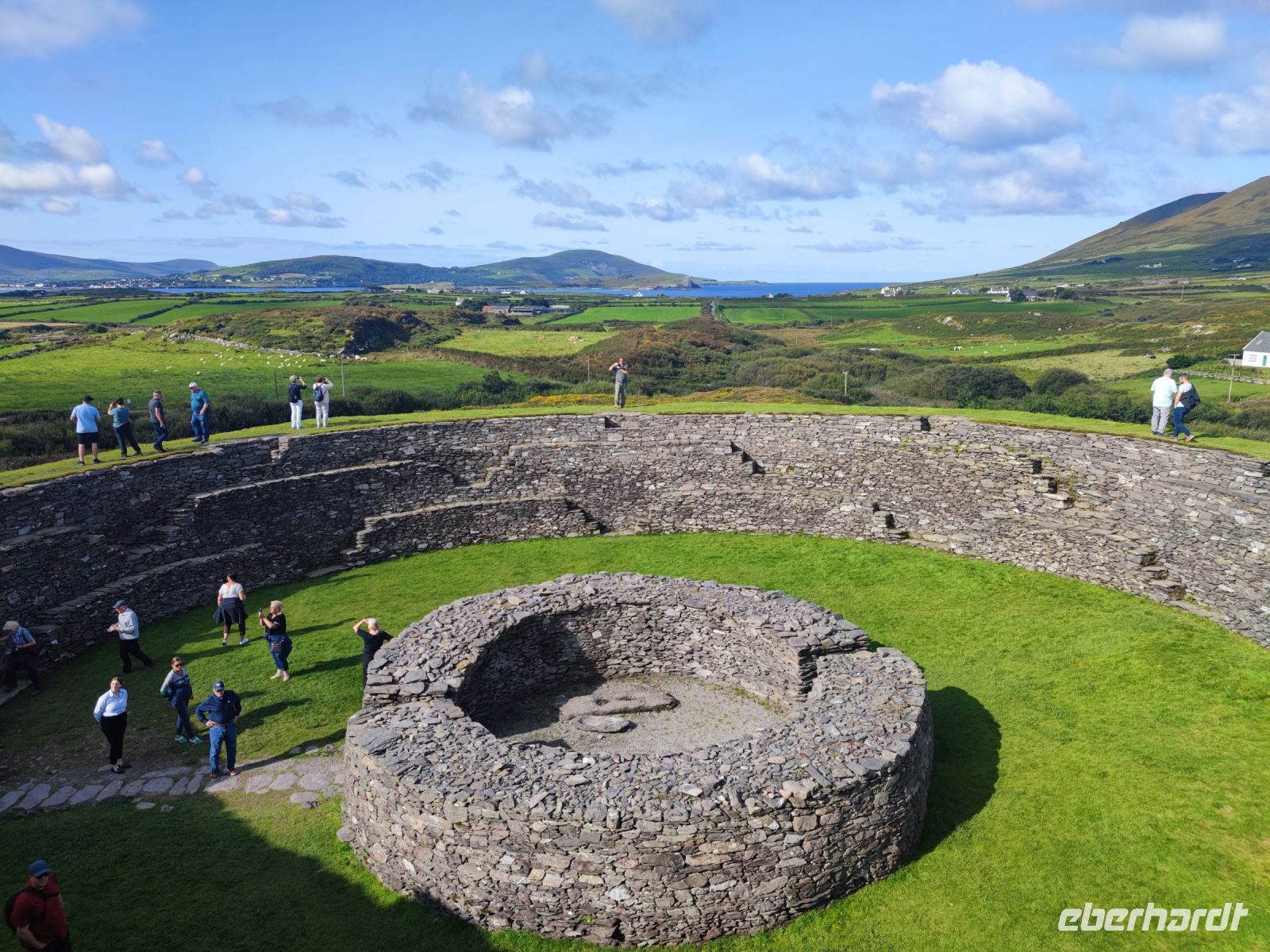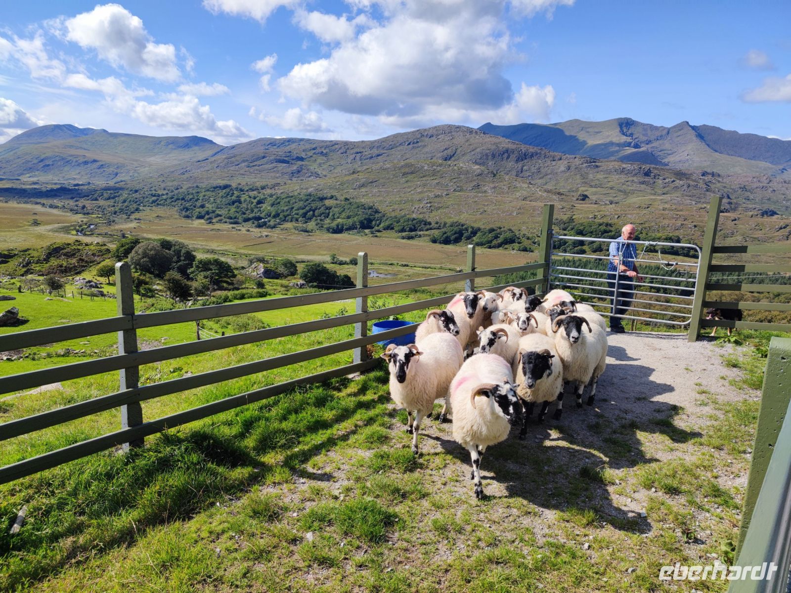 Nach dem Frühstück starteten wir zu unserer Rundfahrt auf dem Ring of Kerry, der einmal um die Halbinsel Iveragh herumführt. Für einen ersten Fotostopp hielten wir an der alten Eisenbahnstrecke der Western Railway, wo die Fotomodelle „Paddy“, der Esel, und auf seinem Rücken „Rose“, der Hund, bereits auf uns warteten. Danach fuhren wir nach Cahersiveen, der Geburtsstadt Daniel O`Connells. Außerhalb der Stadt, auf der anderen Seite des Flusses, liegt das Cahergall Stone Fort (Cathair Geal). Einige dieser Steinforts sind bis zu 2500 Jahre alt, dieses ca. 1000. Es war beeindruckend zu sehen, wie massiv das Fort errichtet wurde und wie akkurat die Steine aufgeschichtet worden sind. Vom Cahergall Stone Fort ging es weiter nach Waterville. Hier legten wir unsere Mittagspause ein und hatten Zeit für einen Spaziergang. Danach fuhren wir auf zum Coomakesta Pass und hatten aus 210 m Höhe einen tollen Blick auf die Ballinskelligs Bay und die Bucht des Kenmare River. Anschließend brachte uns der Bus in den Derrynane-Nationalpark zum Strand am Derrynane-House. Am Nachmittag besuchten wir Kissan`s Sheepfarm, wo wir zusehen konnten, wie der Hirtenhund die Schafe zusammentreibt und wie die Schafe geschoren und geimpft werden. Anschließend fuhren wir in den Killarney Nationalpark zum Aussichtspunkt „Ladies View“. Die Hofdamen Königin Victorias sollen beim Anblick der Berge und Seen entzückt und begeistert gewesen sein. Mit dem Bus fuhren wir danach zu unserem Hotel zurück. Nach dem Abendessen besuchte ein Großteil unserer Gruppe die Show „Celtic Steps“ im benachbarten Konferenzzentrum.