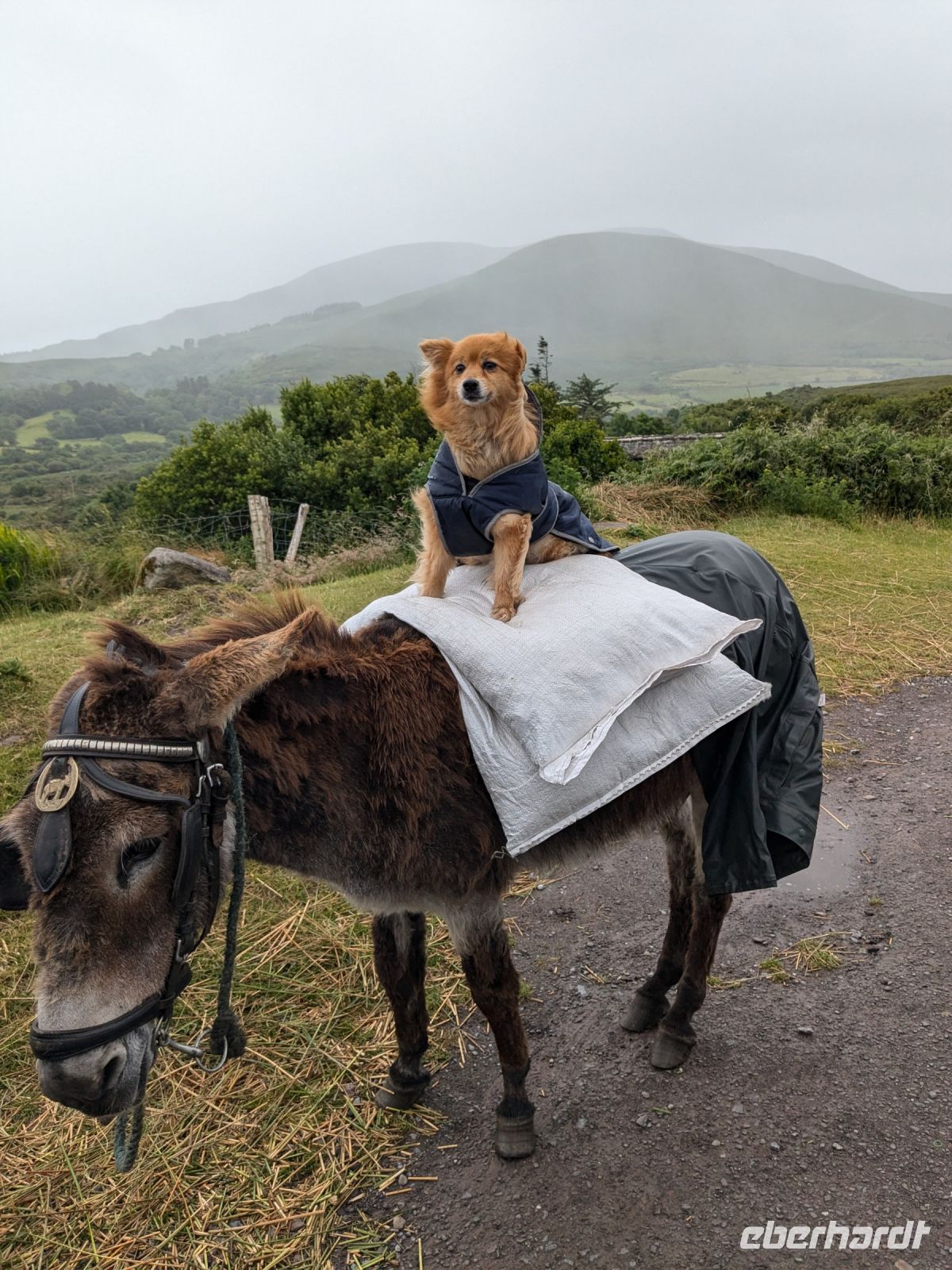 Am heutigen Tag fuhren wir entlang des Ring of Kerrys auf der Iveragh-Halbinsel und machten dabei verschiedene Zwischenstopps, um die landschaftlichen Höhepunkte zu erkunden. Zunächst legten wir einen kurzen Halt am Straßenrand ein, wo ein Herr St. Bridgis Kreuze verkaufte – typische irische Symbole, die oft zum Schutz vor dem Bösen an Hauswände gehängt werden. Er flocht diese Kreuze, während sein Hund auf einem Esel ruhte, ein wahrhaft einzigartiges Fotomotiv.
