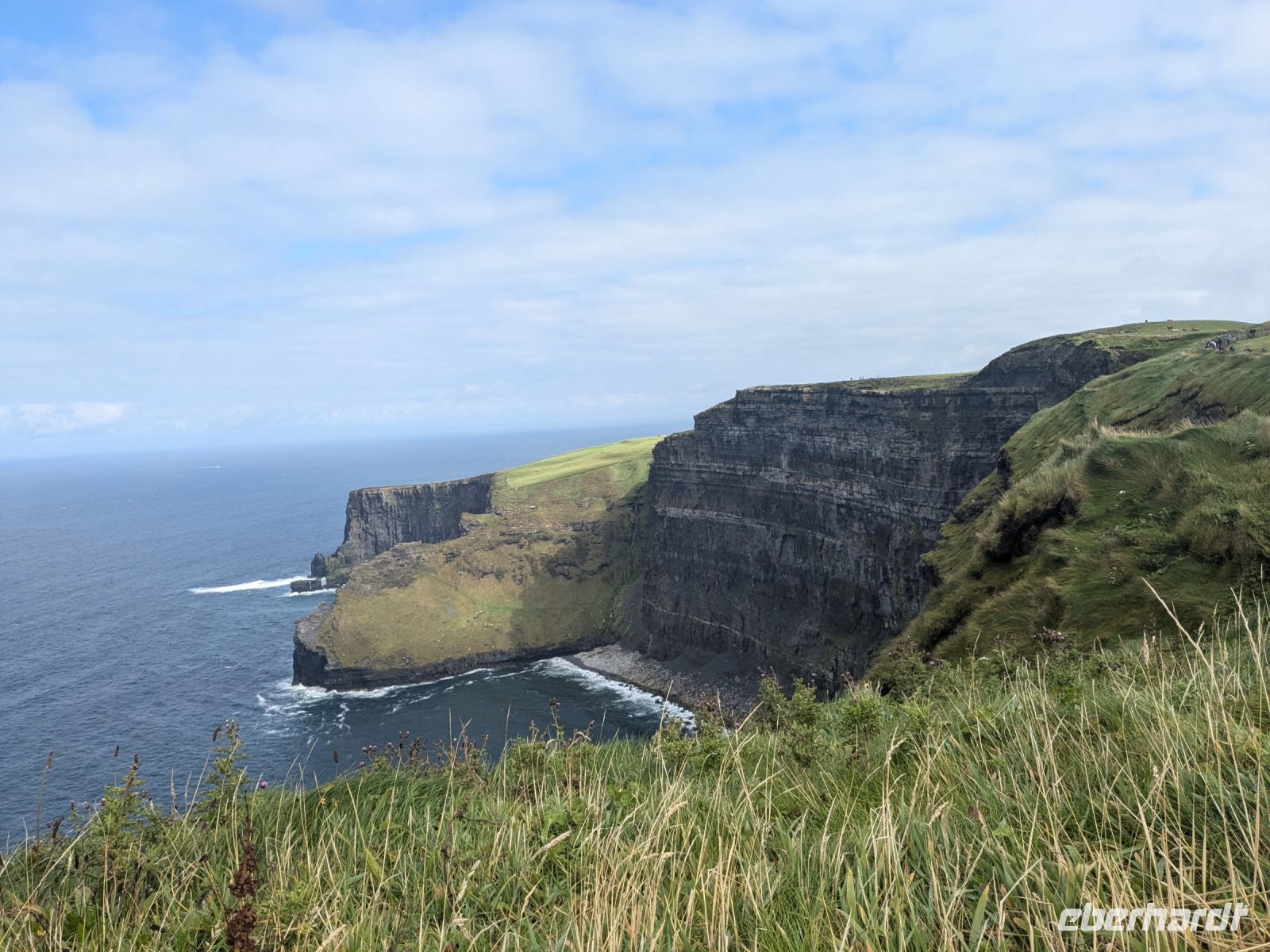 Direkt danach machten wir uns auf zu Irlands meistbesuchter Attraktion, den beeindruckenden Cliffs of Moher. Wir spazierten entlang der 200 Meter hohen Klippen, genossen die frische Meeresbrise und hielten die atemberaubende Aussicht auf zahlreichen Fotos fest. Der frühe Besuch bescherte uns eine vergleichsweise ruhige Zeit, und die letzten Sonnenstrahlen des Morgens ließen das Gras noch grüner erstrahlen.