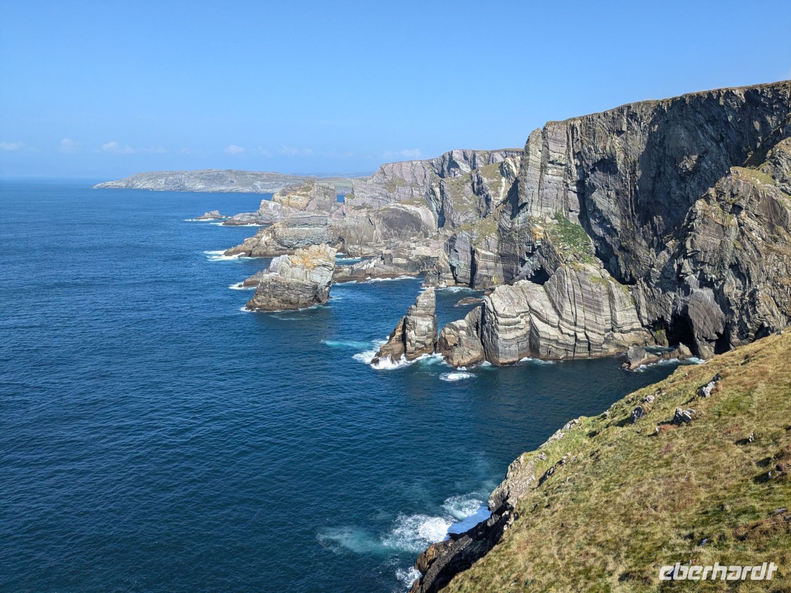 Unsere Reise führte uns weiter zur Mizen-Halbinsel, der südlichsten Halbinsel Irlands. Am Mizen Head gingen wir den Coastal Walk entlang. Die 100 Meter hohen Klippen, mit sattem Grün bewachsen, wurden von den kraftvollen Wellen des Atlantiks umspült. Unterschiedliche Vogelarten umflogen uns, und auch sie schienen das herrliche Wetter zu genießen.