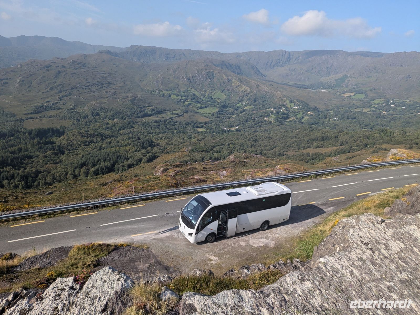 Heute erwartete uns eine lange, aber wunderschöne Fahrt durch Irlands faszinierende Landschaften. Morgens fuhren wir den Caha Pass entlang, einer Strecke, die uns durch eine atemberaubende Berglandschaft führte. An einem besonders malerischen Aussichtspunkt hielten wir an und stiegen einige Felsen hinauf, um das beeindruckende Panorama zu bewundern. Von unserem erhöhten Standpunkt aus sahen wir kleine, verstreute Häuschen und Wälder, eingebettet in die majestätischen Berge. Die Sonne glitzerte über der Szenerie und verlieh allem einen goldenen Schimmer.