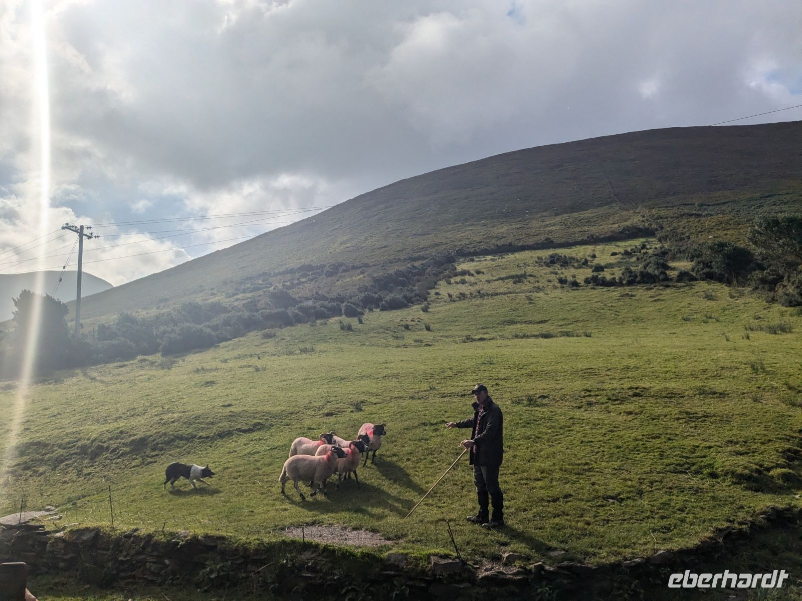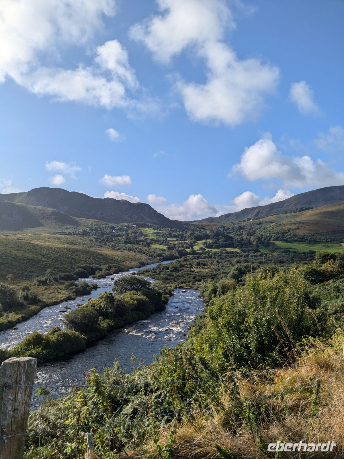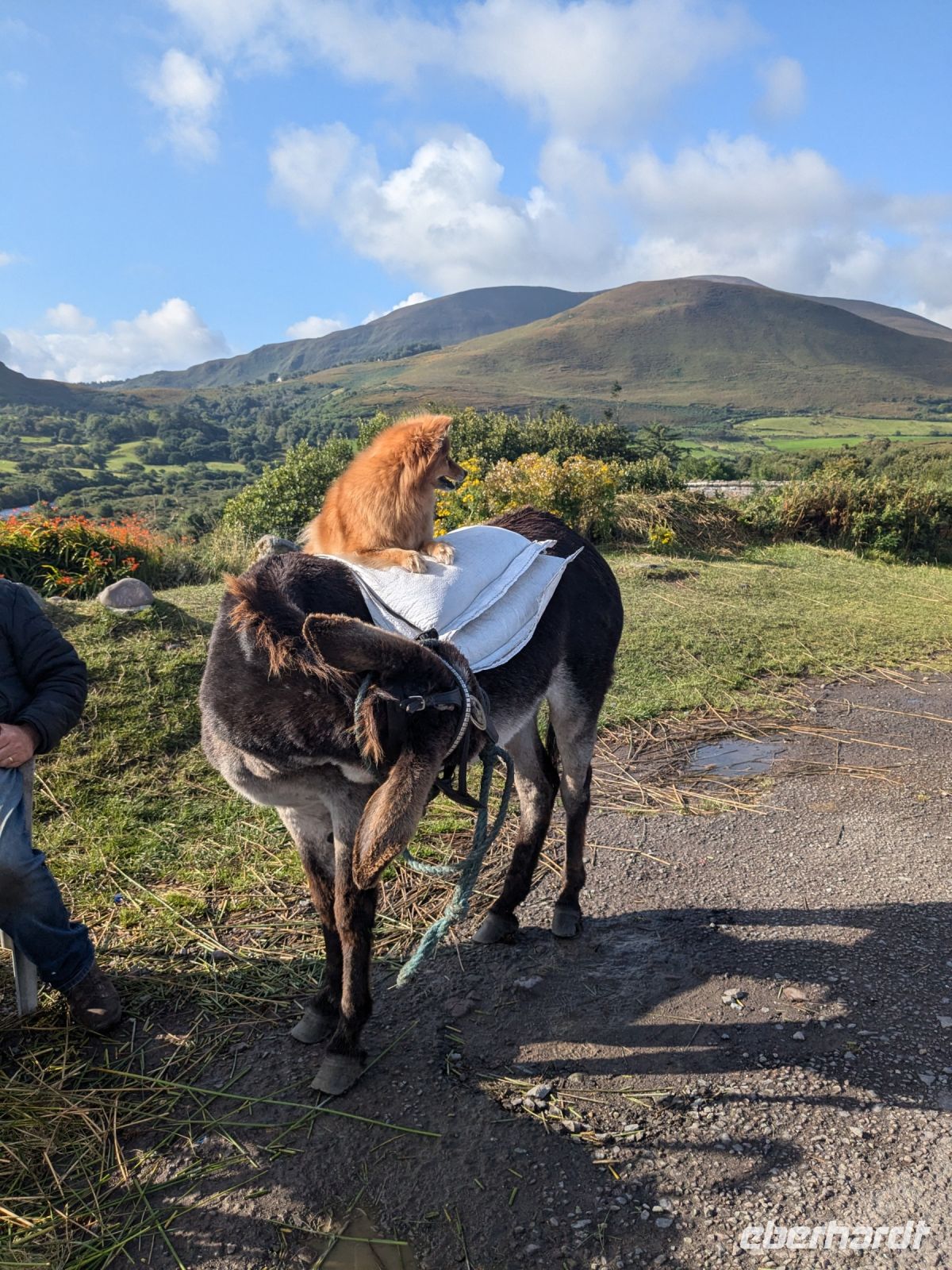 Anschließend hielten wir am Caragh River Viewpoint, wo das Licht der Sonne den Fluss in Szene setzte und ein Hund entspannt auf einem Esel ruhte – ein unerwartet charmanter Anblick.