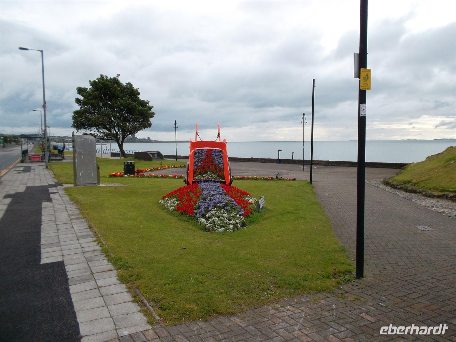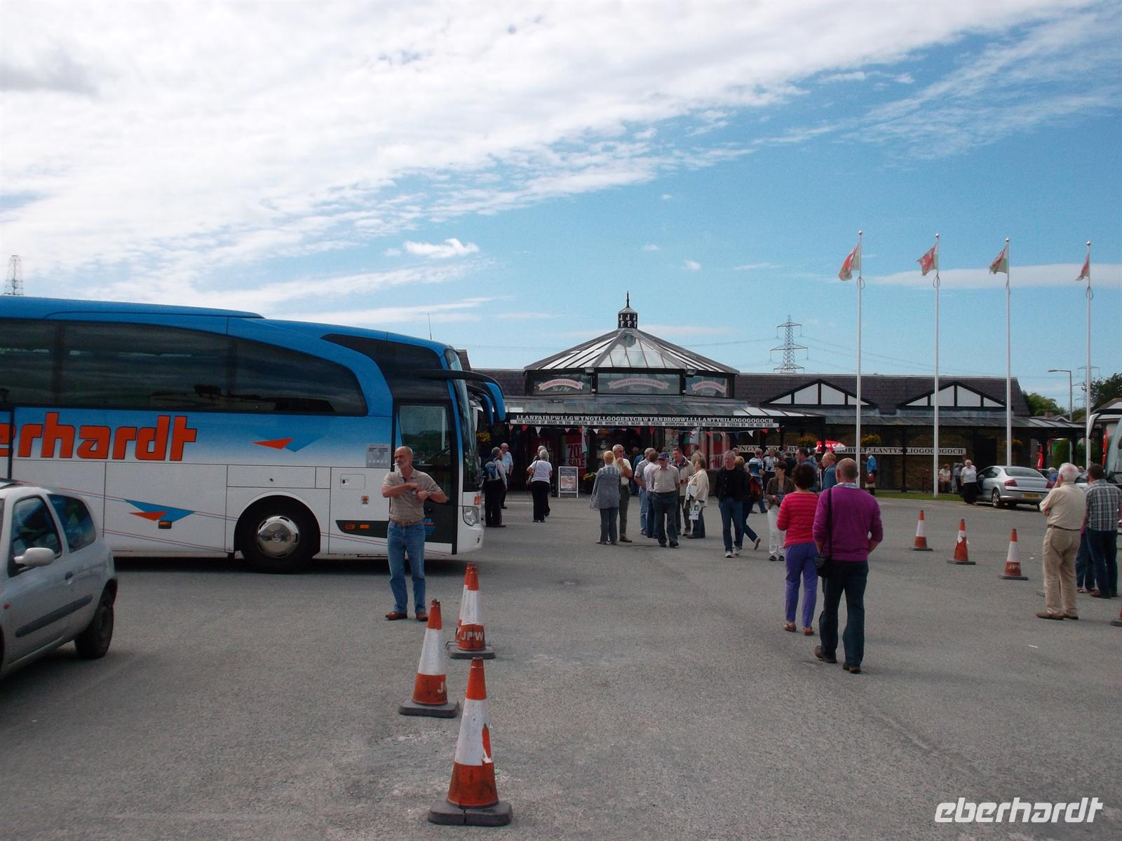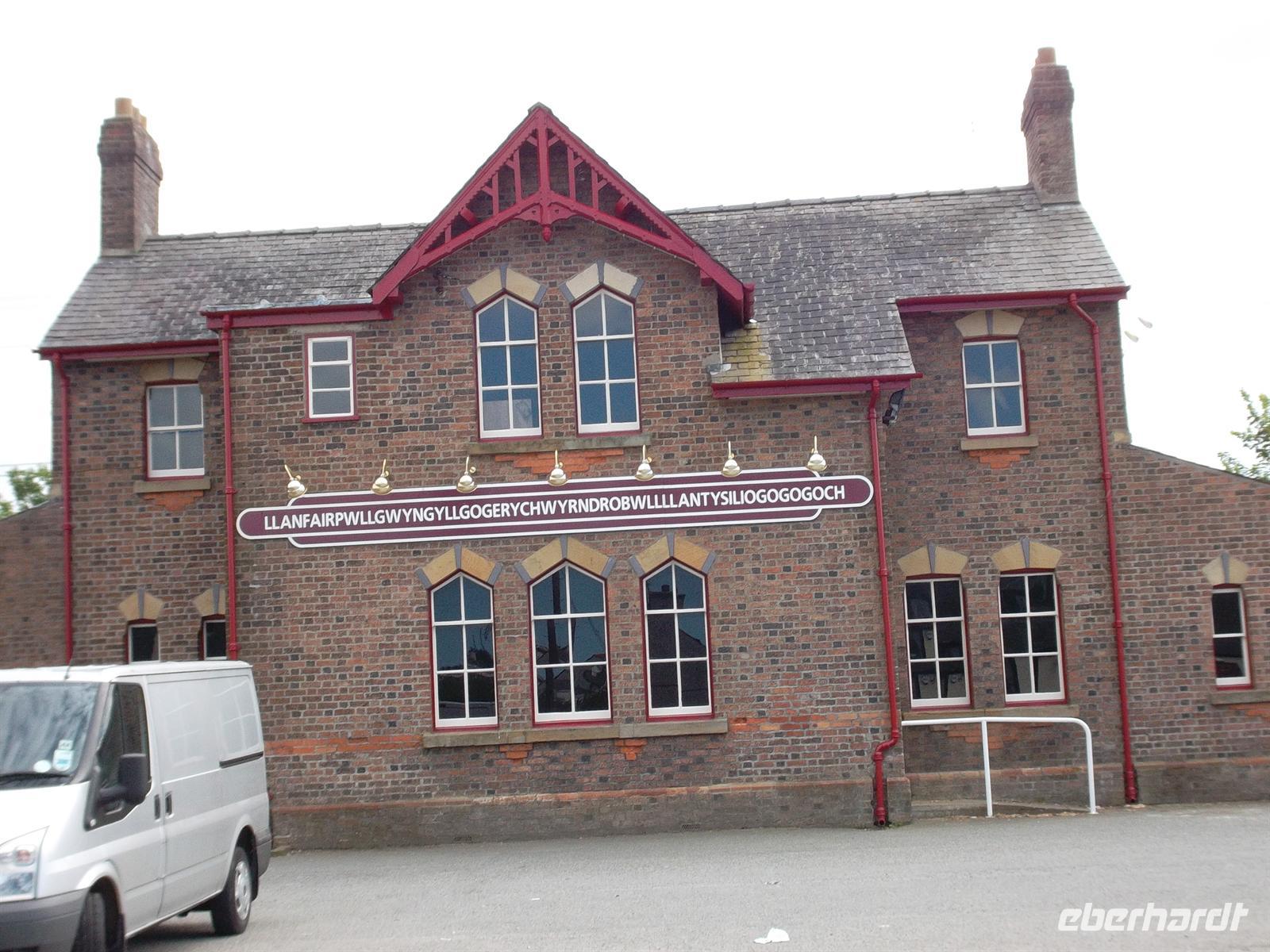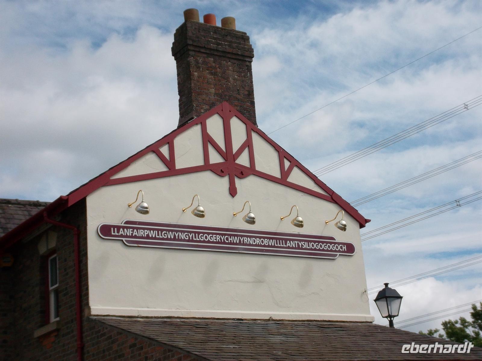 Doch auch nun ging es noch nicht unverzüglich zur Fähre, denn nach Überquerung der malerischen Meerenge Menai-Strait, die die Insel Anglesey von Festland-Wales trennt, gelangt man in einen ungewöhnlichen Ort, touristisch bekannt für den längsten Ortsnamen Europas. Er steht am Besucherzentrum und der Eisenbahnstation und lautet Llanfairpwllgwyngyllgogerychwyrndrobwllllantysiliogogogoch.
