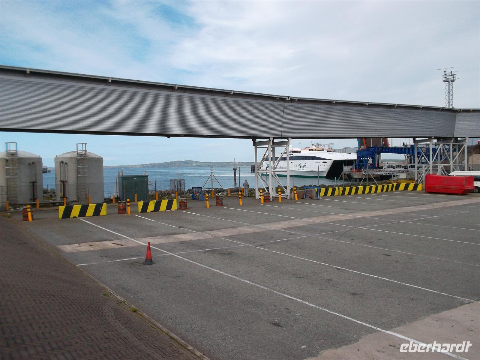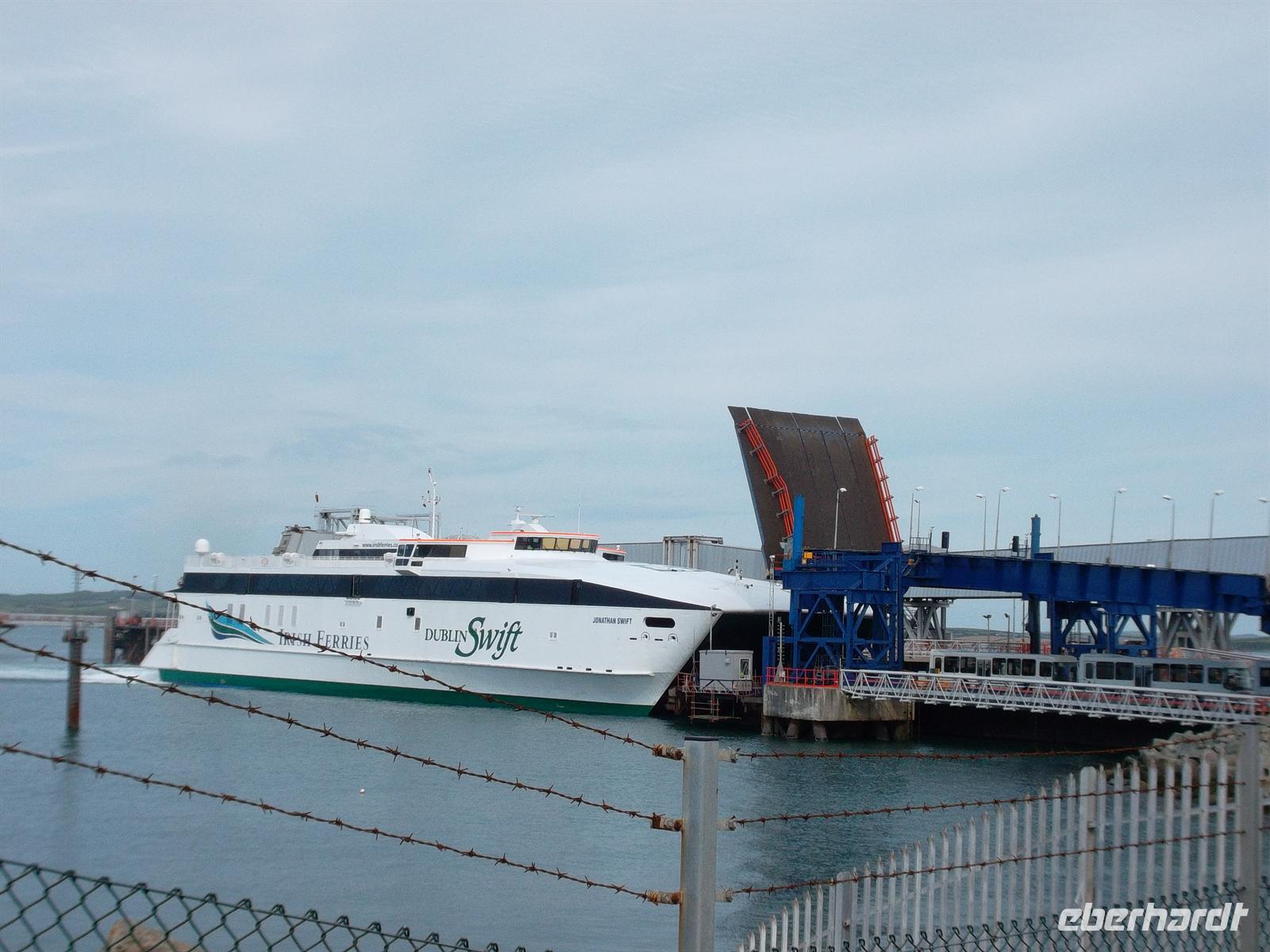 Er ist äußerst schwer auszusprechen, aber Sie wollen gern seine Bedeutung wissen? Er bedeutet Marienkirche () in einer Mulde () weißer Haseln () in der Nähe () eines schnellen Wirbels () und der Thysiliokirche () bei der roten Höhle ().“Wasserburg von Wales. Nach einem Stopp hier am Besucherzentrum fuhren wir weiter zur Fähre nach Holyhead und erreichten pünktlich die „Irish Ferries“ - bzw. deren Hochgeschwindigkeitsschiff „Jonathan Swift“. Diese HSS-Fähre überquert die Irische See in weniger als zwei Stunden und wir erreichten - nach verspäteter Abfahrt erst kurz nach 20.00 Uhr irischen Boden. Da das bequeme „Jurys Inn“ Hotel nahe beim Hafen und dicht an der Dubliner Innenstadt liegt, waren wir im Nu da. Nach raschem Check in trafen wir uns dann noch zum Abendessen, nachdem ich vorher noch unsere drei diesjäöhrigen Fluggäste hatte begrüßen können.