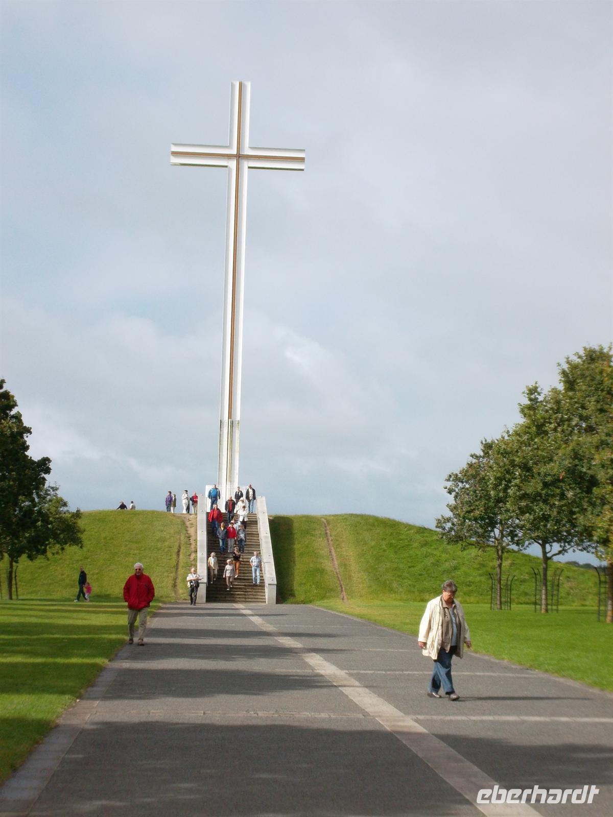 Nach der Mittagspause auf dem Parkplatz hier ging es weiter. Wir konnten als Extra einen Abstecher nach Knock einbauen. Irlands bedeutendster Wallfahrtsort hat extra für den Papstbesuch 1979 einen Flughafen gebaut. Religiös bedeutsam wurde er durch seine Marienerscheinungen im vorigen Jahrhundert, die seither tausende Gläubige und Heilungsbedürftige aus ganz Irland und aller Welt zu einer Wallfahrt hierher veranlassen.
