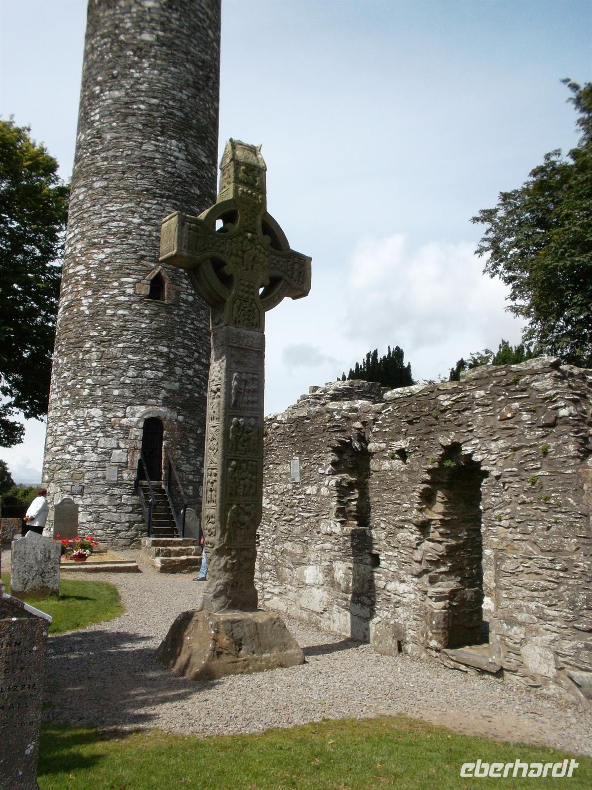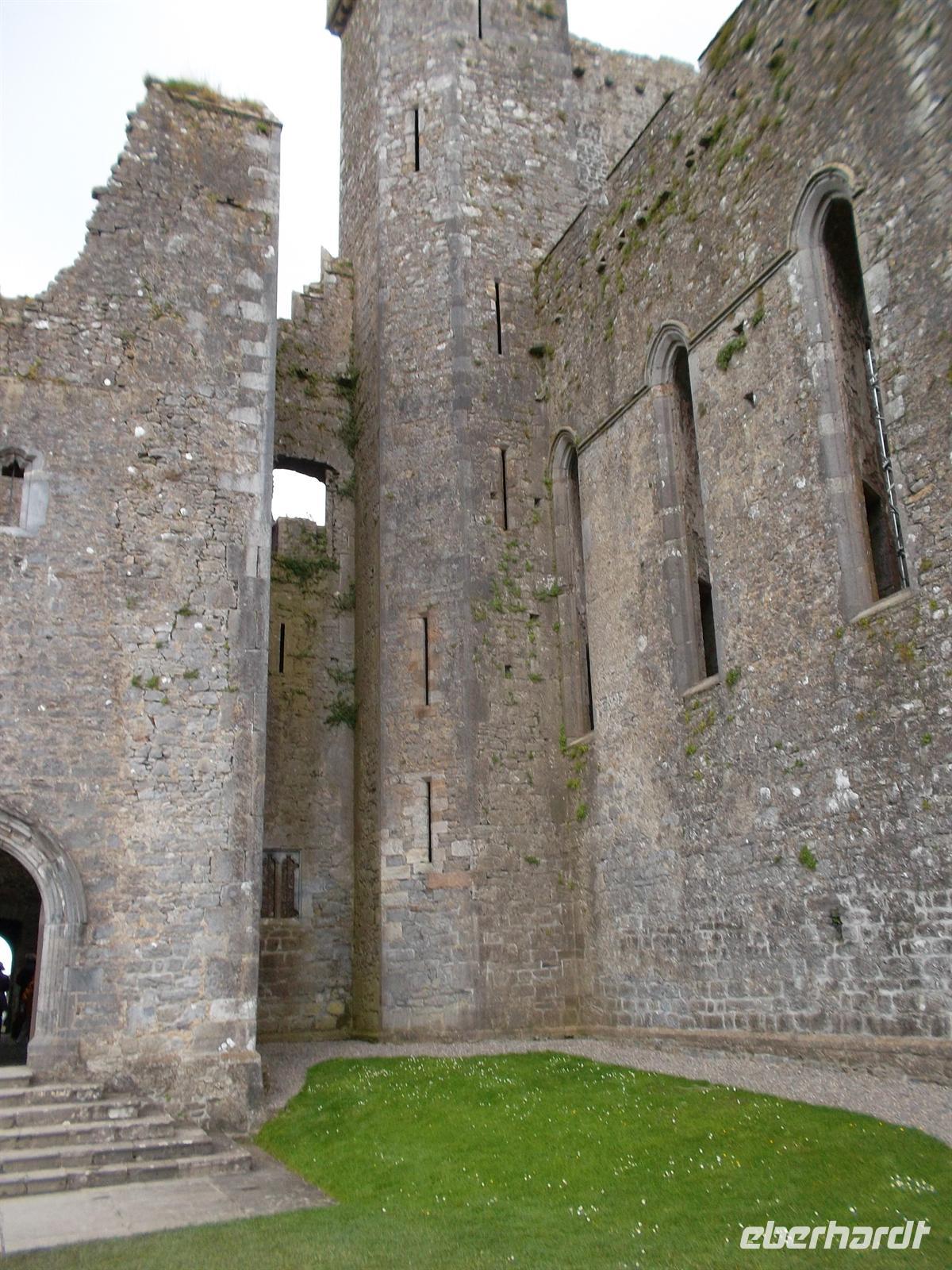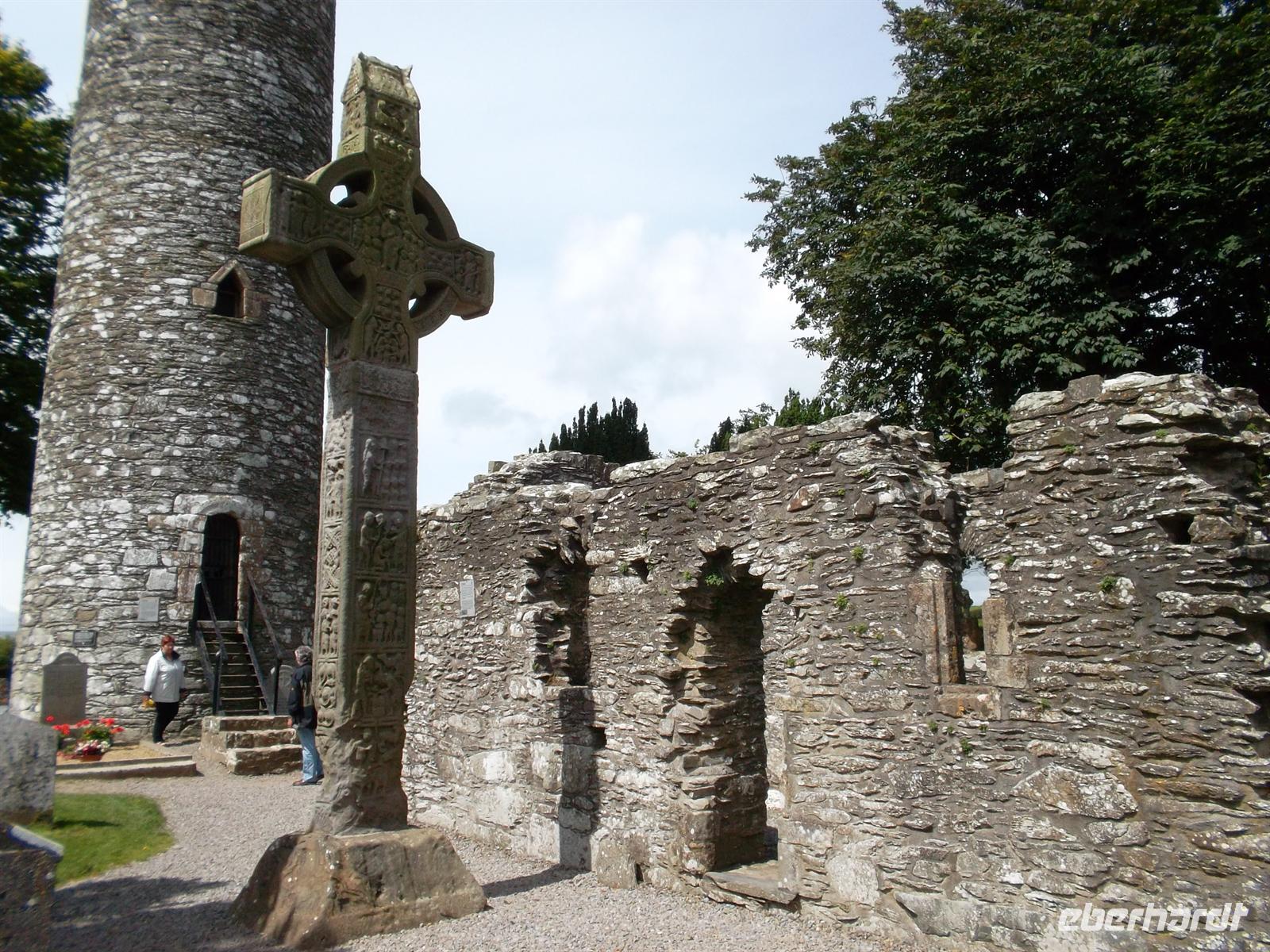 Nach der Bordverpflegung am Bus ging es zur letzten offiziellen Besichtigung in Irland, dem „Rock of Cashel“. Der historische, schon von weitem beeindruckend aussehende Gebäudekomplex, thront auf einem aus der Ebene um vielleicht 80 m herausragenden Felsen. Die Bauten sind die Reste des einstigen Regierungssitzes des Königreiches Munster und enthalten neben den beeindruckenden Ruinen der Kathedrale und der Burg das älteste Hochkreuz der britischen Inseln. Der heilige Patrick selbst, Schutzpatron von Irland, soll hier den König von Munster, Aenghus, getauft und damit die Christianisierung Irlands eingeleitet haben.