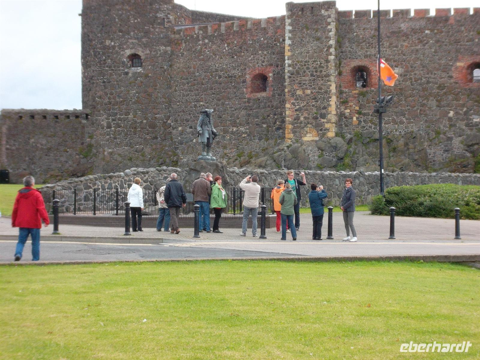 Auf einer der schönsten Routen in Nordirland, der Küstenroute von Belfast über Larne bis Ballycastle fuhren wir heute von Fotostopp zu Fotostopp. Zunächst am wuchtigen, auf einem Basaltfelsen erbauten Carrickfergus Castle, vor dem die Statue von William III. von Oranien, steht, der gleichzeitig Statthalter der Niederlande und König von England war und hier 1690 mit seiner Armee landete, die im Juli in der „Schlacht am Flusse Boyne“ dann den entscheidenden Sieg der englischen Truppen über die irisch-schottischen Verbündeten des in England abgedankten Königs Jakob errang, die Irland weiter im Kolonialstatus hielt.