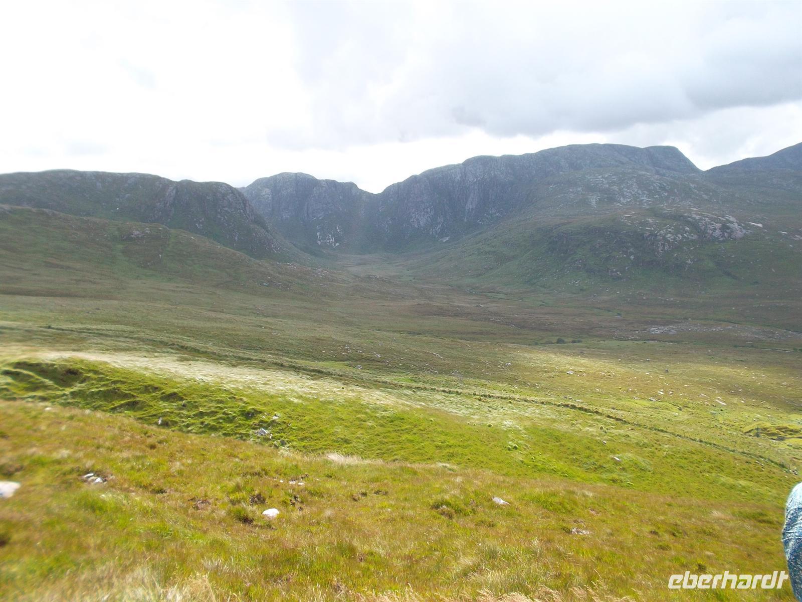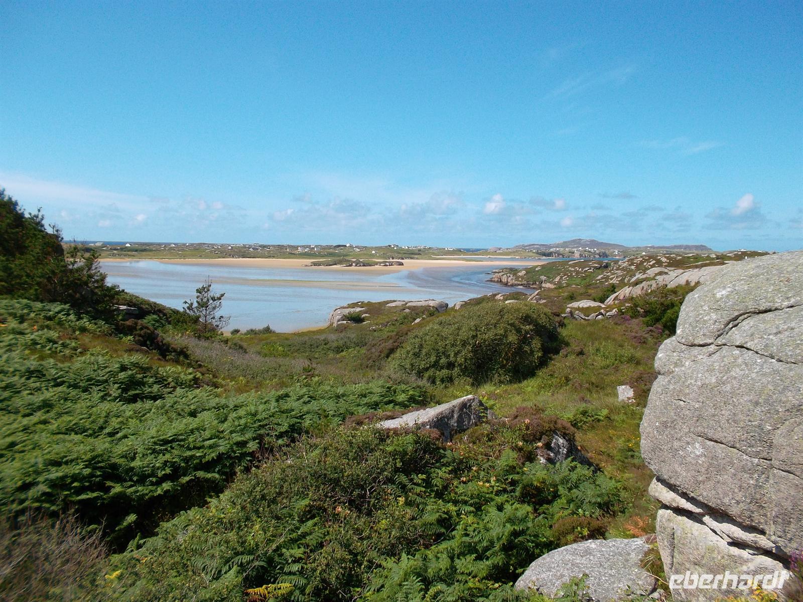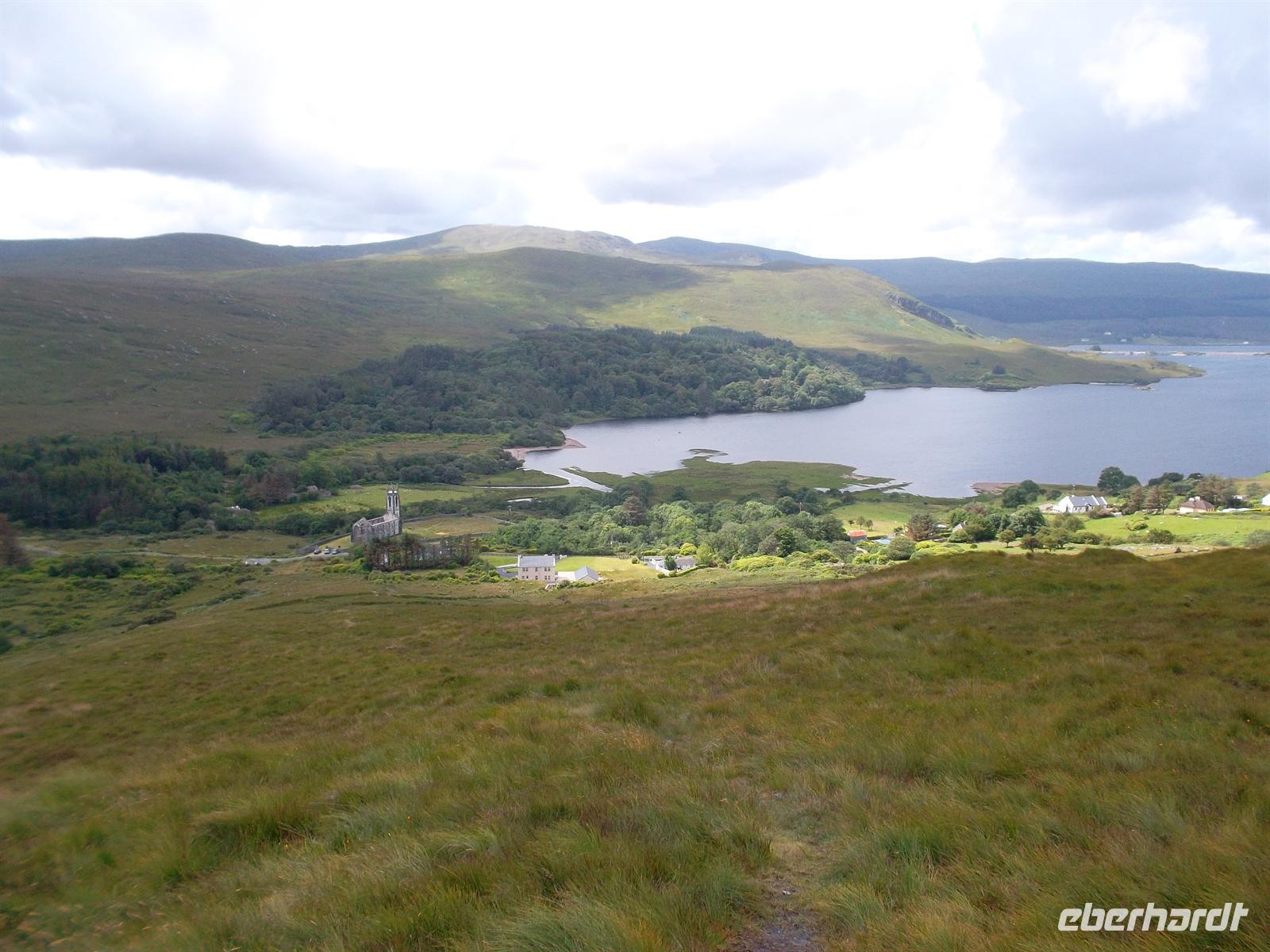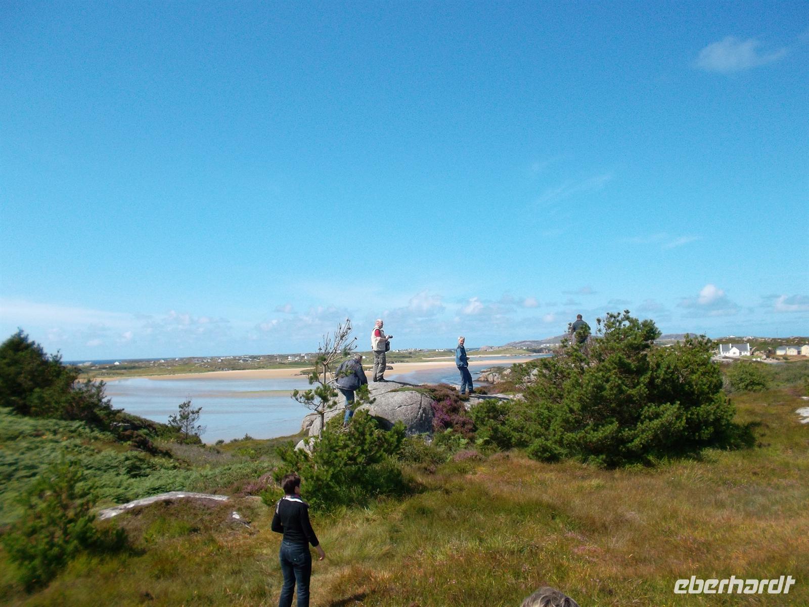 Danach war Zeit genug, um zum Busparkplatz zurückzuwandern, wer dass bei dem schönen Wetter wollte, oder per Shuttlebus zurückzukehren. Nach Mittagessen vom Bordservice setzen wir unsere Fahrt entlang des Mount Erigal mit mehreren Fotostopps fort. Über zahlreiche kleine Straßen durchquerten wir die interessante Landschaft und winzigen Dörfchen der Region „The Rosses“ die noch zur „Ghaeltacht“ gehört und in der überwiegend irisches Gälisch gesprochen und geschrieben wird.