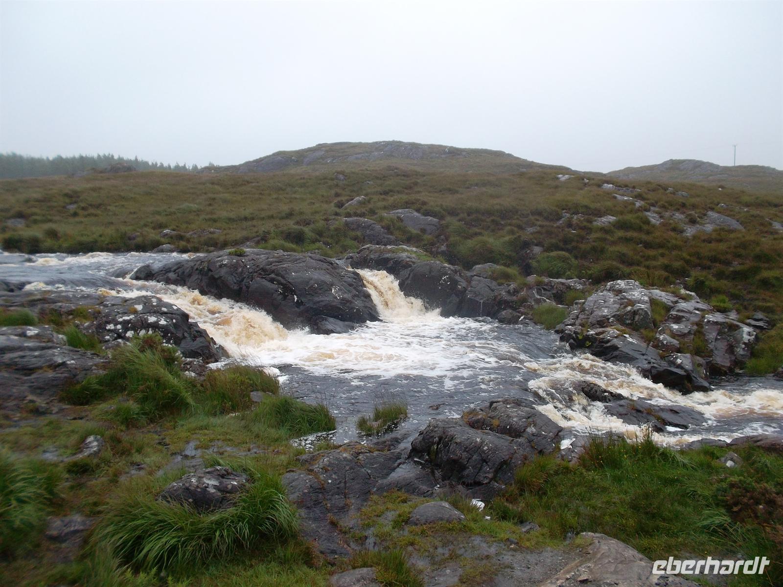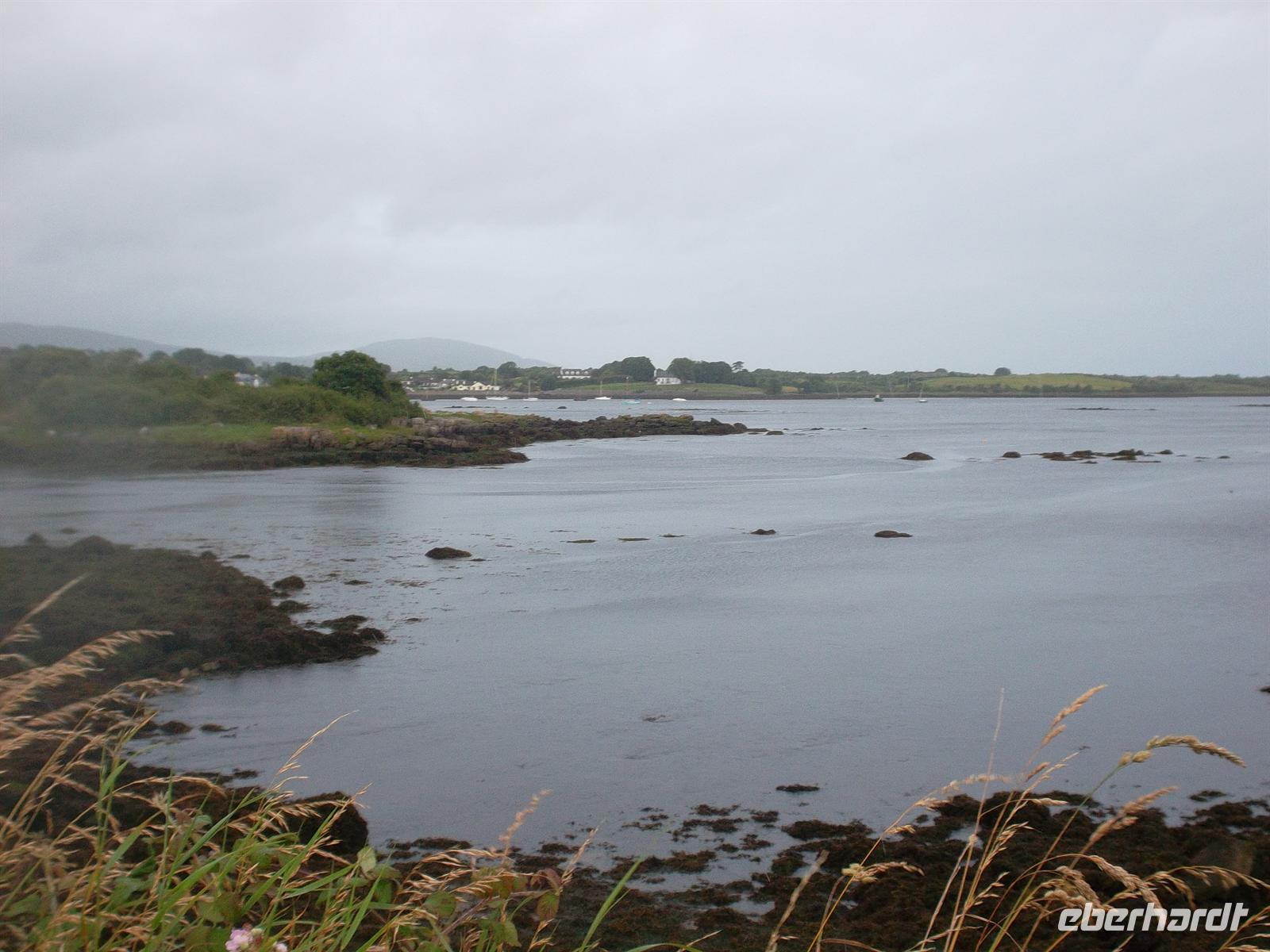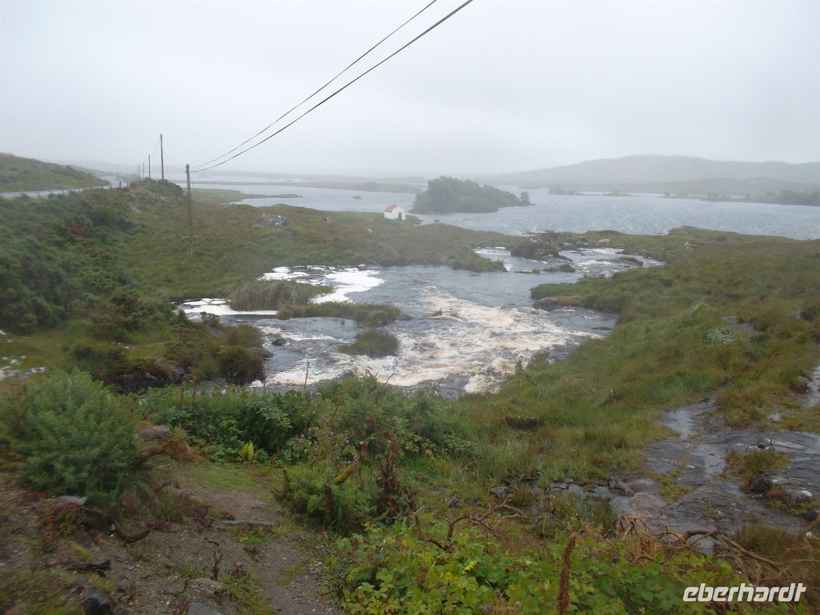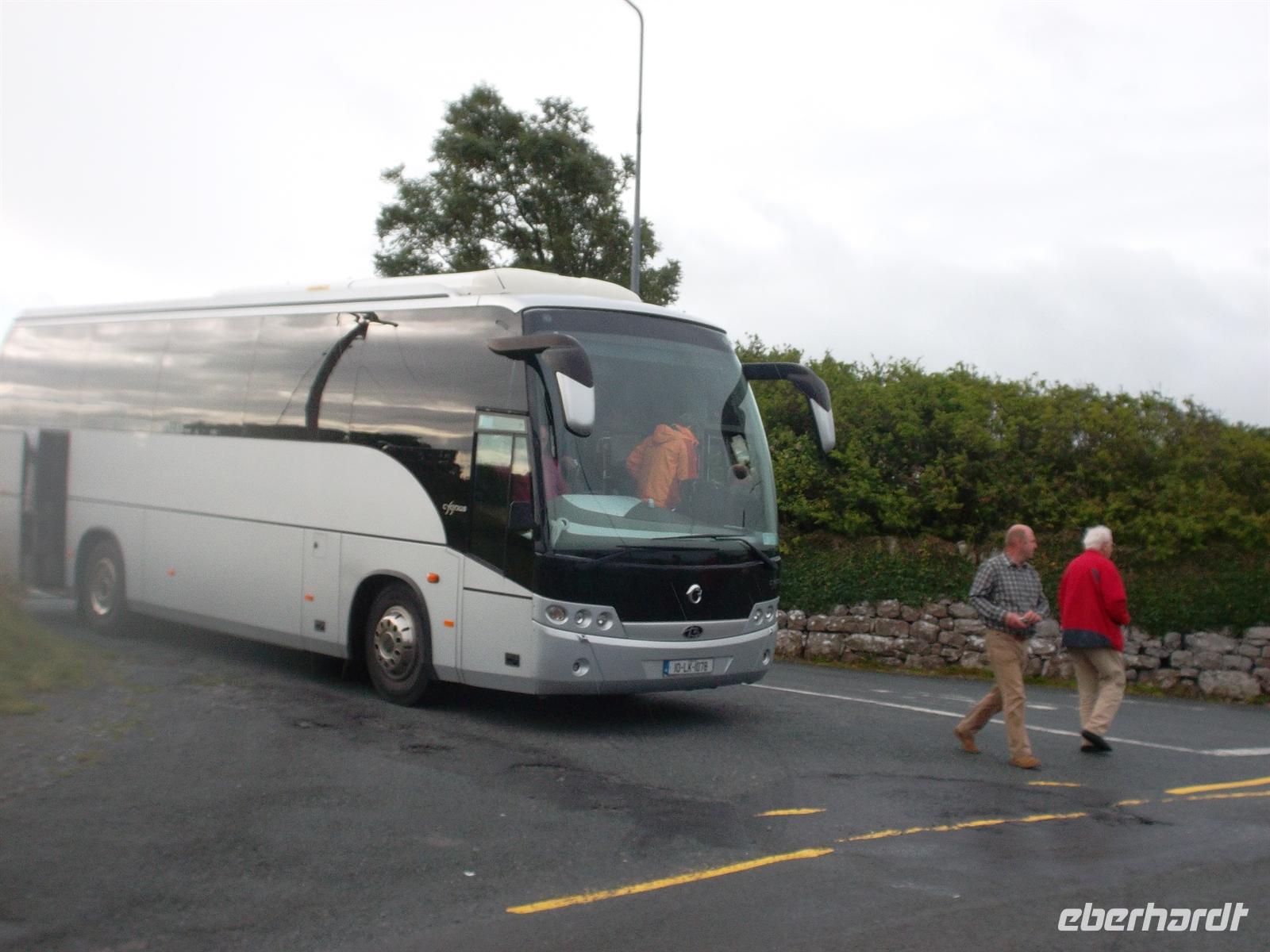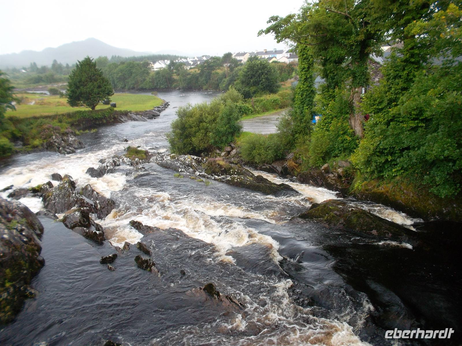 Da unser Buschauffeur Andreas Marx heute seinen Ruhetag hatte, holte uns Alan von der Firma Martin Coaches mit einem irischen Bus ab (im Bequemlichkeitstest hat er gegen unseren 5-Sterne-Bus leider verloren!) zur Connemara-Rundfahrt. Nach einem Fotostop am am Weg gelegenen malerischen Dunguaire Castle und an Galway vorbei erreichten wir die Küstenstraße nördlich der Galway Bay. Nach Toilettenstopp in Spideal ging es ins Herz von Connemara, einer Region im irischen Westen, die weitgehend auch der gleichnamigen Halbinsel entspricht. Geprägt von Moor- und Heideflächen und den Bergen im Norden, gilt Connemara häufig als der „grünste Teil“ Irlands. Wir folgten der Küstenstraße, die dann ins Landesinnere abbog, während das Wetter schlechter wurde und es zu nieseln begann. Zwischen Torfmooren, Sumpf- und Felslandschaften gelangten wir - nach Fotstostopp an einigen malerischen Stromschnellen - und wieder ein Stück auf der Hauptstraße fahrend, gegen Mittag in die inoffizielle „Hauptstadt“ der Region Connemara, nach Clifden. In diesem Städtchen mit vielleicht 1500 Einwohner, machten wir in der von Geschäften und Pubs geprägten Hauptstraße unsere Mittagspause.