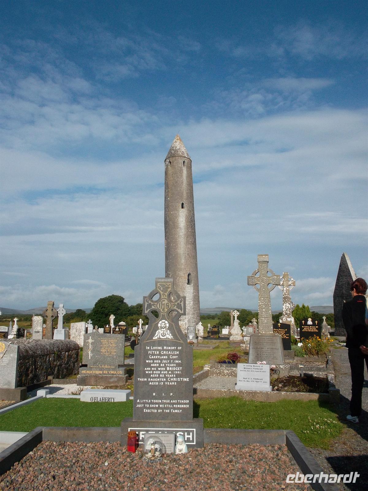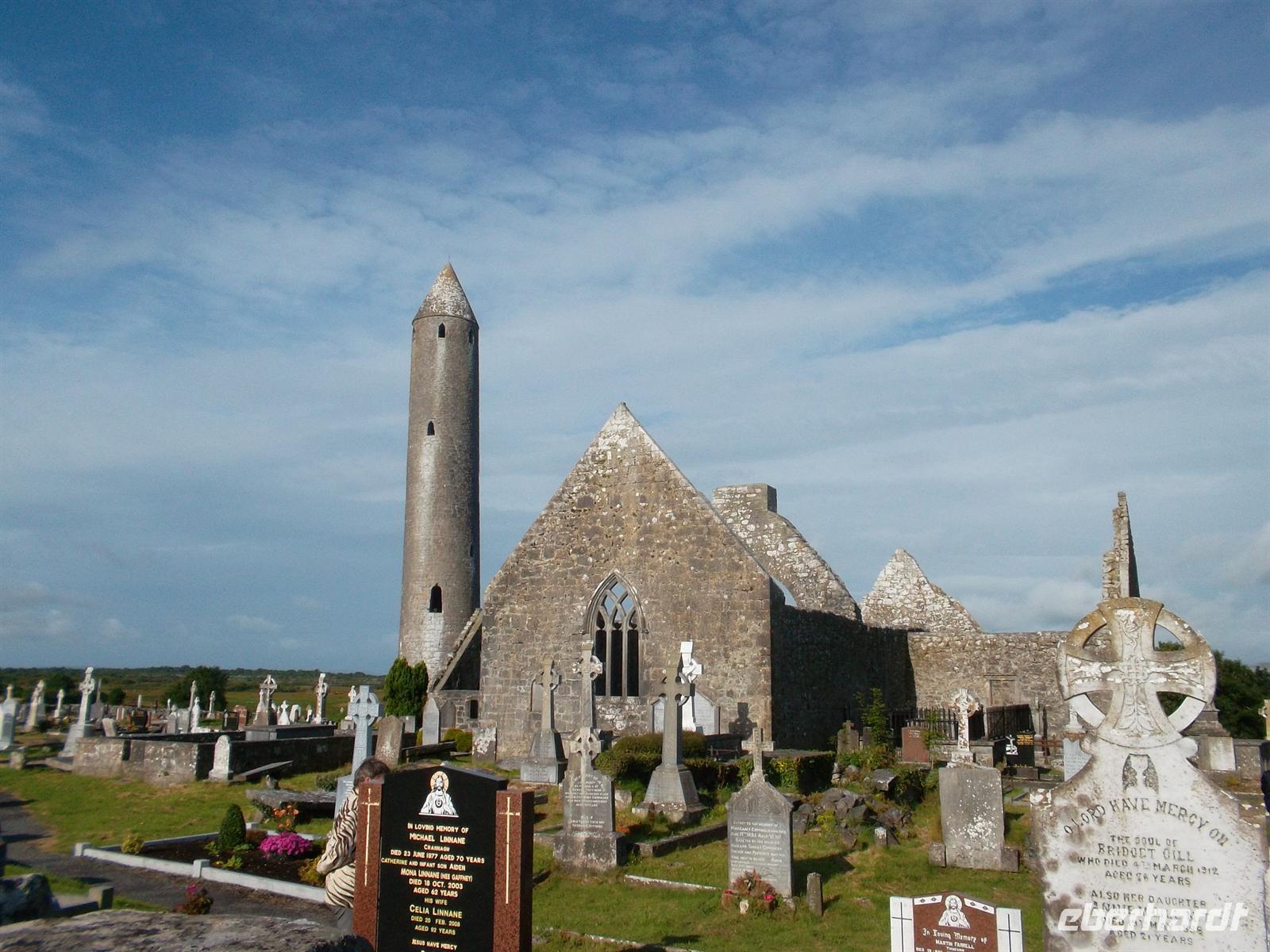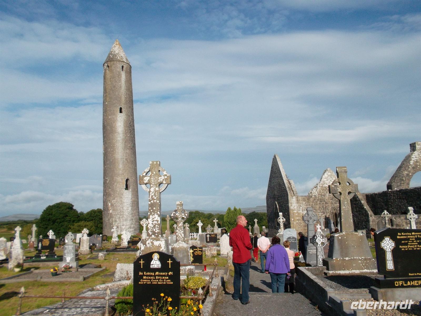 Heute waren wir bei etwas besserem Wetter wieder mit dem eigenen Bus unterwegs und besuchten zunächst die nahe Gort gelegene alte Klostersiedlung Kilmacduagh. Sie war zeitweise sogar Bischofssitz, was der Kirchenruine den Rang einer Kathedrale verleiht. Der (schiefe) Rundturm gehört zu den bestbewahrten in Irland. Er ist 30 m hoch, weist eine Abweichung von 60 cm aus der Senkrechten auf und stammt ungefähr aus dem 12. Jahrhundert.