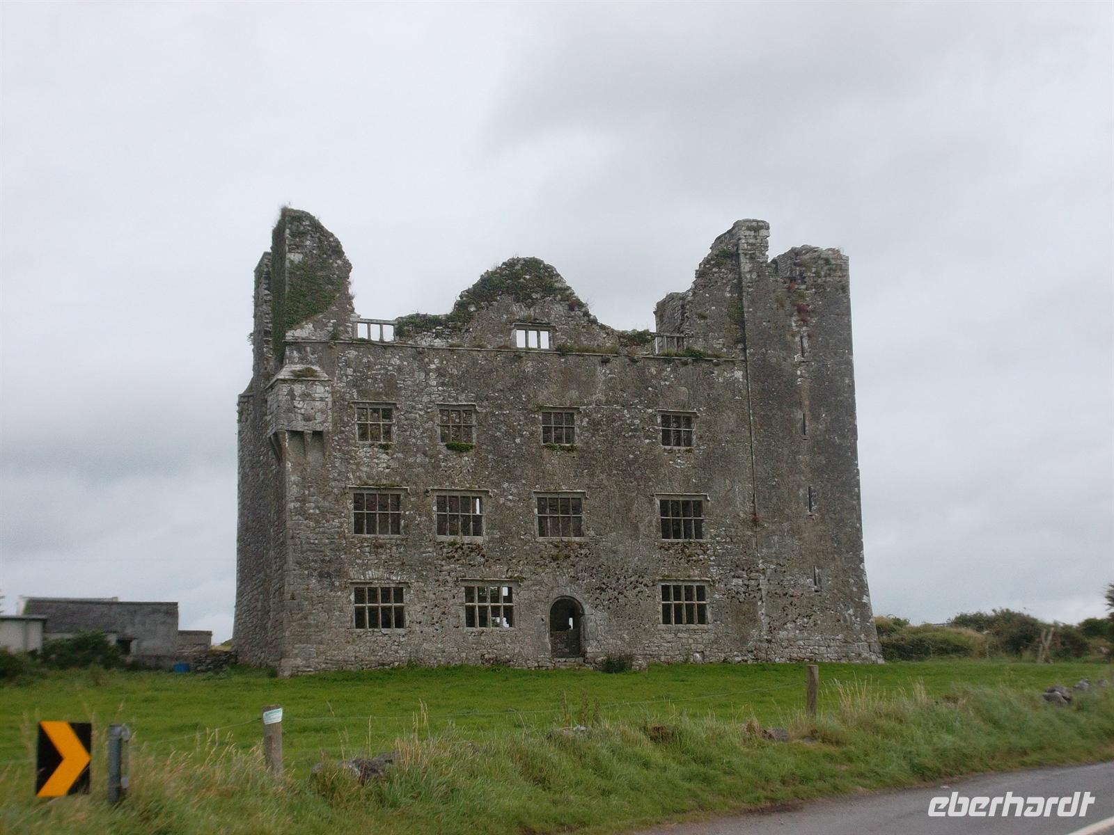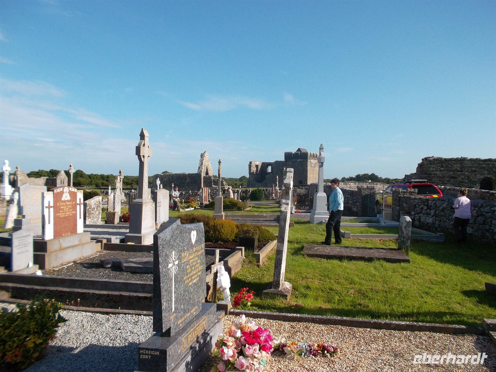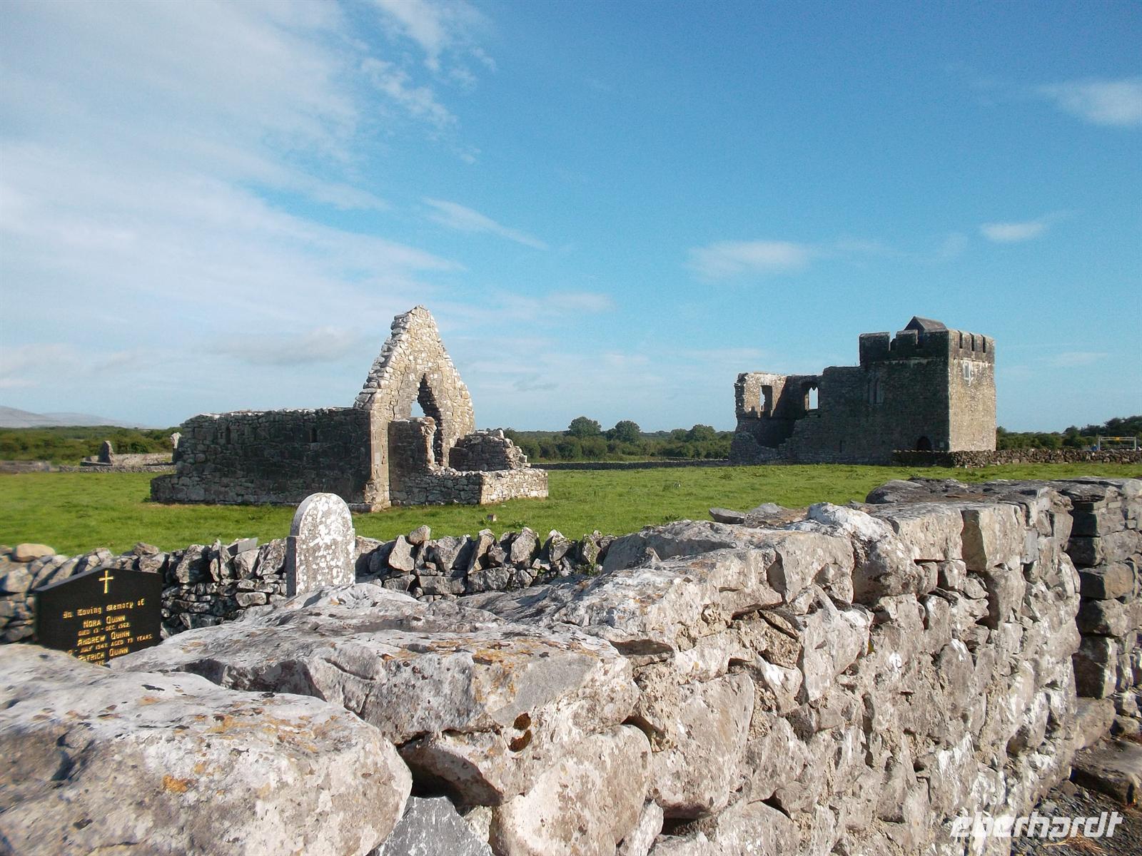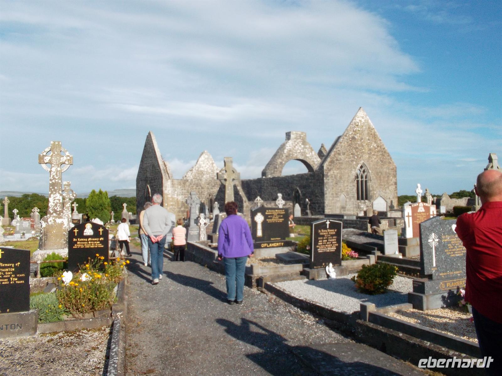 Heute waren wir bei etwas besserem Wetter wieder mit dem eigenen Bus unterwegs und besuchten zunächst die nahe Gort gelegene alte Klostersiedlung Kilmacduagh. Sie war zeitweise sogar Bischofssitz, was der Kirchenruine den Rang einer Kathedrale verleiht. Der (schiefe) Rundturm gehört zu den bestbewahrten in Irland. Er ist 30 m hoch, weist eine Abweichung von 60 cm aus der Senkrechten auf und stammt ungefähr aus dem 12. Jahrhundert.