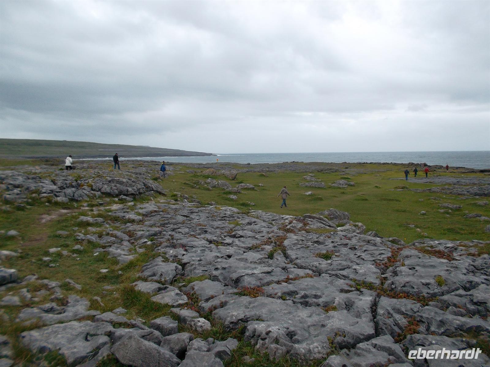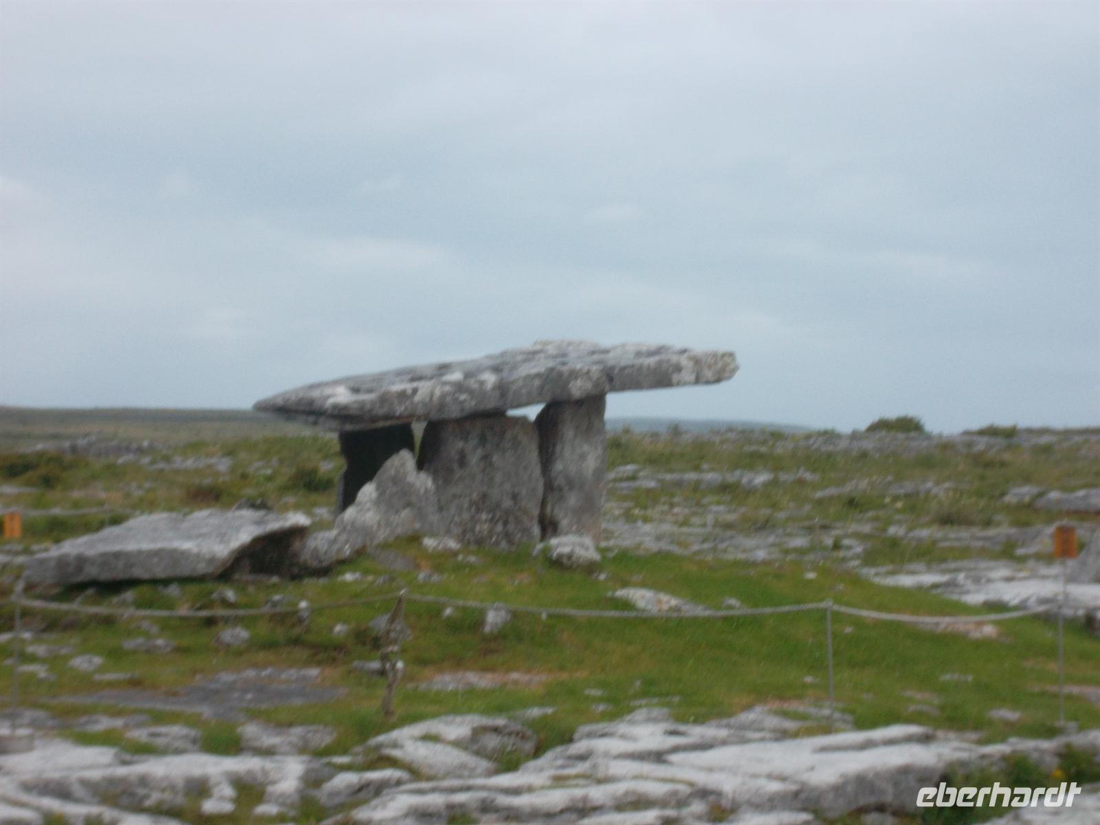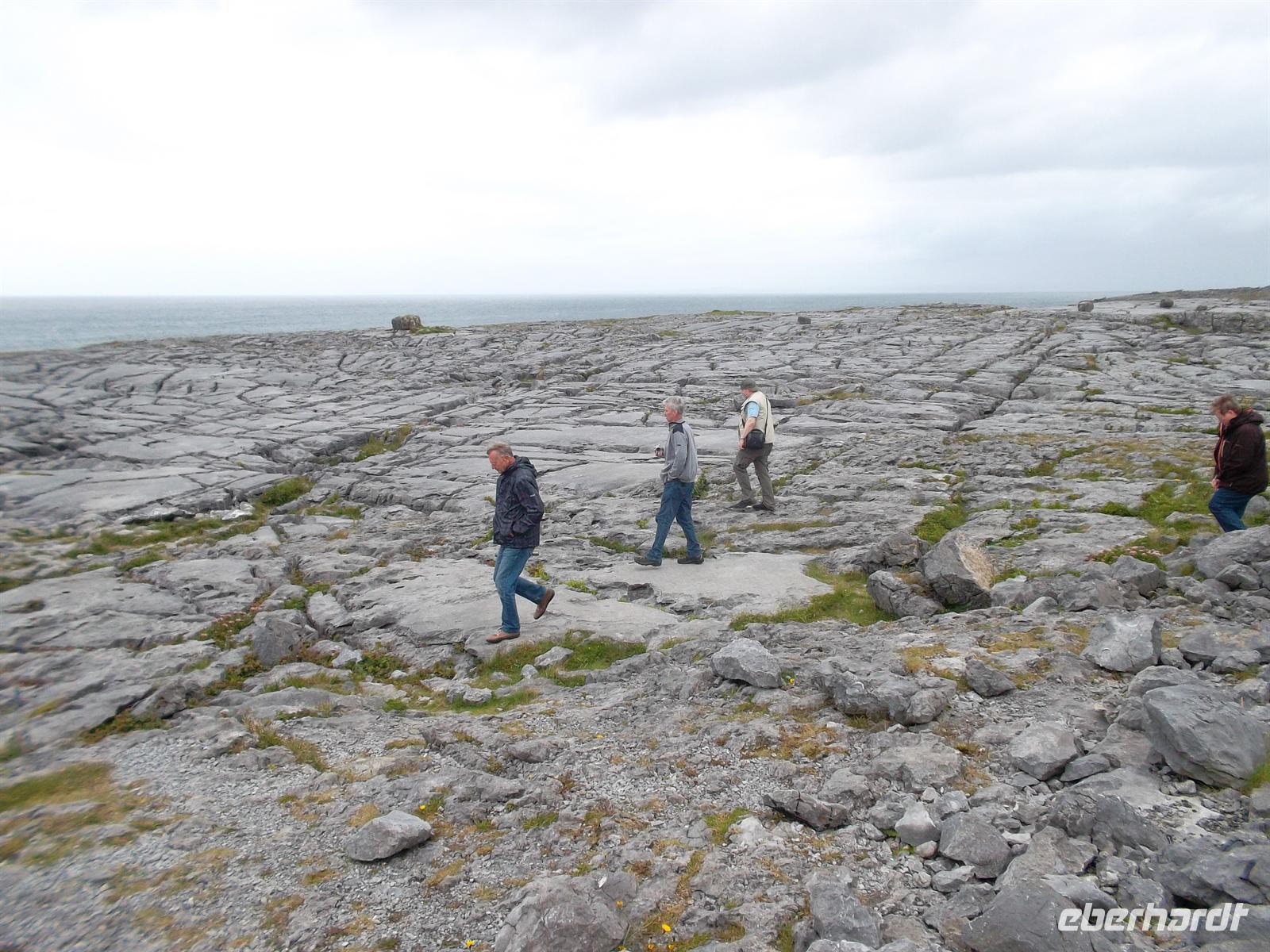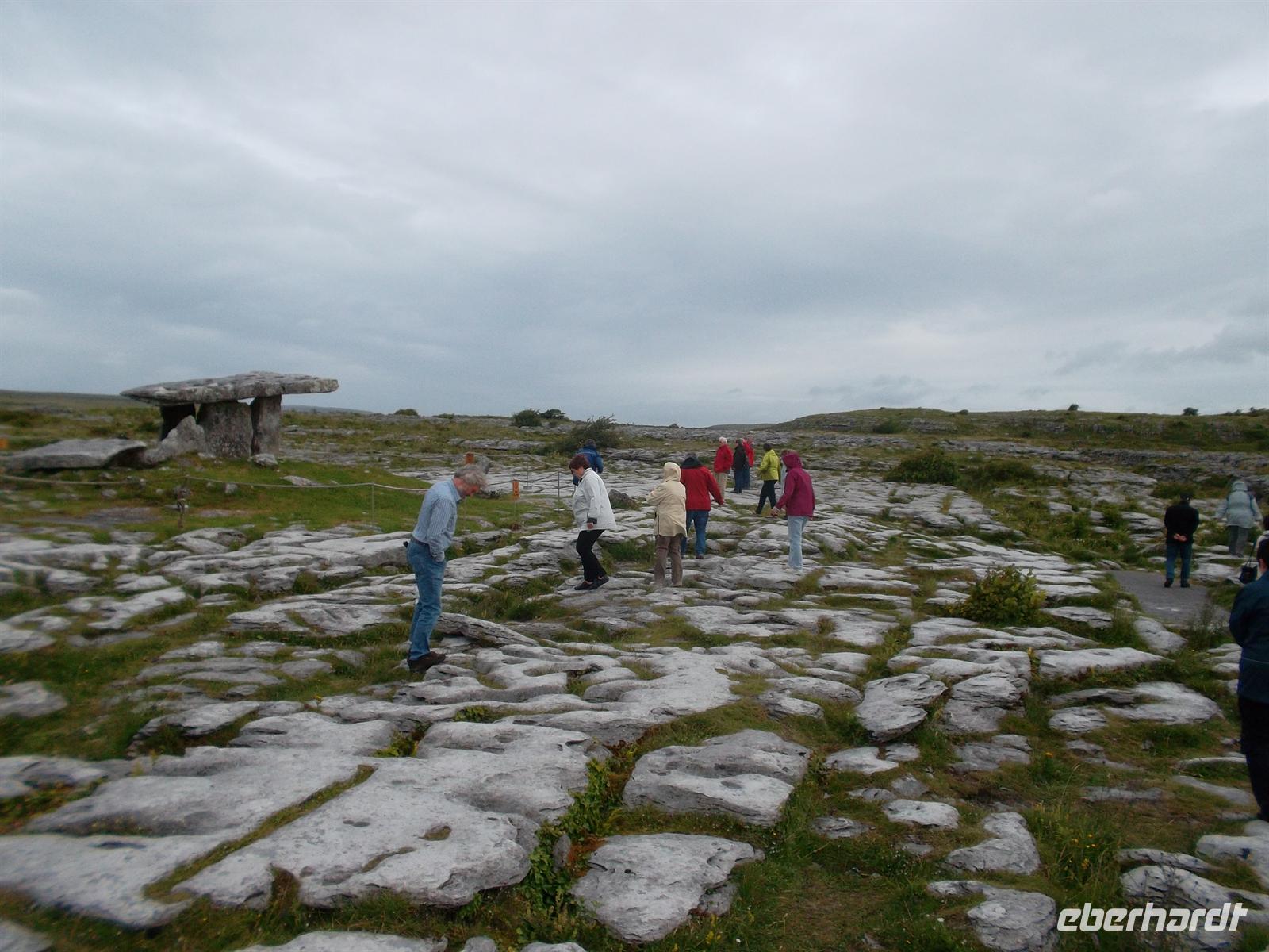 Nach ausgiebigem Fotostopp hier erkundeten wir heute die „Steinöde“ des Burren. Diese einzigartige Karstlandschaft ist etwa 250 km² groß und ihre Oberfläche ist zumeist durch etwa knietiefe Gräben, die „Grykes“ in rechteckige Felder gegliedert. Sie wurden durch Oberflächenwasser gebildet, das sich auch heute noch nach stärkeren Regenfällen in sogenannten Turloughs (Tümpeln) sammelt und den Kalk nach und nach auflöst. Dadurch trennten sich auch horizontal die Platten durch Klüftung als sogenannte „Clints“ voneinander. Sie wurden oft beim Bau der älteren Steindenkmäler verwendet, z.B. beim Pulnabrone Dolmen, einem Steinzeitgrab aus Kalksteinplatten.