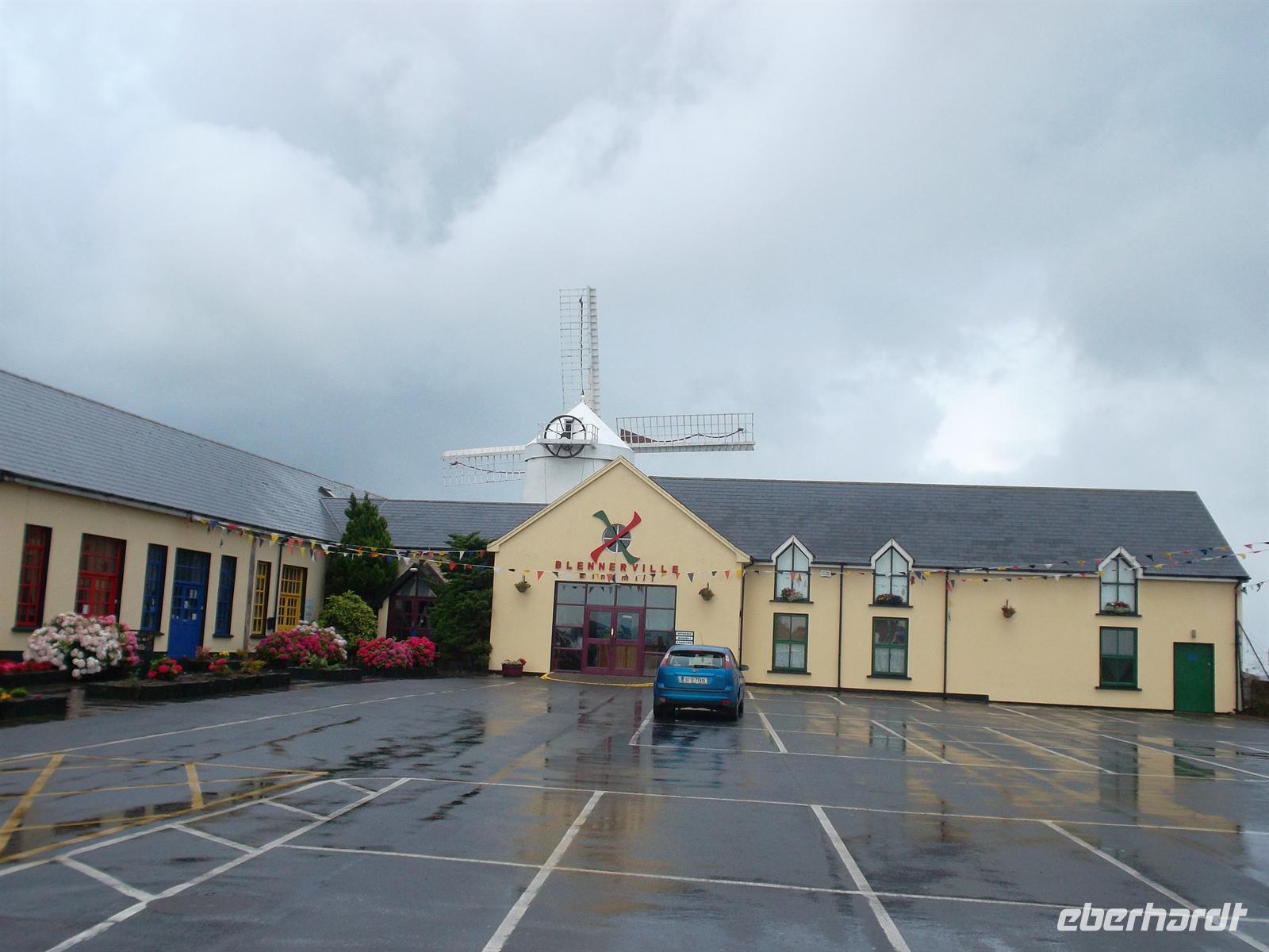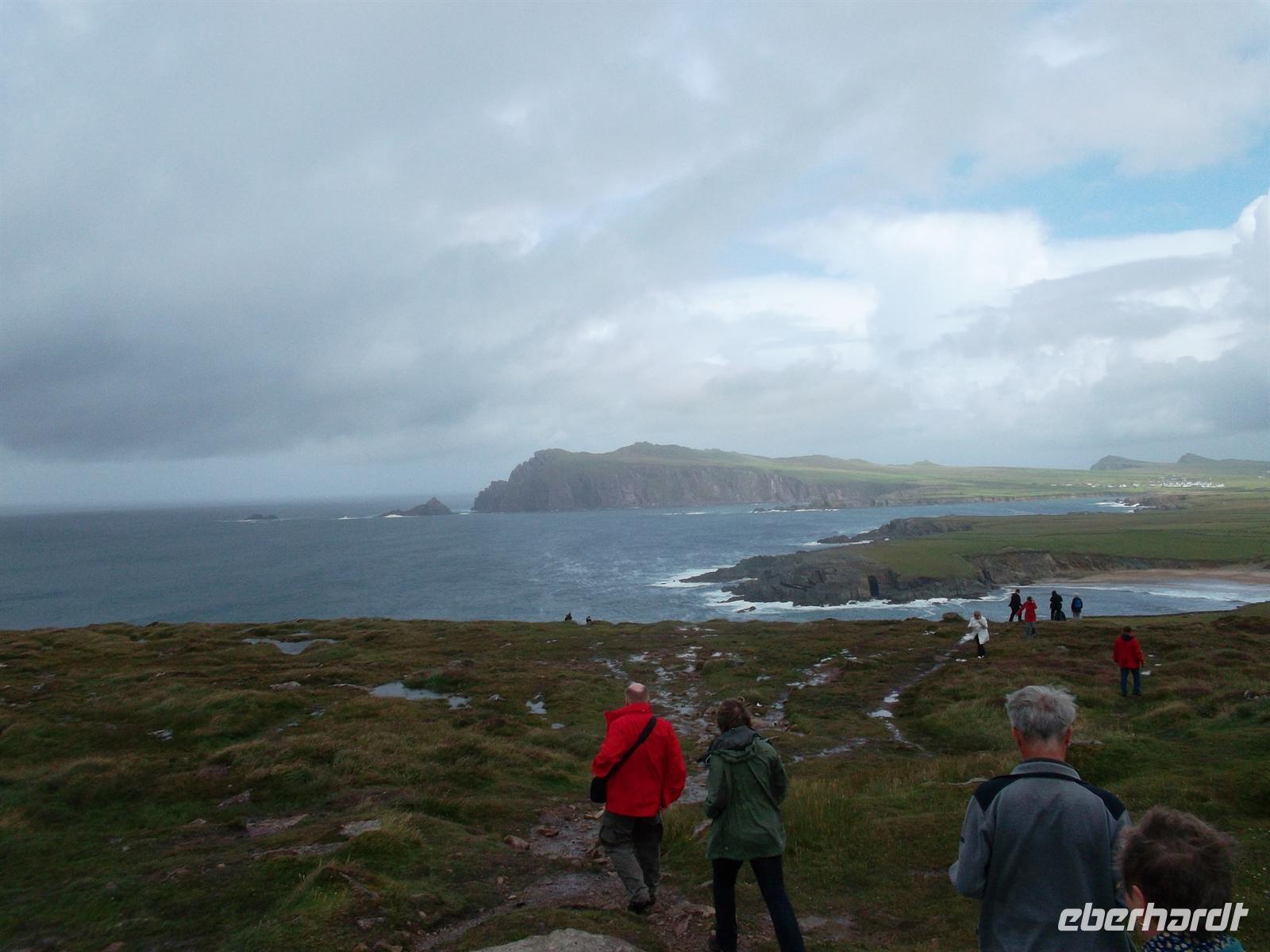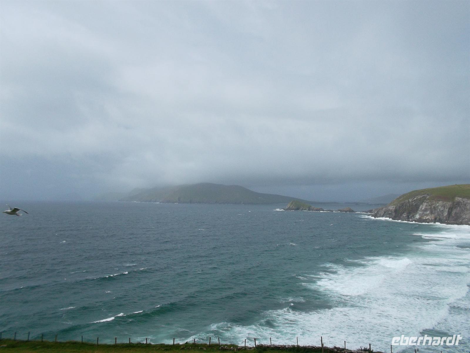 Heute war das Wetter allerdings wieder schlechter geworden. Auf dem Weg zur Halbinsel Dingle, unserem heutigen Ausflugziel, begann es zu nieseln. Ein erster Fotostopp kurz nach Tralee zeigte uns die Mühle von Blennerville, Einde des 19. Jh. als Kern eines jkleinen Industriegebietes errichtet. Vom folgenden Aussichtspunkt war ein Blick auf die Bucht von Tralee möglich. Als wir Dingle, den Hauport der Halbinsel erreichten, war das Wetter wieder fast trocken. Das malerische Städtchen mit etwa 1800 Einwohnern gilt als westlichste Stadt Europas und ist sehr malerisch. Buntbemalte Häuschen mit ihren hübschern Ladenschildern und die pittoreske Hafenszenerie bilden den Hauptreiz. Später nahm der Bus den Weg auf einer der beliebtesten Aussichtsstraßen Irlands, der Küstenstraße des „Slea Head Drive“. Er führt entlang der Küste und ist eng und schwierig zu fahren - Schwerstarbeit für unseren Buschauffeur - aber ein Feuerwerk an Fotomotiven für uns. Historisches Flair vermittelten die unweit der Straße befindlichen „beehive-huts“, Bienenkorbhütten, die werden wegen ihrer Form so genannt und waren im 6 und 7. Jahrhundert Unterkünfte für Einsiedler-Mönche.