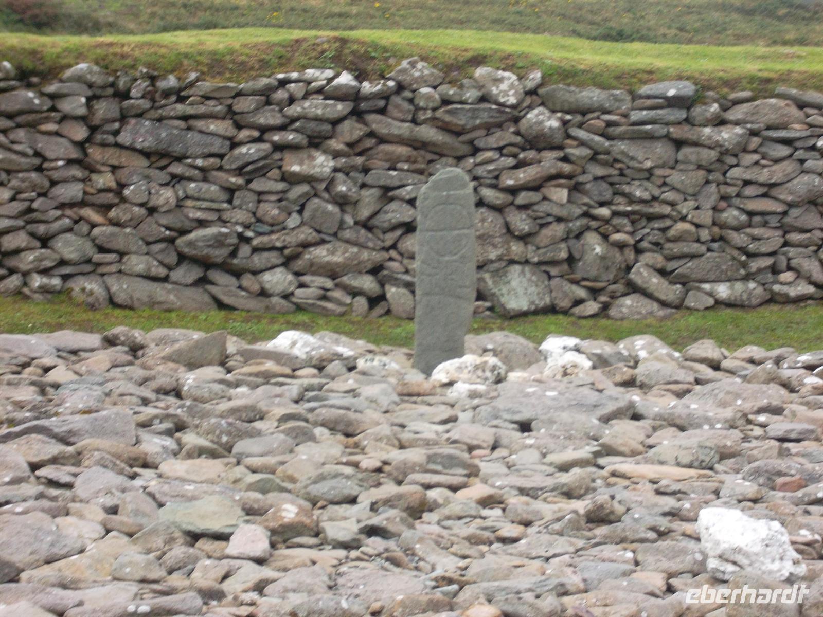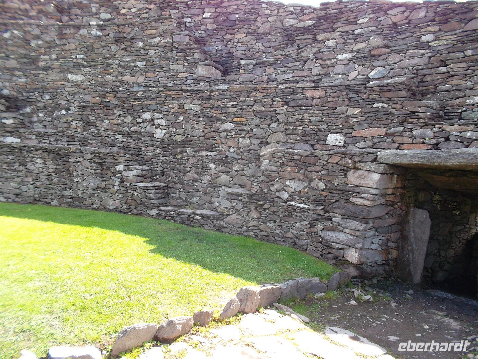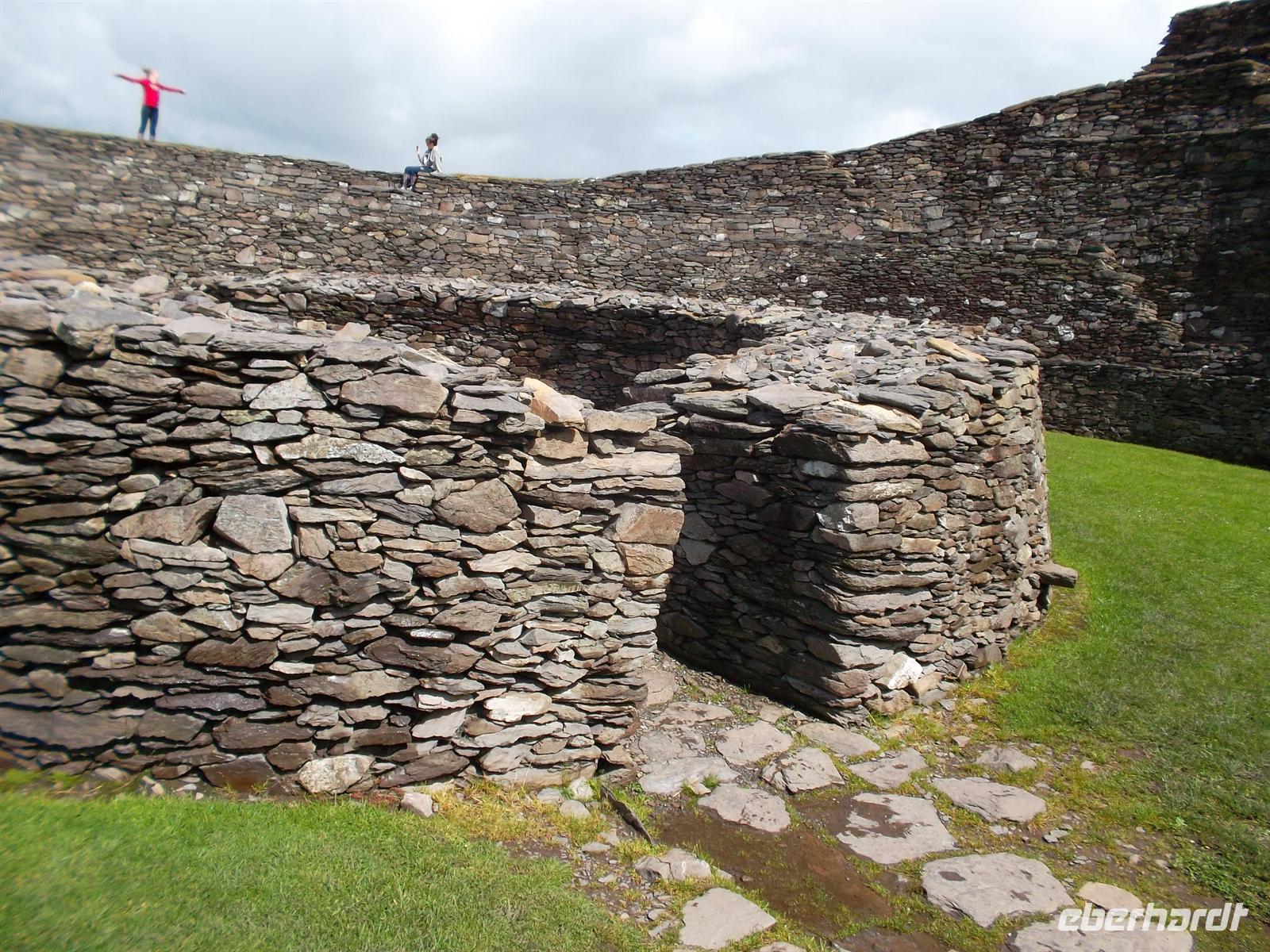 Wir verabschiedeten uns von Brendan mit seinem typisch irischen Humor und fuhren den Ring of Kerry weiter nach Cahersiveen. Das Wetter hatte sich merklich gebessert, langsam kam sogar die Sonne hervor. In Cahersiveen machten wir einen Fotostopp an der alten Polizeiwache, fuhren dann weiter zur Besichtigung eines typischen alten Ringforts. Solche „stoneforts“ dienten zunächst als Fluchtburgen, später als Adelssitze und mehr als dreihundert gibt es über Irland verstreut. Das von uns besichtigte - Cahergall stone fort - ist restauriert und gehört zu den kleineren. Dafür ist es perfekt gestaltet und hat begehbare Mauern.
