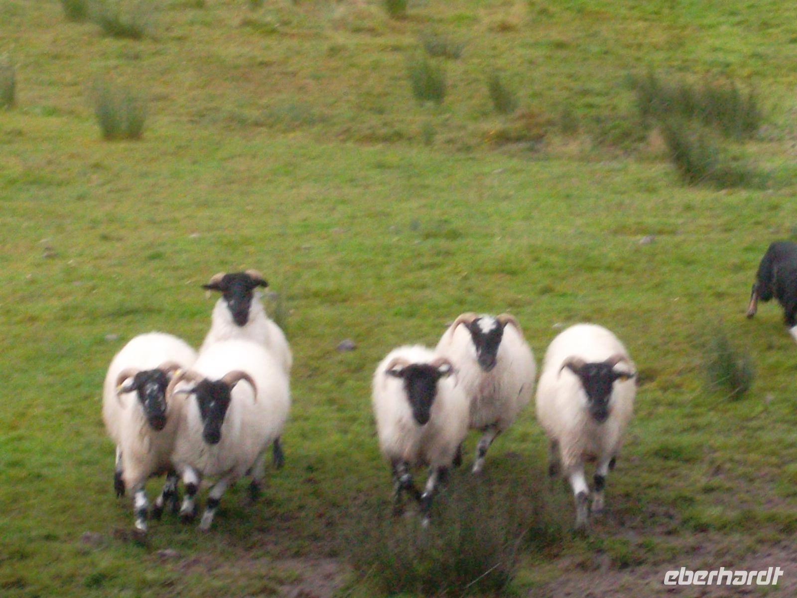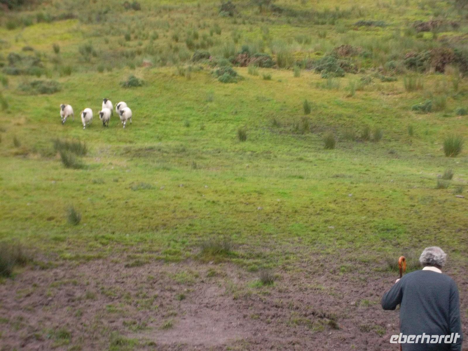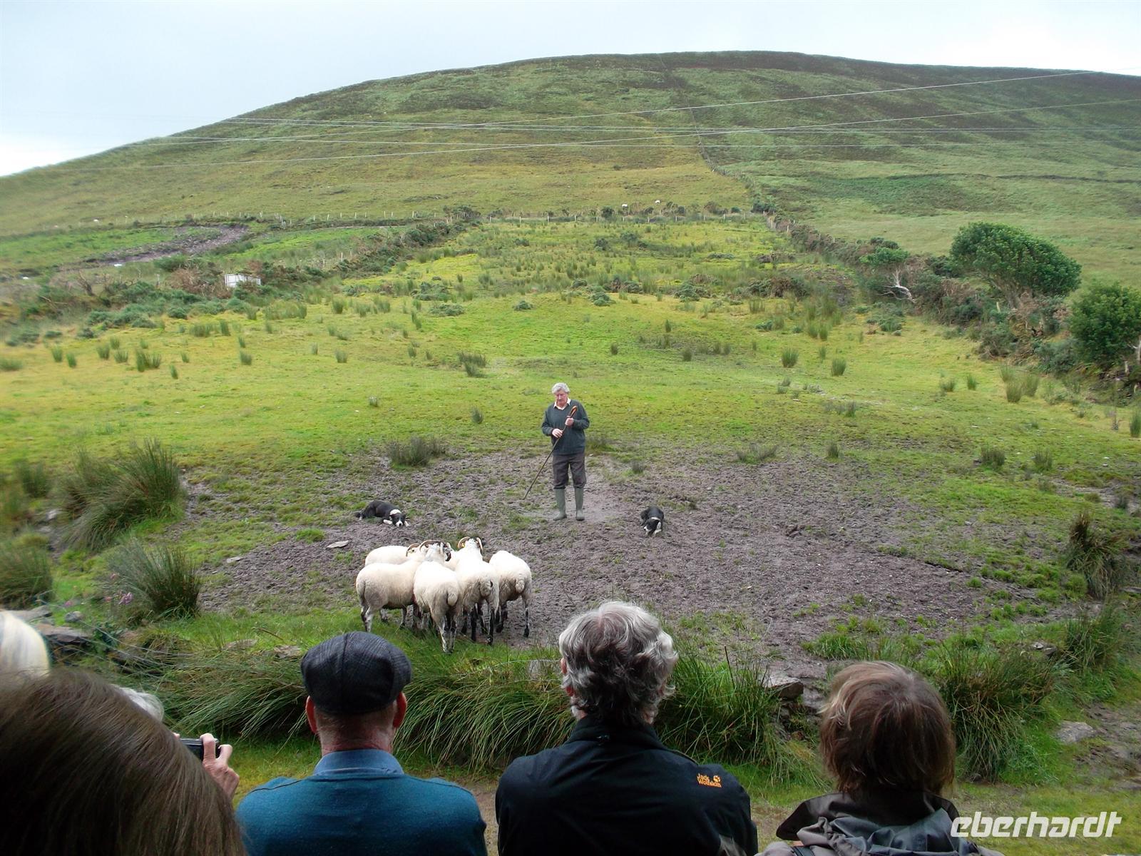 Vom „Red Fox Inn“ war es nicht weit zum Schäfer Brrendan. Der ist inzwischen fast eine Legende und seine Schafshow meist überfüllt. Dieses Mal war es etwas anders, er hatte eigentlich frei, aber die Chefin vom Pub nebenan hat ihn für uns herbeigerufen und uns gleich noch ihren Pub und ihren Souvenirladen geöffnet. Ein wenig später kam Brendan dann doch und zeigte uns sowie den Gästen aus einem noch hinzugekommenen englischen Bus, wie man mit Hunden arbeitet und Schafe zusammentreibt. Brendan erklärte Ruf.- und Pfeifsignale und die Spezialitäten beim Arbeiten mit Schafshunden, die alle zur Rasse der Bordercollies gehören.