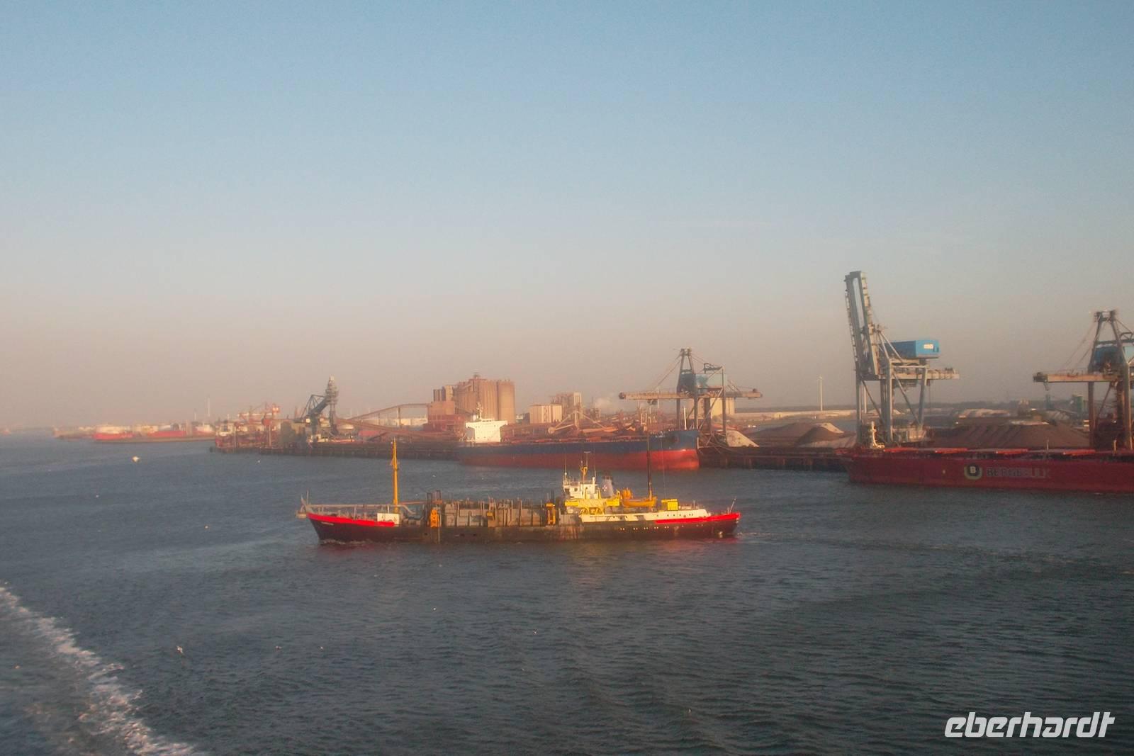 Quer durch Deutschland und anschließend die Niederlande ging es am heutigen ersten Reisetag bis zum Europoort Rotterdam. Um die weit über 800 Kilometer bis zu Europas größtem Hafen von Dresden aus zurückzulegen, muss man schon den ganzen Tag im Bus sitzen! An mehreren Abholstellen, gebracht vom zuverlässigen Eberhardt-Haustürtransfer wurde der 5-Sterne-Reisebus, gesteuert von Buschauffeur Andreas Marx, in Sachen und dann Thüringen immer voller - 28 Reisende begleiteten uns schließlich durch Hessen, das Ruhrgebiet, und das Nachbarland Holland. Pünktlich vor 19.00 hatten wir den Fähranleger im Europoort von Rotterdam erreicht. Weitere acht Mitreisende würden wir am nächsten Abend in Dublin zu uns stoßen, sie hatten die „Abkürzung“ per Flug gewählt-