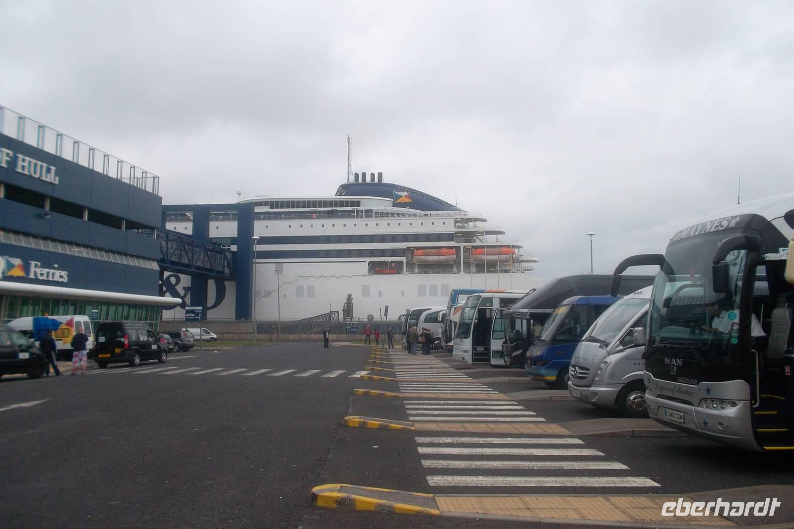 Europas größter Hafen beeindruckt bereits durch die Dutzende Kilometer langen Anlagen des Container- und des Ölhafens., die zusammen fast 10.000 Kais, Molen und Anleger erreichen. Für uns wichtig war und ist hier der „Haven 5805“, denn hier liegt die gewaltige P & O-Fähre nach Kingston-upon-Hull. Nach dem Eichecken betraten wir das Schiff „Pride of Hull“. Um in den komfortablen, aber recht kleinen Kabinen keine Probleme zu bekommen, waren alle mit einer „Nachttasche“, ausgesucht kleinem Fährgepäck, ausgerüstet, Gute und komfortable Kabinen und als Höhepunkt ein Abendessen vom reichhaltigen Buffet erwarteten uns. Überpünktlich legte das Fährschiff mit einem beeindruckenden Wendemanöver ab.
