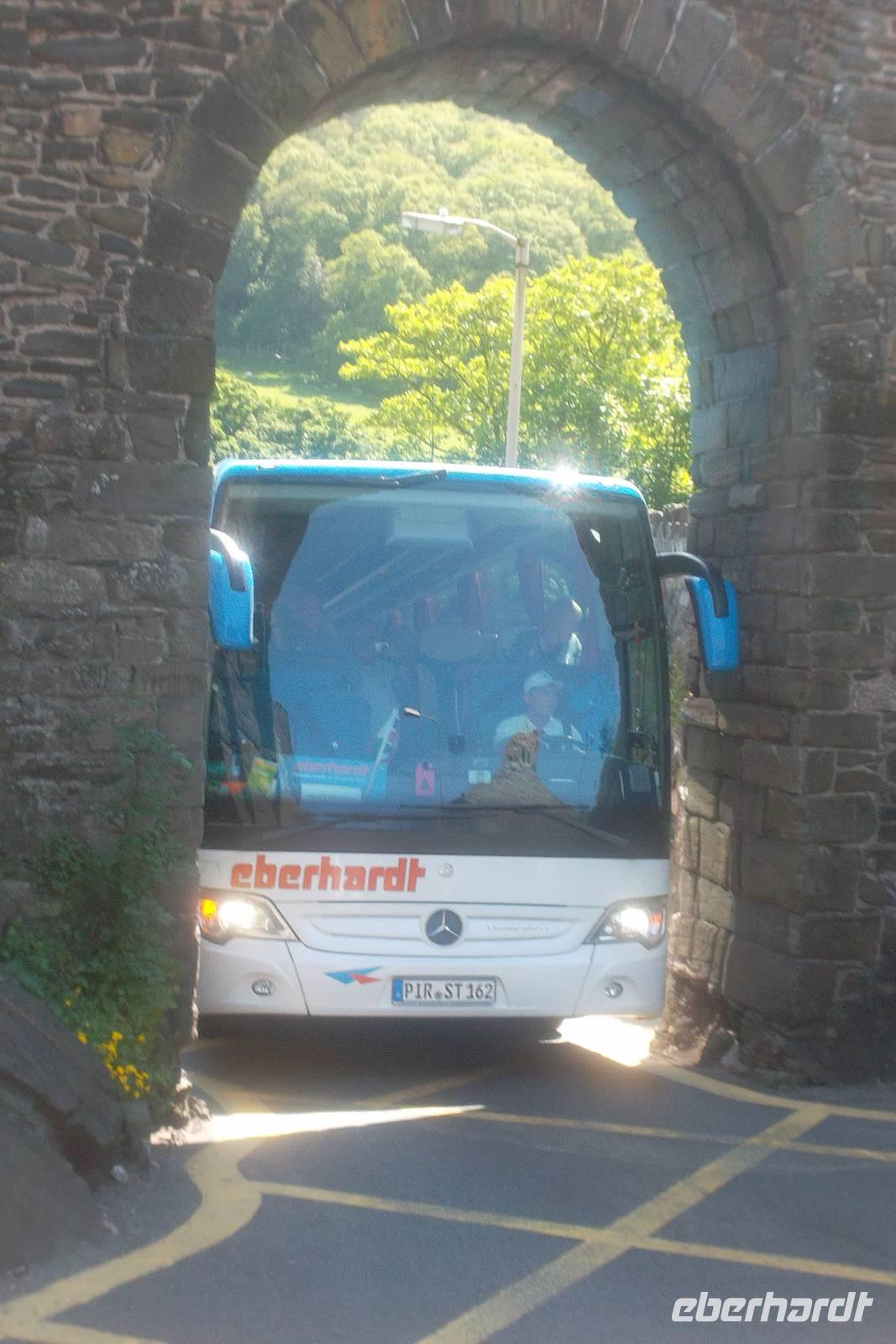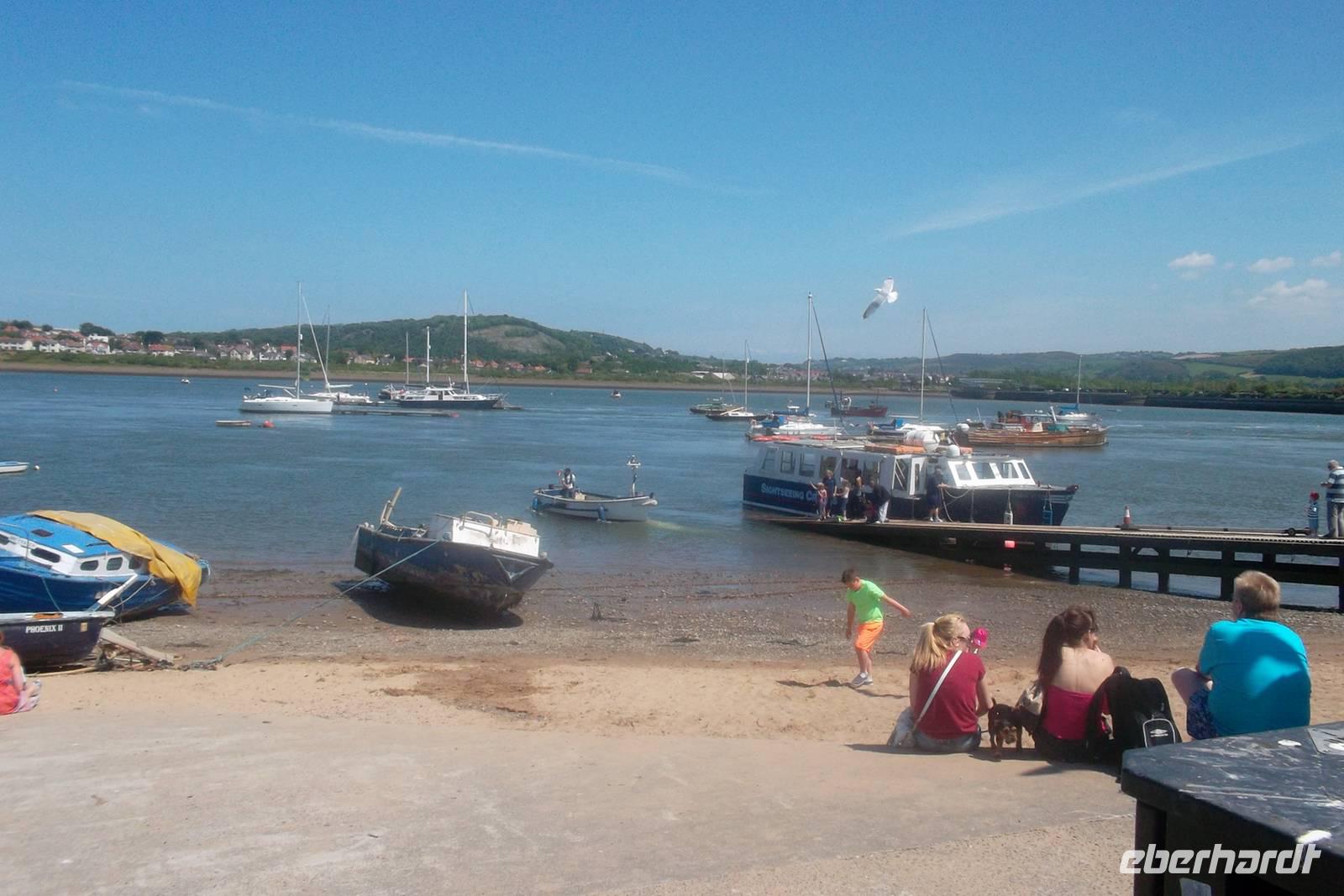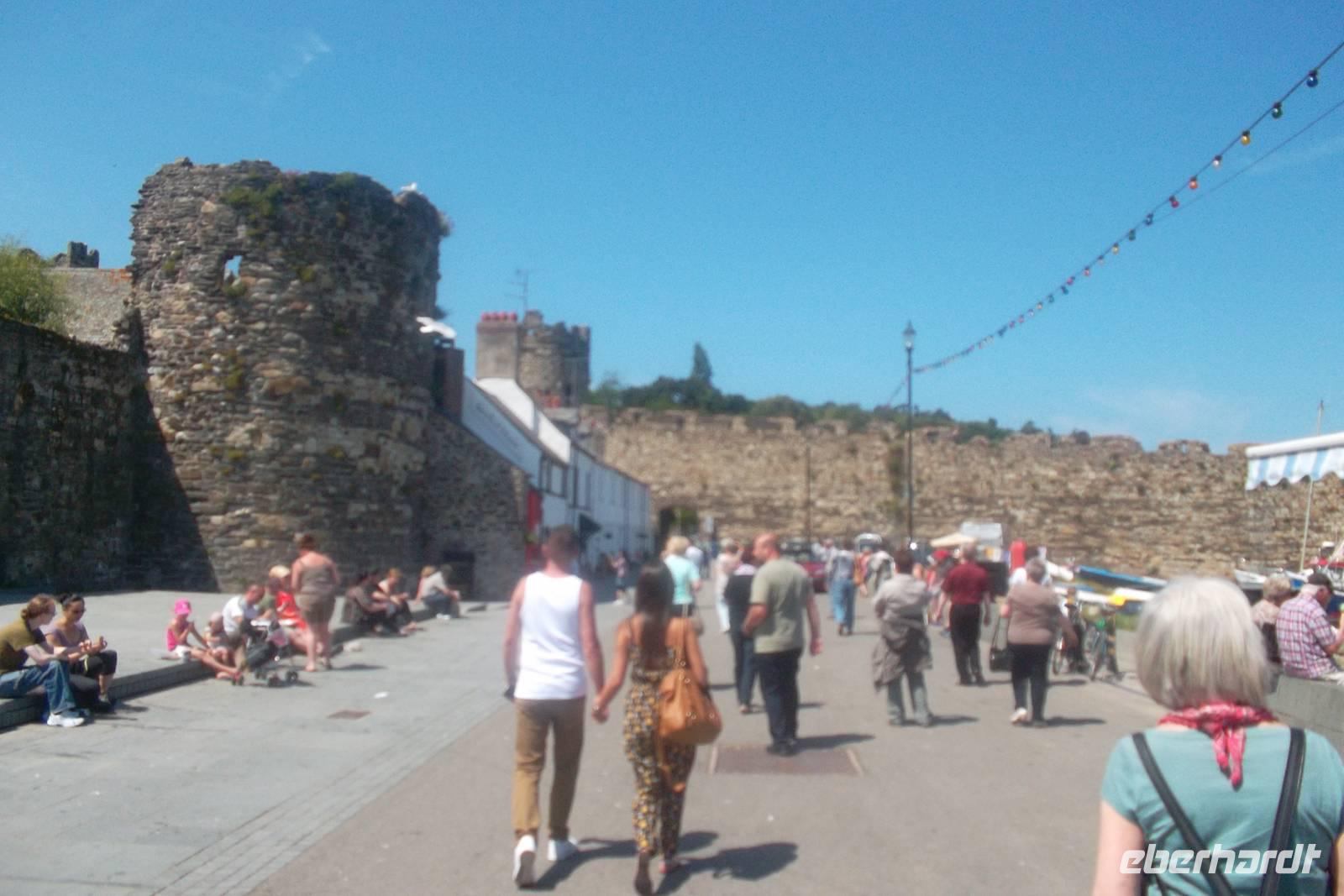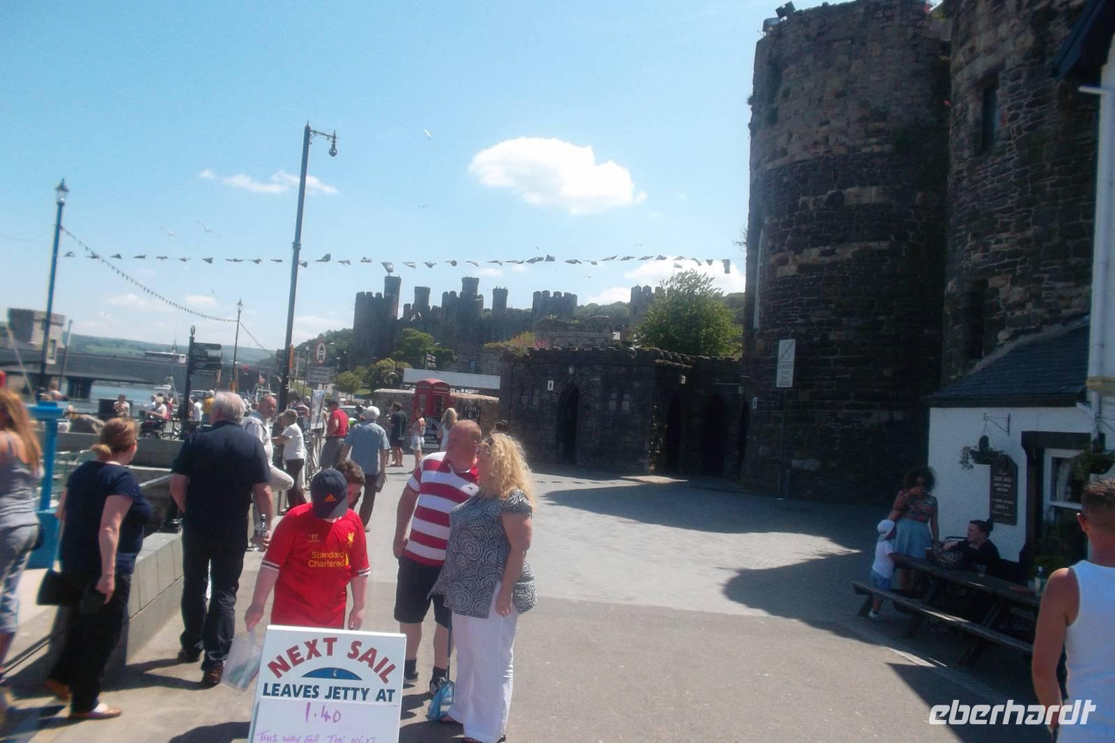 Sehr pünktlich am nächsten Morgen erreichte das Schiff Kingston upon Hull. Wie immer dauerte das Ausschiffen einige Zeit, denn Großbritannien ist dafür bekannt, dass man es mit den Grenzkontrollen hier sehr genau nimmt. Etwa 08.45 Uhr Ortszeit waren wir dann aber alle im Bus und durchquerten zunächst Hull und dann Mittelengland und Wales. Abwechslungsreiche Fluss- und Tallandschaften, die Industriegebiete um Leeds, Manchester und Liverpool begleiteten uns. Da wir bis zur Fähre nach Irland am Nachmittag noch etwas Zeit hatten, konnten wir ein kleines „Richtig-reisen-Extra“ einbauen. Der eigentlich geplante Halt in Chester wurde von mir abgebrochen, da in der englischen Fachwerkstadt gerade an diesem Tag die jährlichen Pferderennen stattfanden und wir vor Stau gar nicht ins Zentrum gelangen konnten. Aber die Auswahl an Sehenswertem an der Strecke ist reich und so fuhren wir noch etwas weiter und hielten stattdessen im walisischen Conwy. Von der von Edward I. im 13. Jh. gegründeten Stadt ist noch die etwa 1,5 km lange Stadtbefestigung mit beeindruckenden 21 Türmen erhalten. Die wuchtige Ruine einer der größten Burgen in Großbritannien spielte eine wichtige Rolle in der Geschichte und sorgte auch dafür, dass im späten 15. Jahrhundert das walisische Geschlecht der Tudors auf den britischen Thron gelangte. In Conwy hatten wir nun eine gute Stunde zum Bummeln und konnten uns einen schönen Eindruck von einer walisischen Kleinstadt verschaffen.