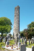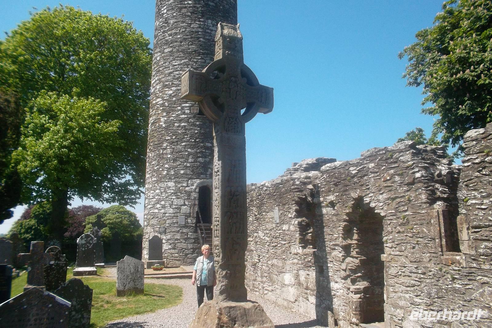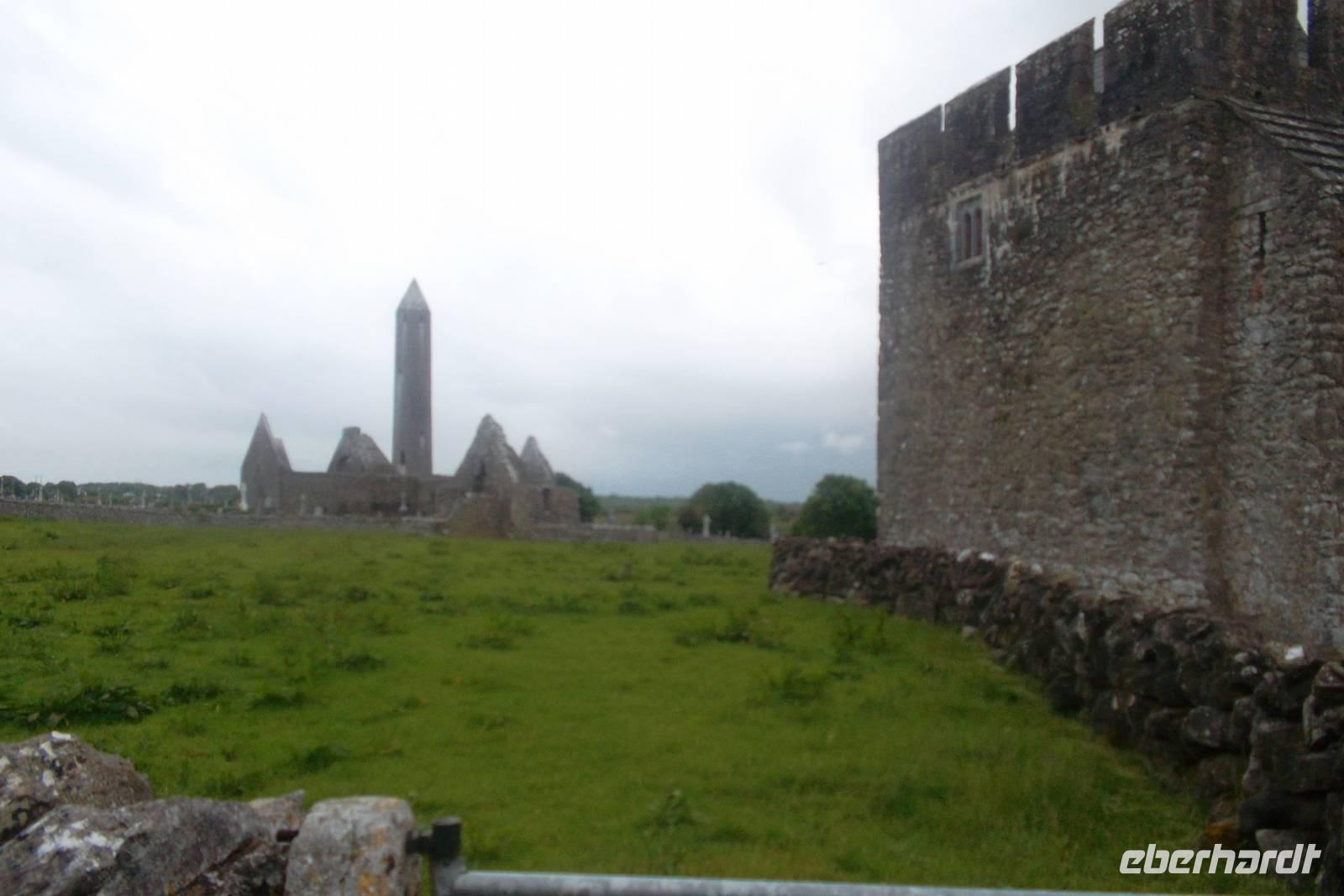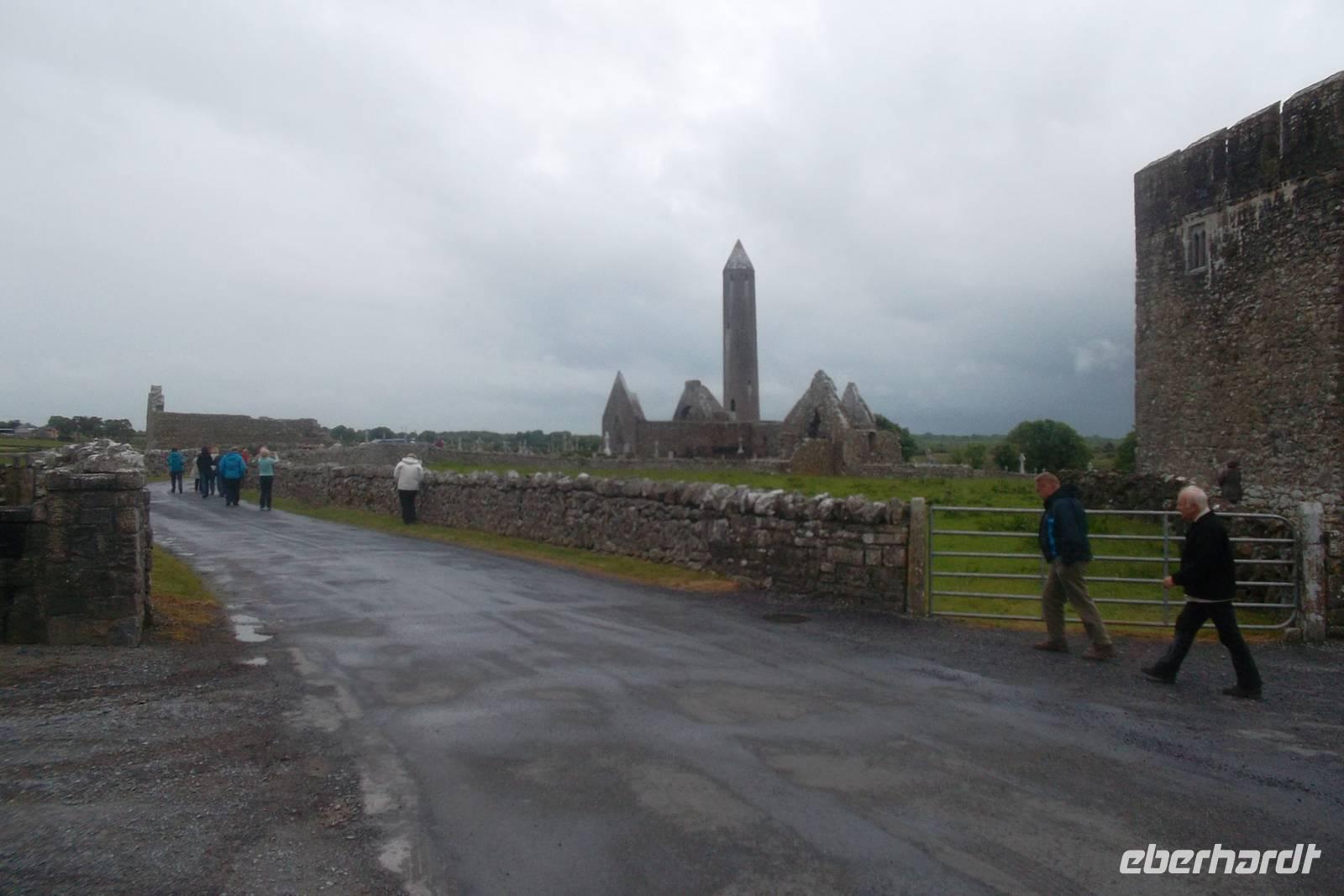 Nahe unserem Übernachtungsort Gort liegt die alte Klostersiedlung Kilmacduagh, und war im Wechsel mit dem nahen Kilfenora noch bis 19. Jahrhundert hinein sogar Bischofssitz. Davon zeugen noch zahlreiche gut erhaltene Kirchenruinen - Reste z.B. der Kathedrale und der alten Abts-Burg. Typisch für Irlands Klöster waren Rundtürme - und der von Kilmacduagh ist mit seinen 30 m Höhe und der Erbauerzeit aus dem 12. Jahrhundert einer der bestbewahrten in Irland.