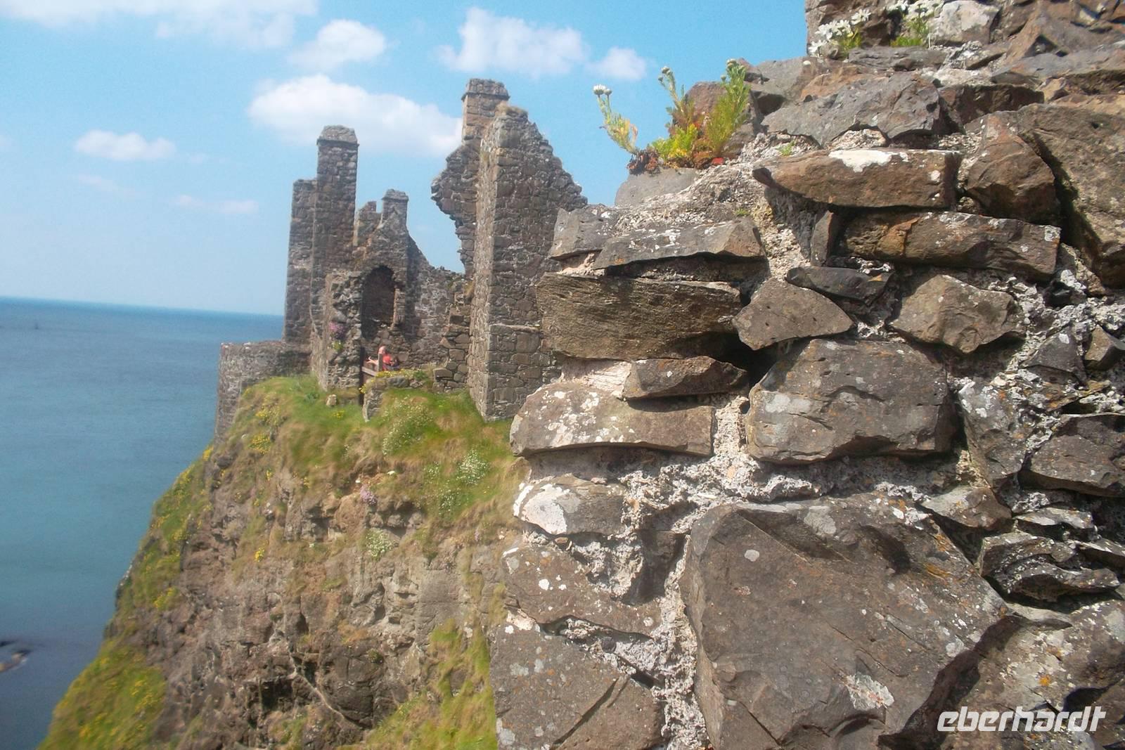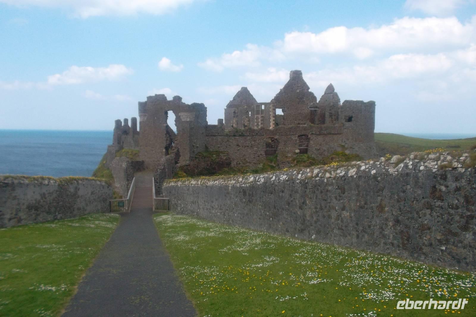Bevor wir zu unserem Tagesziel Derry fuhren, sahen wir uns aber als Extra noch Dunluce Castle auf einem Basaltfelsen über der Causeway-Küste an. Es ist gewiss eine der malerischsten Burgruinen in Nordirland mit bewegter Geschichte und gefährlicher Lage am Cliff. Das soll einem Teil der Burgbesatzung zum Verhängnis geworden sein, als 1639 ein Teil der Burg samt Personal ins Meer rutschte.