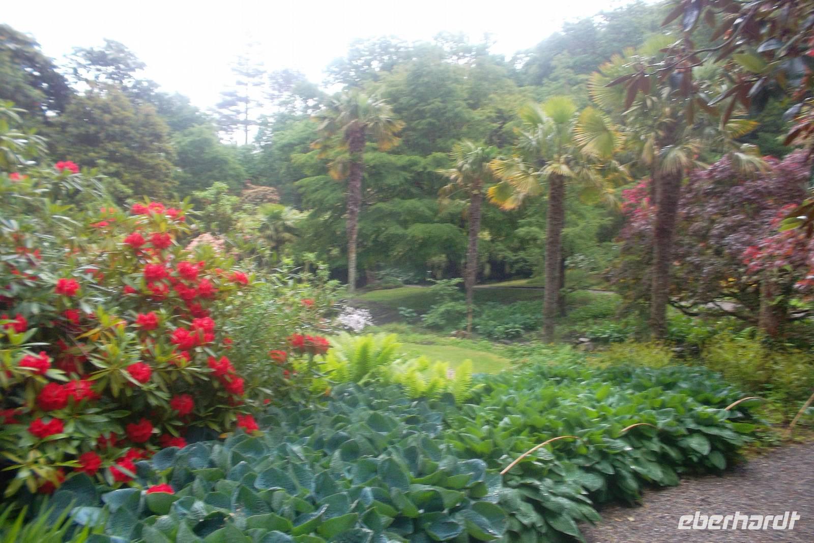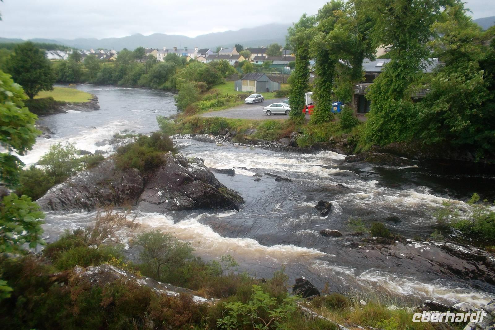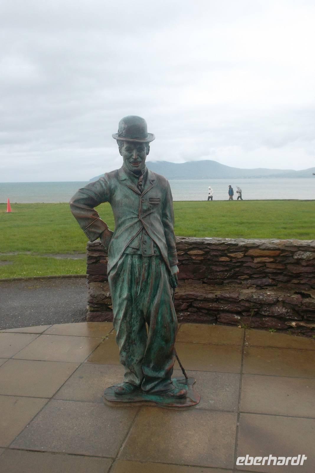 Die Tour rund um Kerry fand ihre Fortsetzung mit einem Toiletten- und Fotostopp in Waterville. Das dies ein bevorzugter Ferienort des Komikers Charlie Chaplin war, hat man ihm hier ein Denkmal errichtet. Über den Coomakesta Pass - bei schönem Wetter hat man von ihm einen herrlichen Blick auf zwei verschiedene Küstenszenerien, wird aber vom Wind fast weggeweht - fuhren wir zu einem weiteren Stopp in Sneem, einem Städtchen vor den MacGillicuddy Reeks, in dem ein kleiner Wasserfall zu Tal rauscht. Wir vollendeten dann den Ring of Kerry bei immer schlechterem Wetter, in dem selbst der legendäre „Ladies View“ über die Seen von Killarney im Nebel versank und kehrten nach einem letzten Stopp im Park von Muckross House bei Killarney nach Tralee zurück.