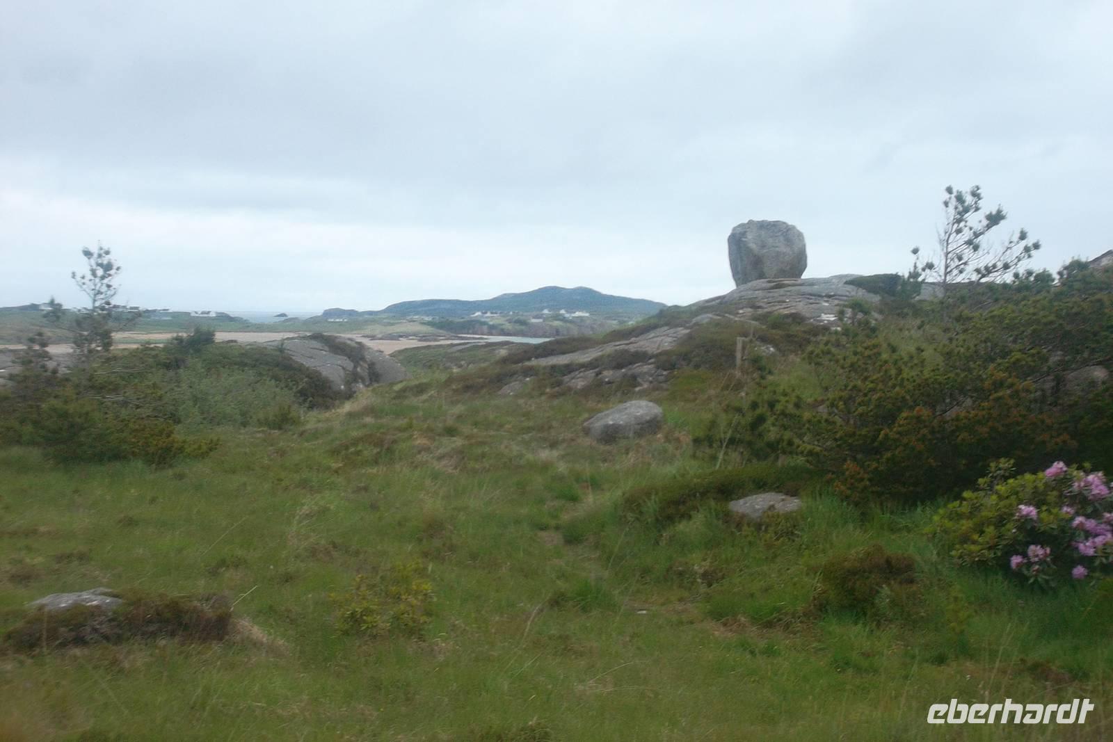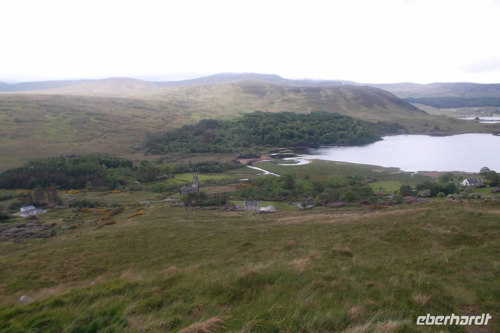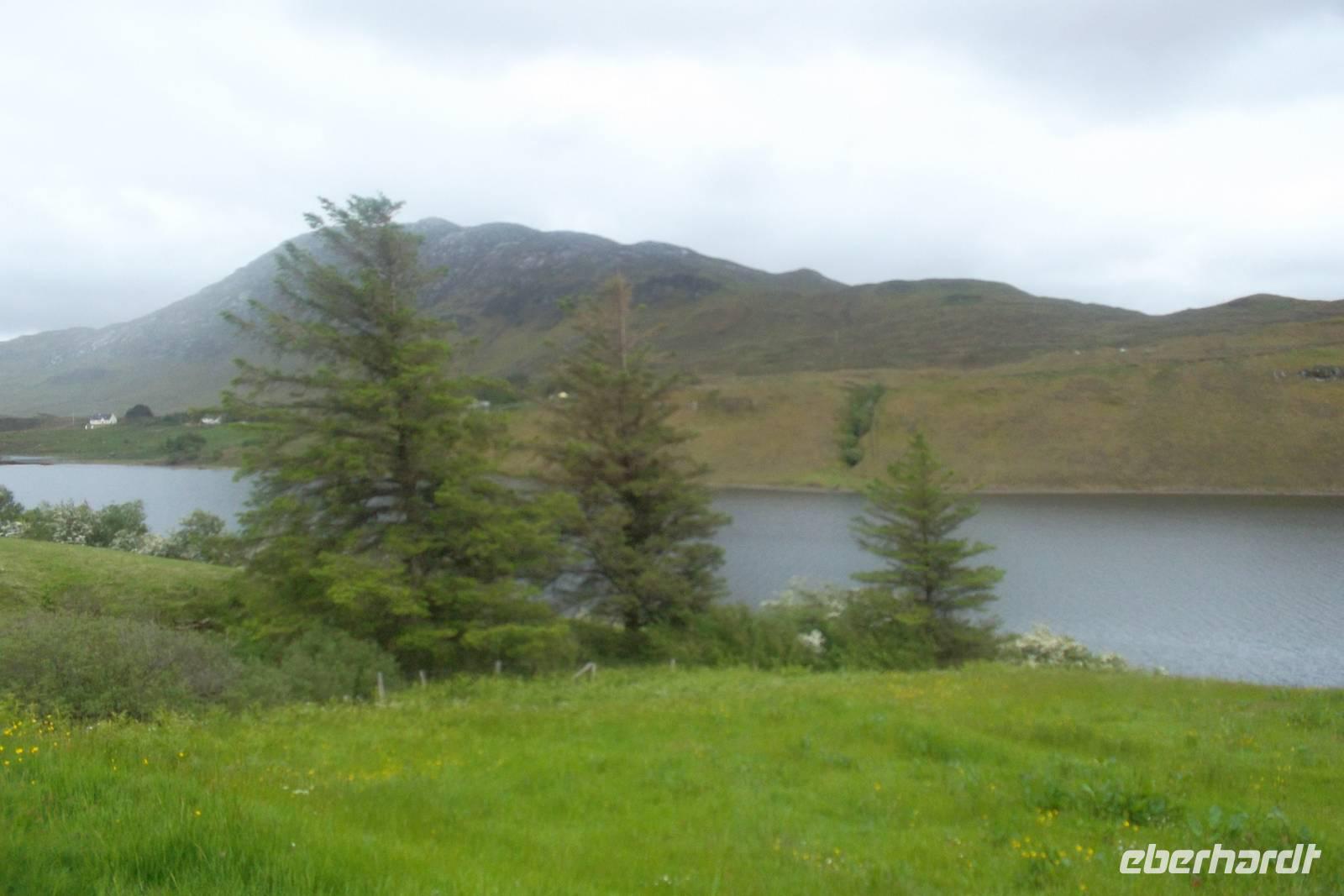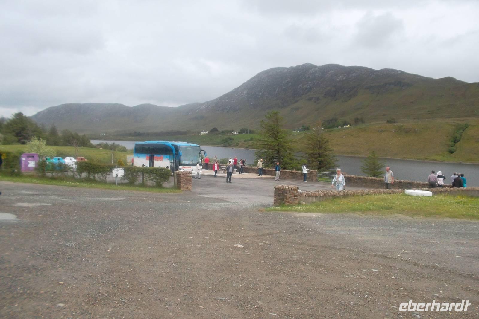 Ein fakultativer Ausflug in den Glenveagh Nationalpark stand heute auf dem Programm und nahezu alle Reisenden nahmen daran teil. Die Tour in eines der idyllischsten Täler im Norden Irlands führt am legendenumwobenen Gartan-See vorbei und in den heutige Nationalpark. Er entstand durch das mitleidlose Handeln eines Landspekulanten Mitte des 19. Jahrhunderts, der etwa 250 Pächter aus dem Gebiet vertrieb, um selbst Viehzucht zu betreiben und ein Schloss zu erbauen. Er hatte die ganze Gegend aufgekauft, zum „Glenveagh“ („Tal des Lebens“) zusammengefasst. Sein Name war John George Adair und er ließ 1867 mit dem Bau von Glenveagh Castle beginnen, das 1873 fertig gestellt wurde. Ein späterer Besitzer, Mr. McIlhenny, ließ im 20. Jh. von Fachmann Jim Russell den Garten umgestalten und verkaufte 1975 seinen Besitz an den Irischen Staat. Das Schloss kann heute mit der gesamten Einrichtung im fast ursprünglichen Zustand besichtigt. Glenveag ist der größte von sechs Nationalparks in Irland- Mit 16.550 Hektar Größe seiner Lage nahe dem Mount Errigal und dem Slieve Snacht hat er die beiden höchsten Berge der Grafschaft Donegal zu Nachbarn. Wir sahen wie immer zuerst einen Film über Geschichte und Natur des Nationalparks und begaben uns dann mit den kleinen Park-Shuttlebussen zum Schloß. Nachmittags setzten wir unsere Fahrt zum Mount Erigal fort - der sich vornehm in Wolken hüllte - und erlebten mit mehreren Fotostopps die interessante Landschaft und die winzigen Dörfchen der Region „The Rosses“. Hier waren wir das erste Mal tief in der „Ghaeltacht“ jener traditionsreichen Gegend, die es Irland und Schottland gibt und in der noch überwiegend Gälisch gesprochen und geschrieben wird.