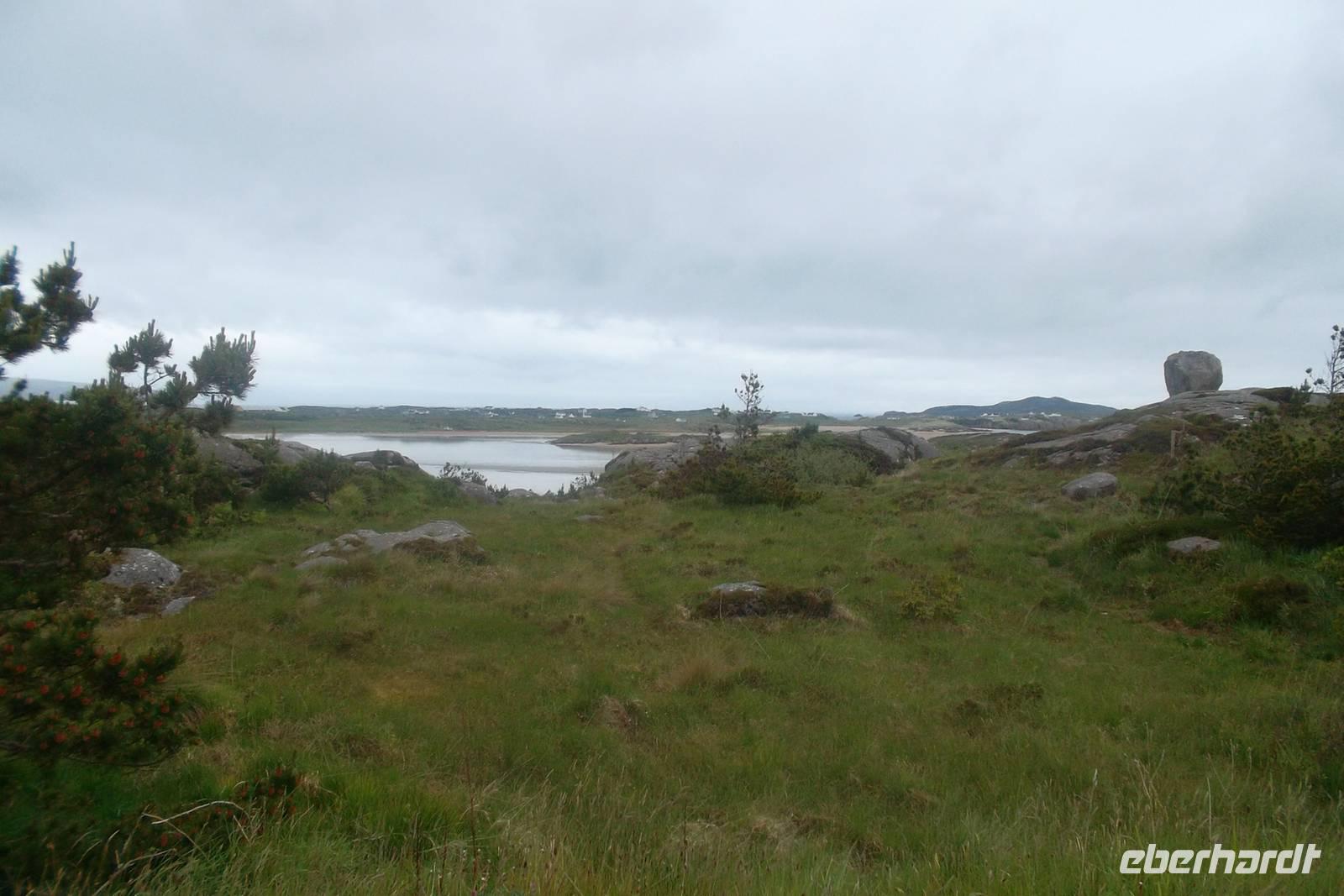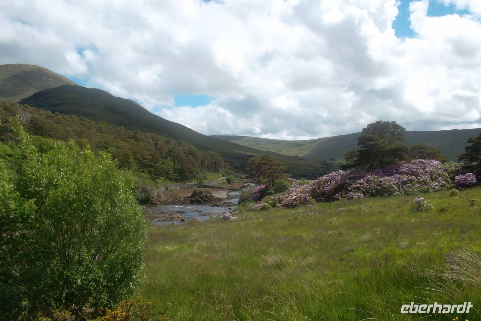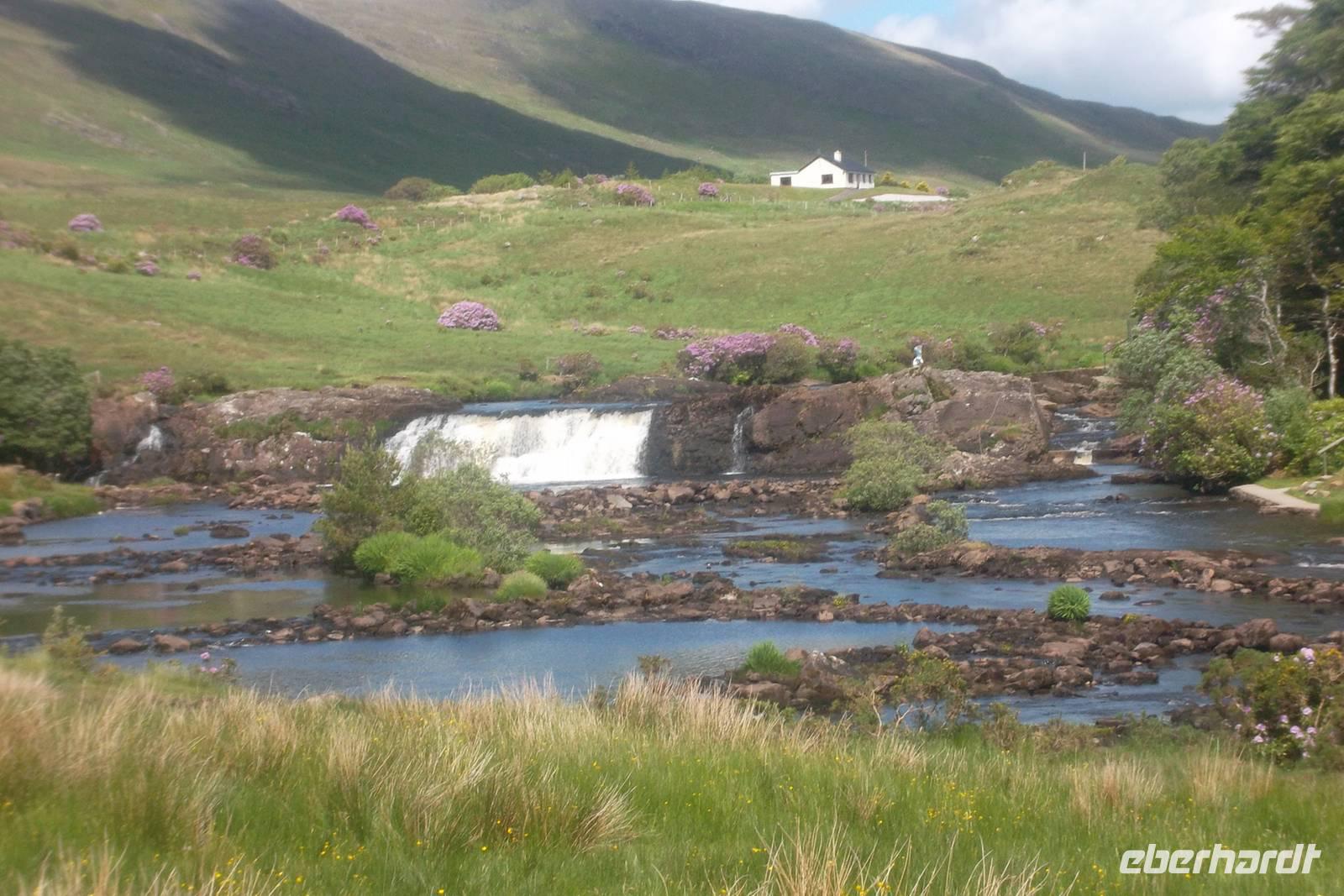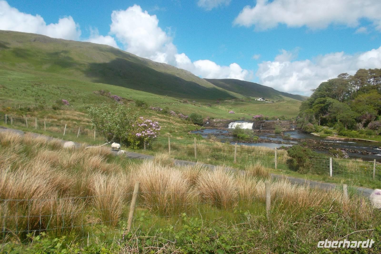 Nicht weit entfernt liegt Irlands einziger Fjord, Killary Harbour, an dessen Ende der kleine Fluss Erriff als Wasserfall „Aasleigh Falls“ kurz vor seiner Mündung höchst malerisch und fotogen ein paar Meter über die Felsen springt. Von hier machten wir uns auf die Heimfahrt, die mit einer Rundfahrt um die „Twelve Bens“ begann. Dieses nördliche Gebirge von Connemara erreicht 730 m Höhe am Berg Benbaum und bildet eine Art „Gegenstück“ zu den Maumturk Mountains, um die wir ebenfalls herumfuhren, bis wir zum letzten Stopp Maam Cross erreichten. Dies ist eine Kreuzung der wichtigsten Haupt-Straßen in Connemara und von hier vollendeten wir unsere Tour an Galway vorbei bis Gort, wobei wir dank der Kreuzung symbolisch am heutigen Tag eine große „Acht“ auf der Landkarte Connemaras gefahren waren und die ganze Halbinsel hatten entdecken können.