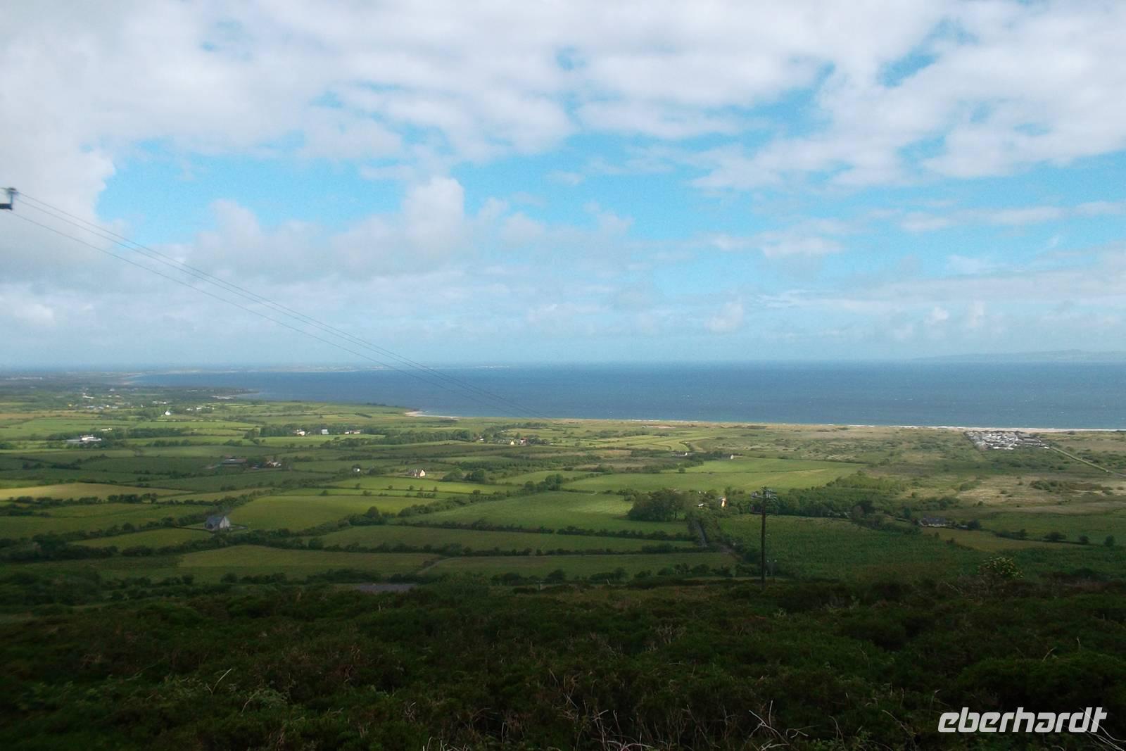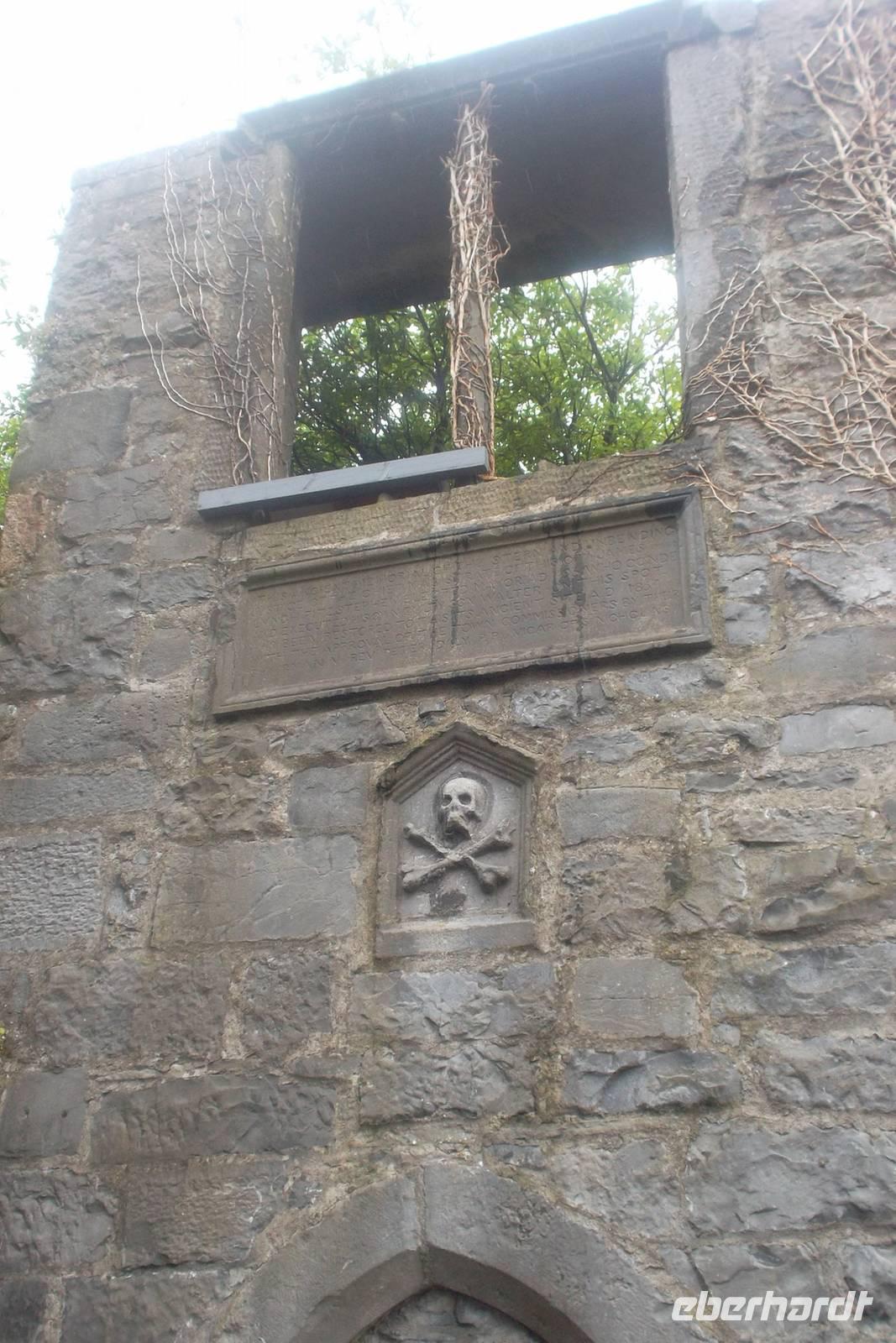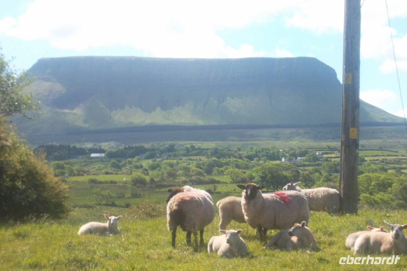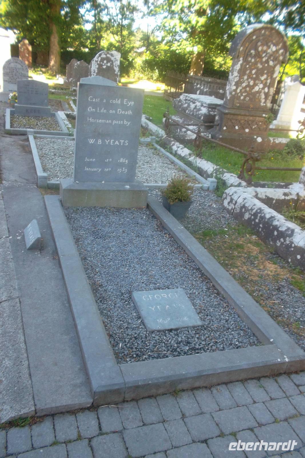 Durch die größte der einstigen Grafschaften von Ulster, Donegal, fuhren wir in die Küstenregion. Nach einem Fotostopp am regelmäßigen Tafelberg Benbulben, dem Wahrzeichen der Grafschaft Sligo, gönnten wir uns eine Pause in Drumcliff. Der kleine Ort nördlich der Grafschaftshauptstadt Sligo ist so etwas wie eine Wallfahrtsstätte, beherbergt doch der Friedhof neben dem Kirchlein das Grab des in Irland verehrten Dichters William Butler Yeats. Der hatte als Staatsmann und Senator der jungen irischen Republik großen Einfluß auf das Wiedererstarken keltischer Tradition und Sprache in Irland und gilt als einer der Begründer der irischen Literatur und des irischen Theaters.